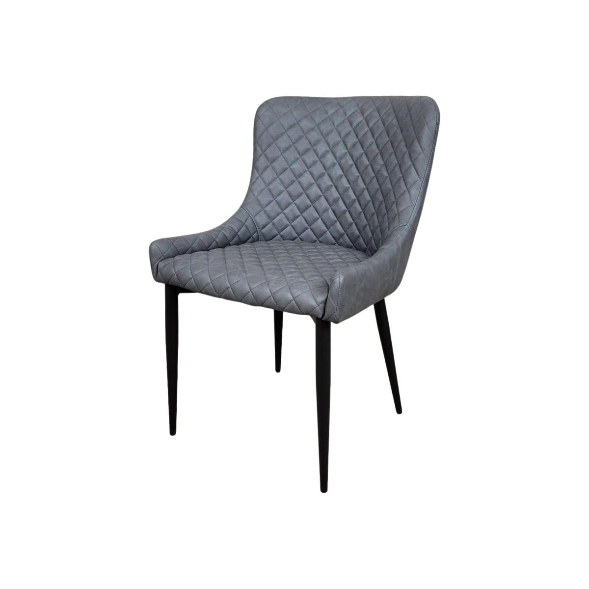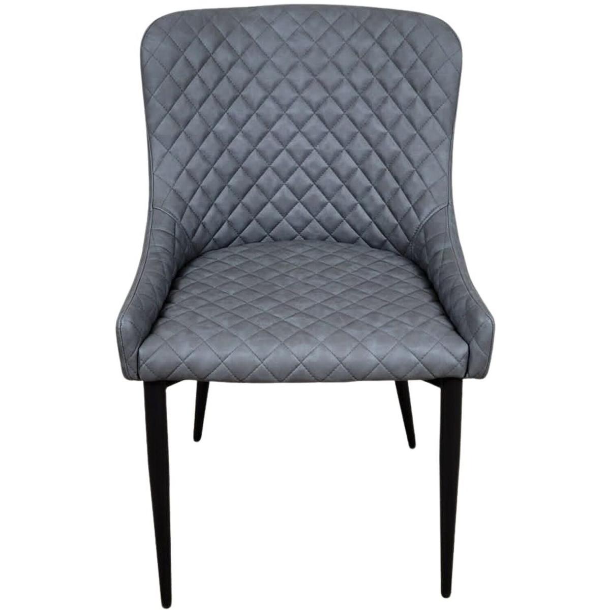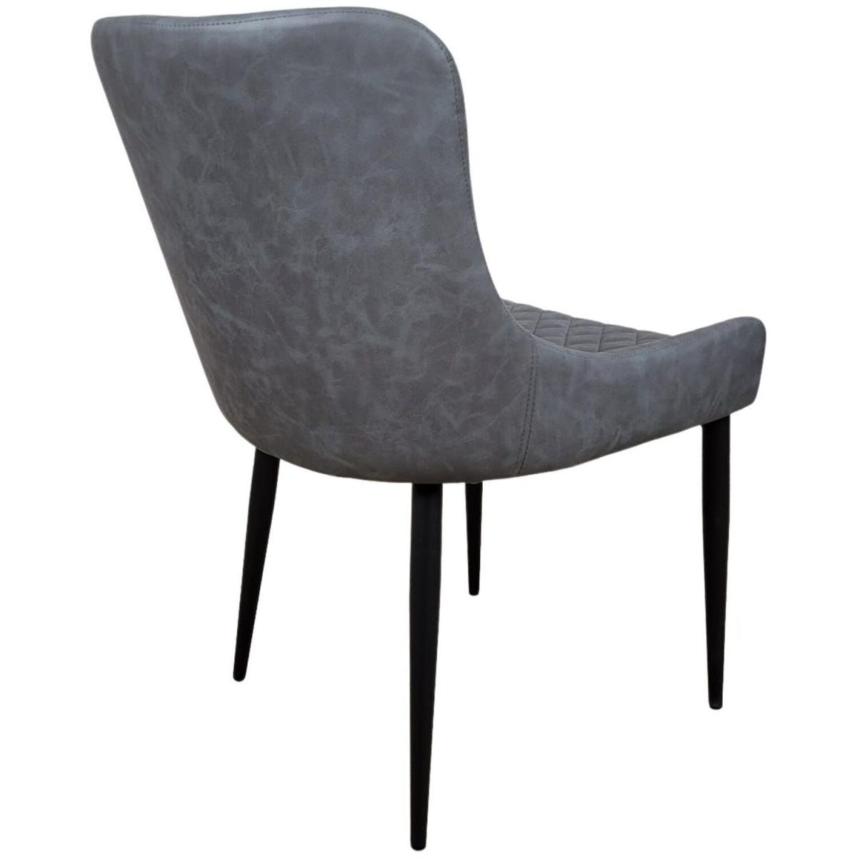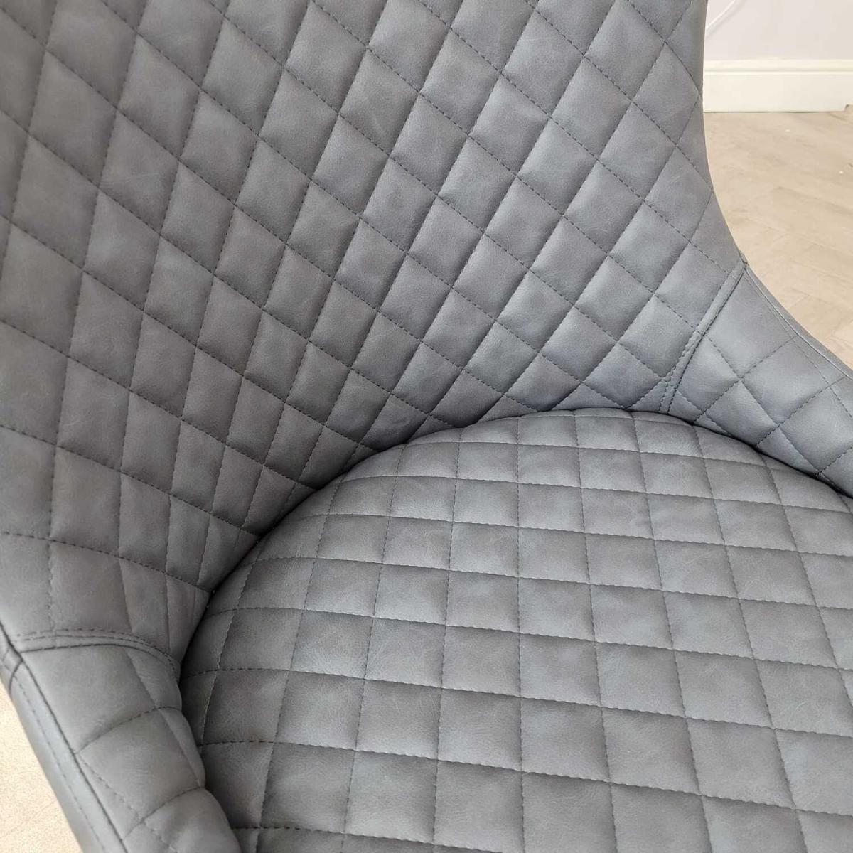 Upholstered in a high-quality grey distressed PU leather giving it a quality authentic feel and durability. The grey leather effect is distressed to add to its authentic industrial and retro look. The scoop shape seat is quilted and curved to provide comfort and support and finished in a diamond stitch pattern. With its low curved arm the dining chair provides comfort whilst being practical to help push and store underneath the breakfast bar or kitchen island. The black metal leg frame offers a sturdy base and adds to the industrial style. The perfect addition to the home or ideal for bars, bistros, cafes, restaurants and pubs.