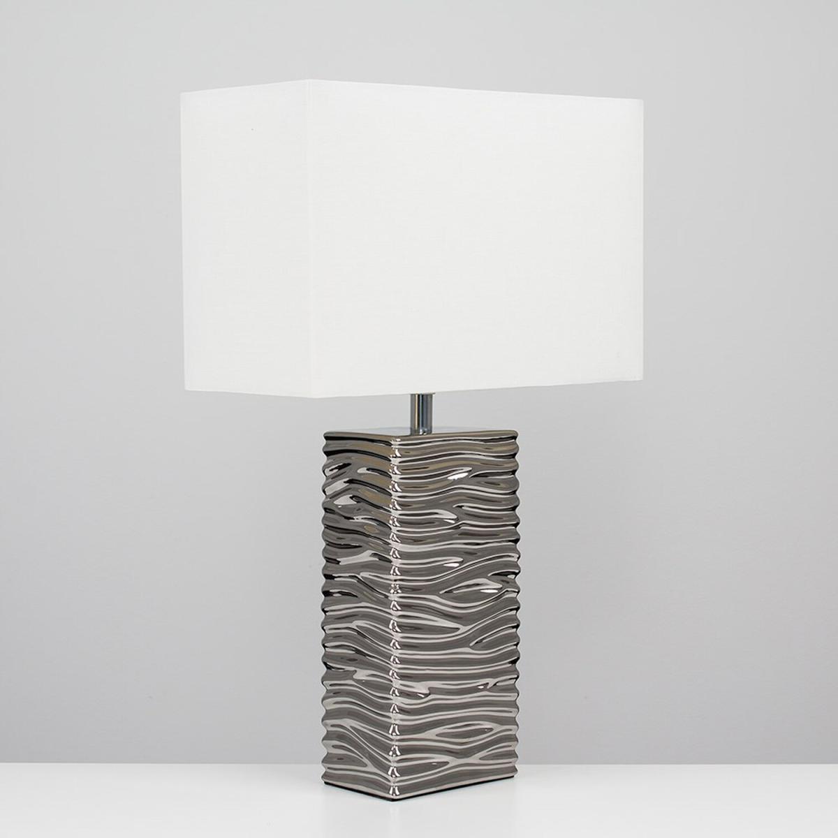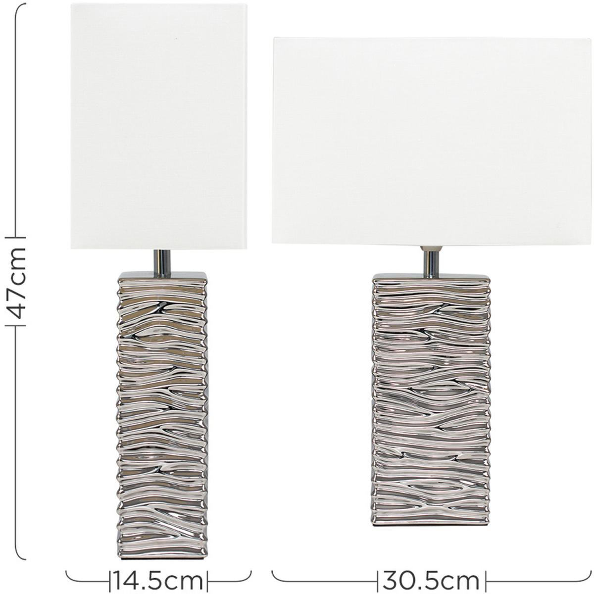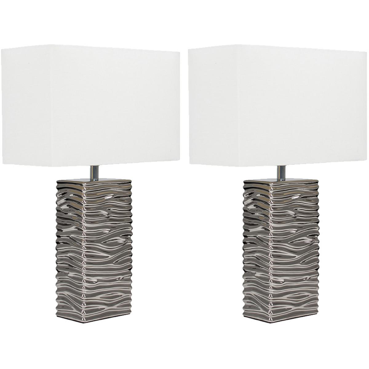 Pair of modern textured rippled effect table lamps in a silver ceramic finish. Complete with white fabric rectangular light shades. Features an in-line onoff switch for easy use. Ideal for use in lounges, hallways, bedrooms and other living areas. Table lamps are brilliant as complementary lighting and are perfect to light up dull corners.