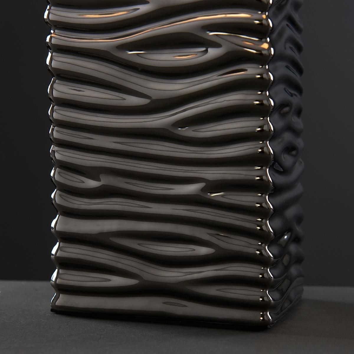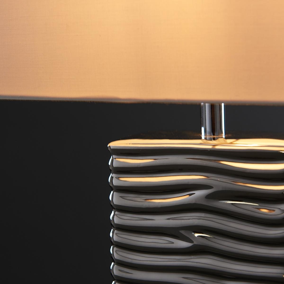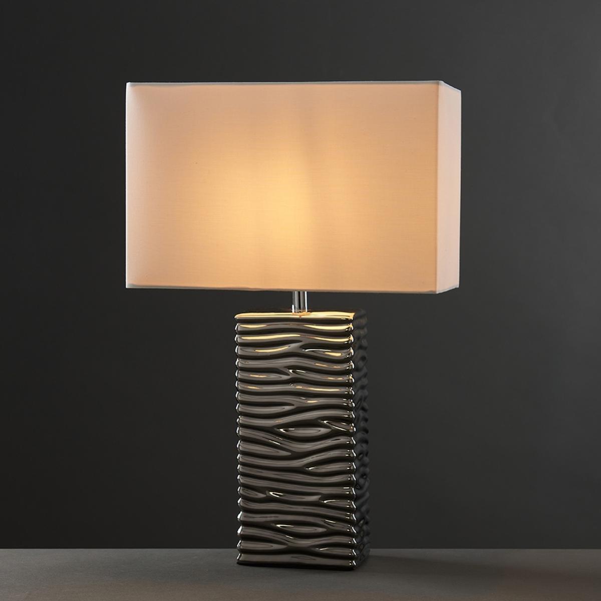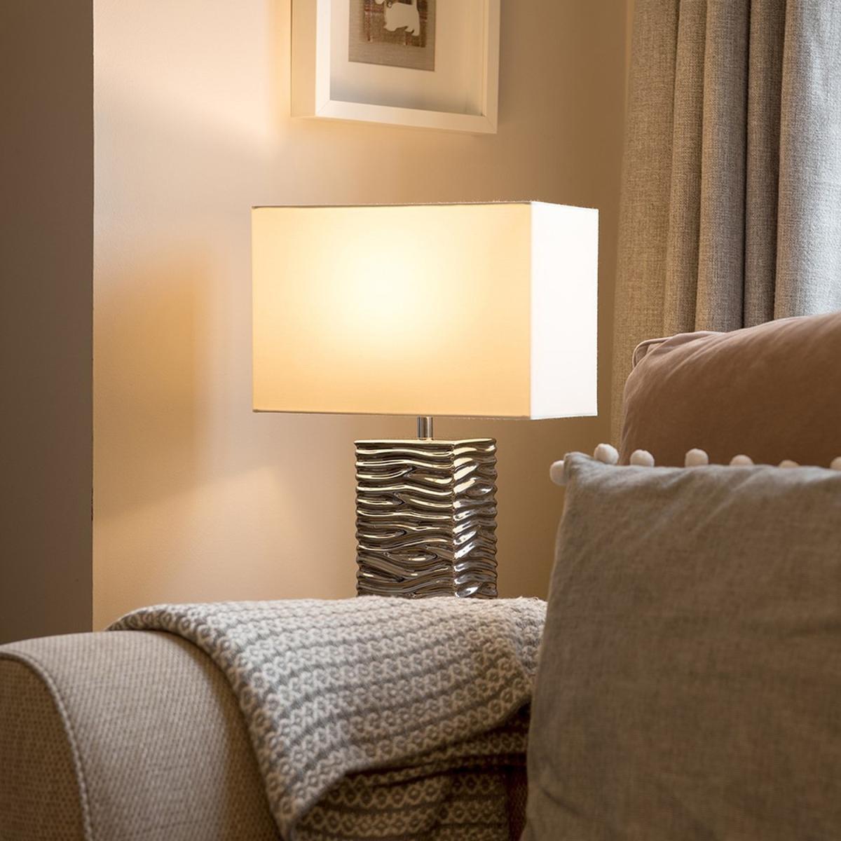 Pair of modern textured rippled effect table lamps in a silver ceramic finish. Complete with white fabric rectangular light shades. Features an in-line onoff switch for easy use. Ideal for use in lounges, hallways, bedrooms and other living areas. Table lamps are brilliant as complementary lighting and are perfect to light up dull corners.