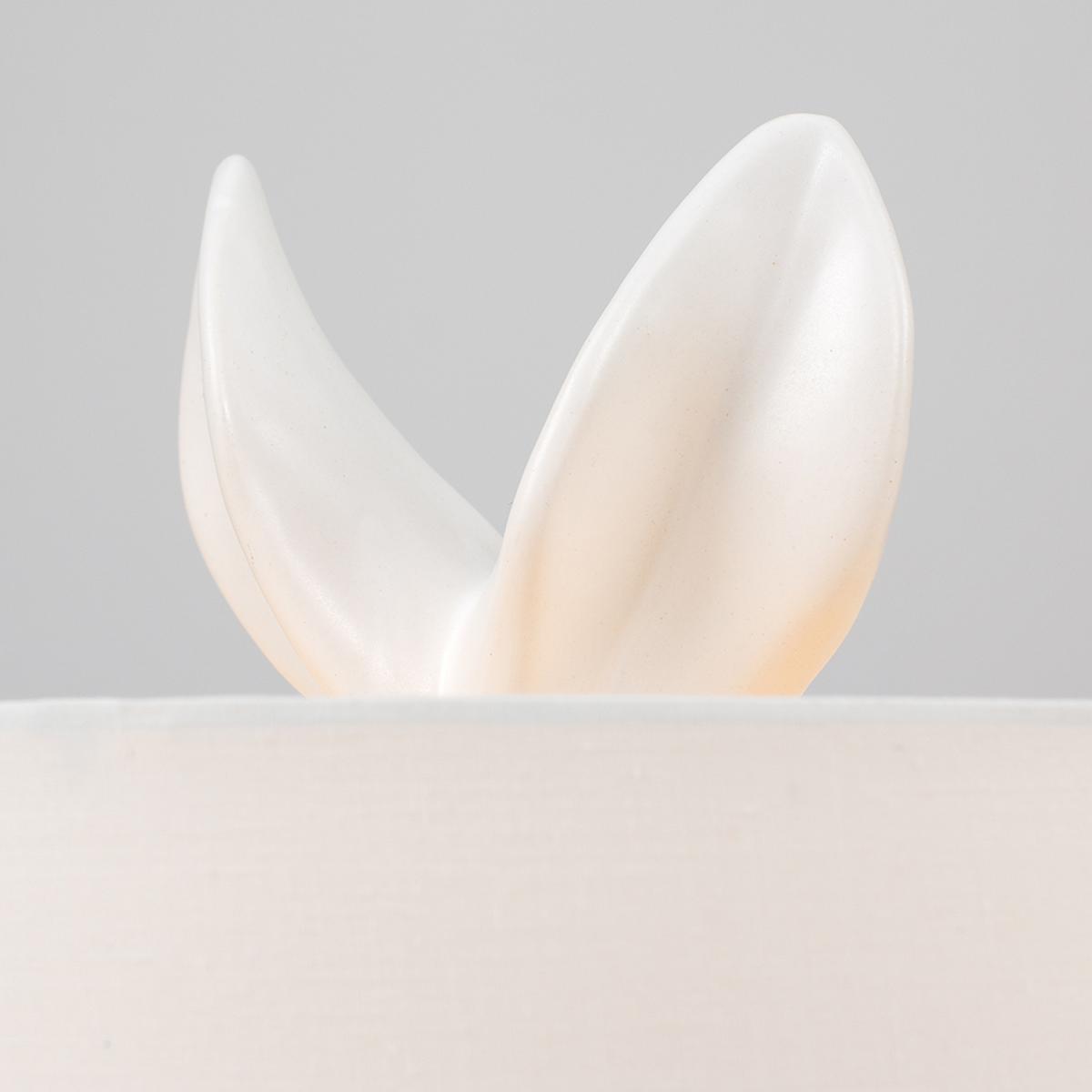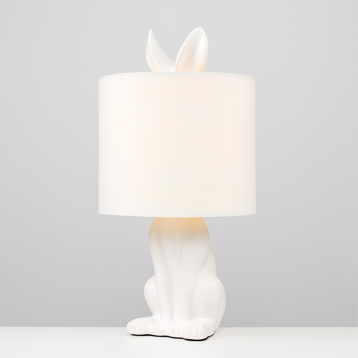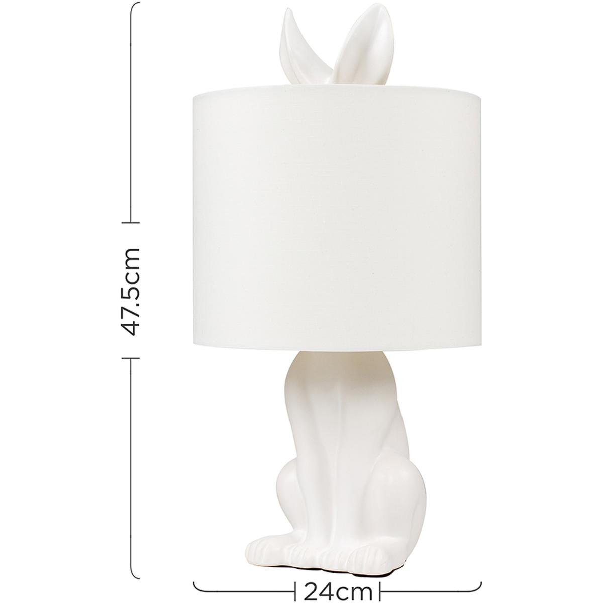 Pair of modern Rabbit Hare design table lamps in a white effect ceramic finish, complete with a white fabric cylinder light shades. Features an in-line switch for easy use. This lamp is a great way to add style and some extra light to a room. Ideal for lounges, bedrooms and other living areas.