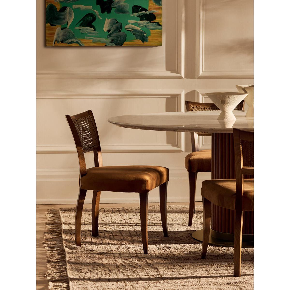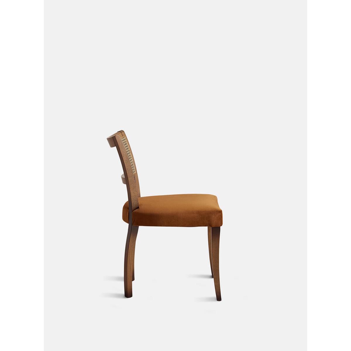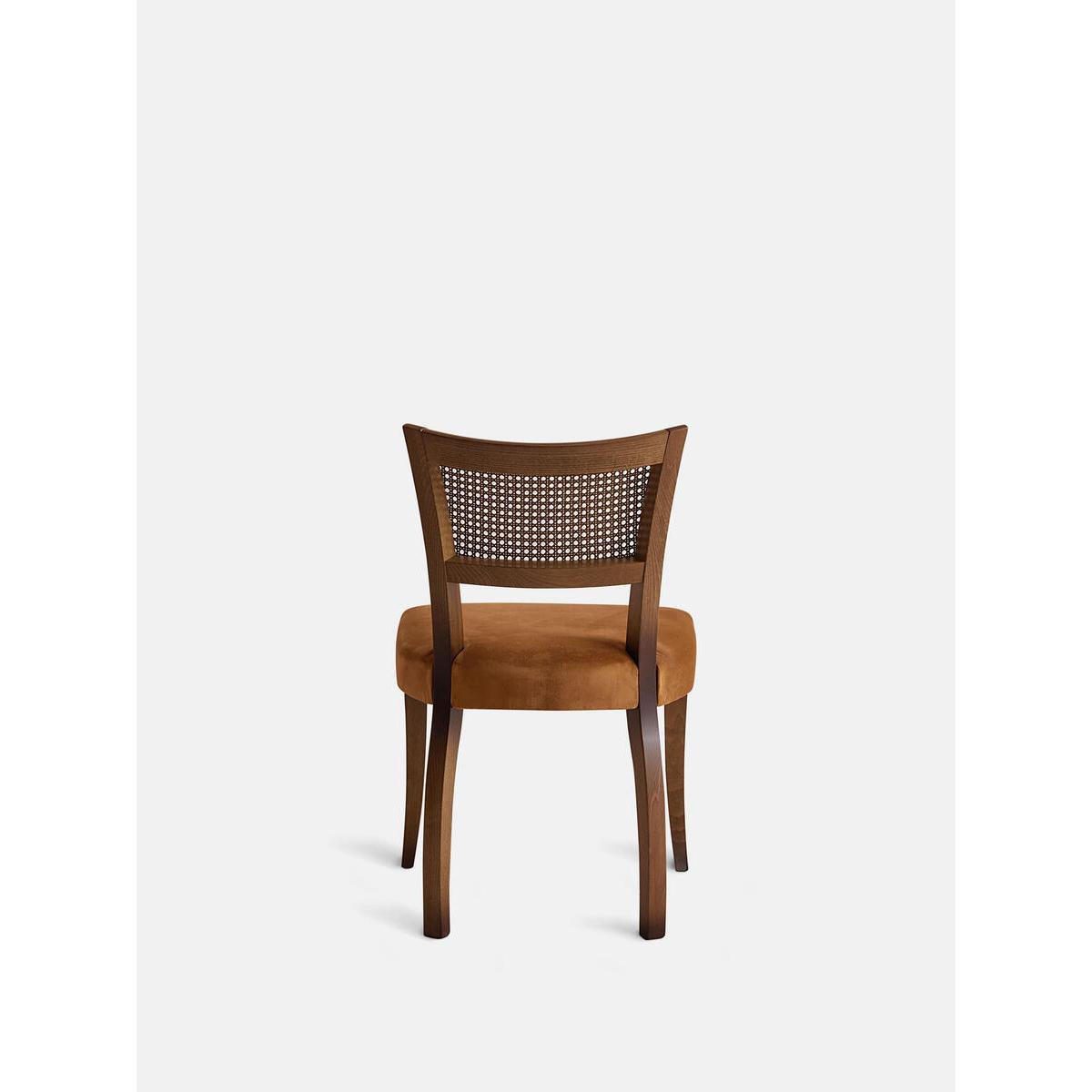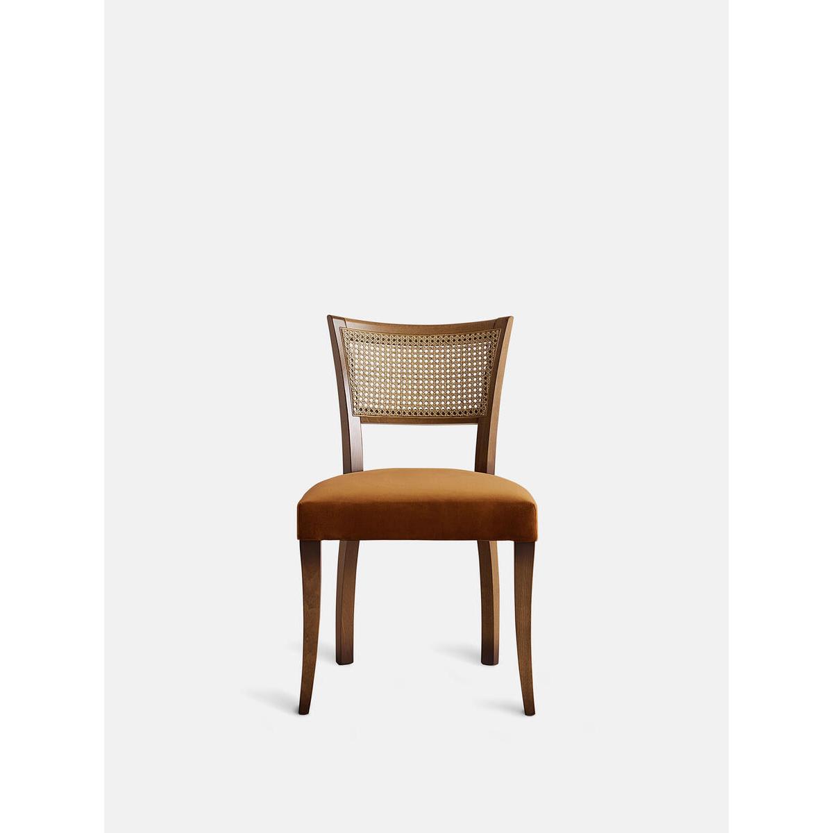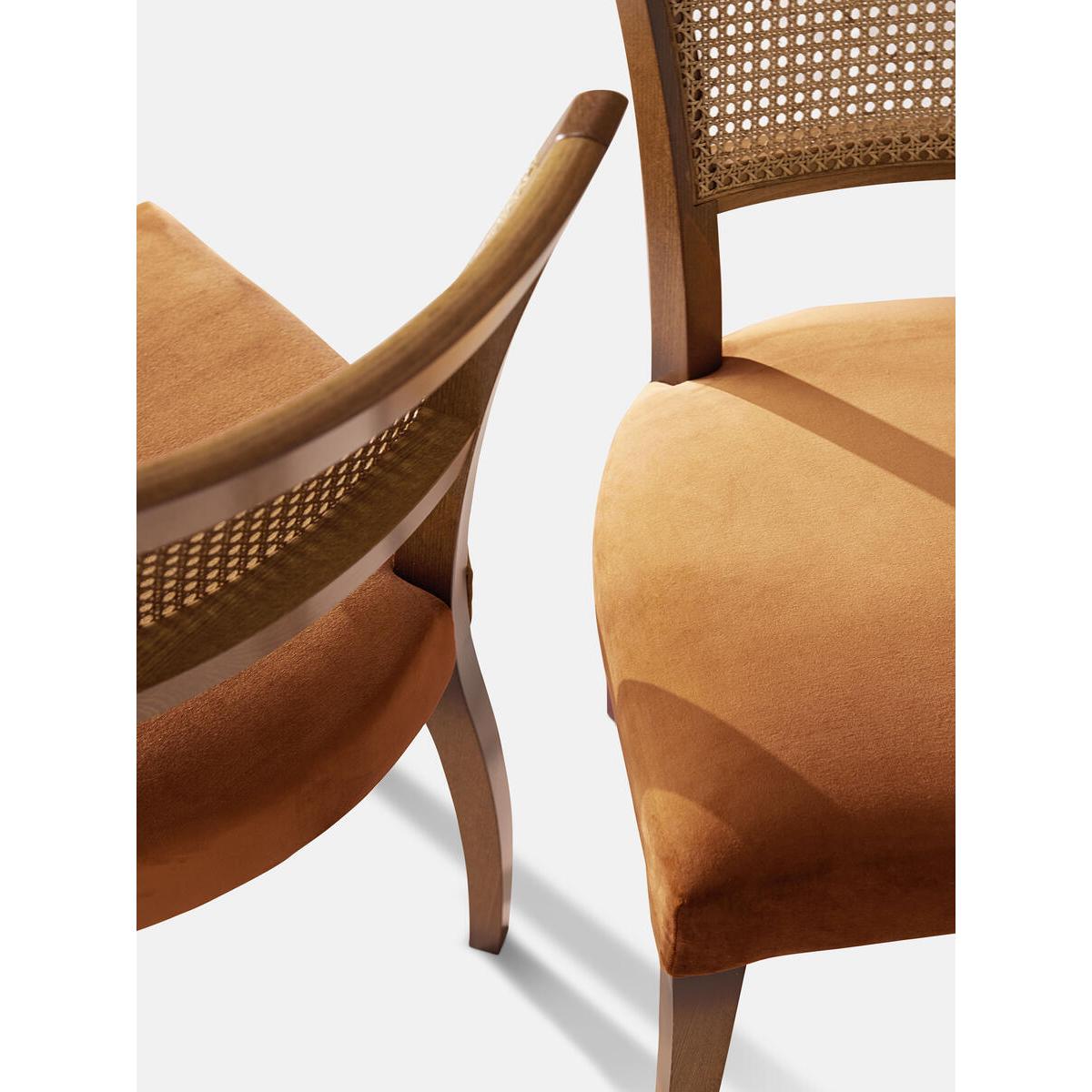 A House hero, you'll find our upholstered Molina dining chairs in many of our Houses, including High Road House and Soho House Berlin, as well as a vintage version in Kettner's Studio. This set is crafted in Italy with a cane back and velvet seat - a standout option for long lunches in the dining room. Dining chairs with cane back Hardwood beech frame Curved wooden arms Velvet seat Inspired by the vintage dining chairs at Kettner's Studio