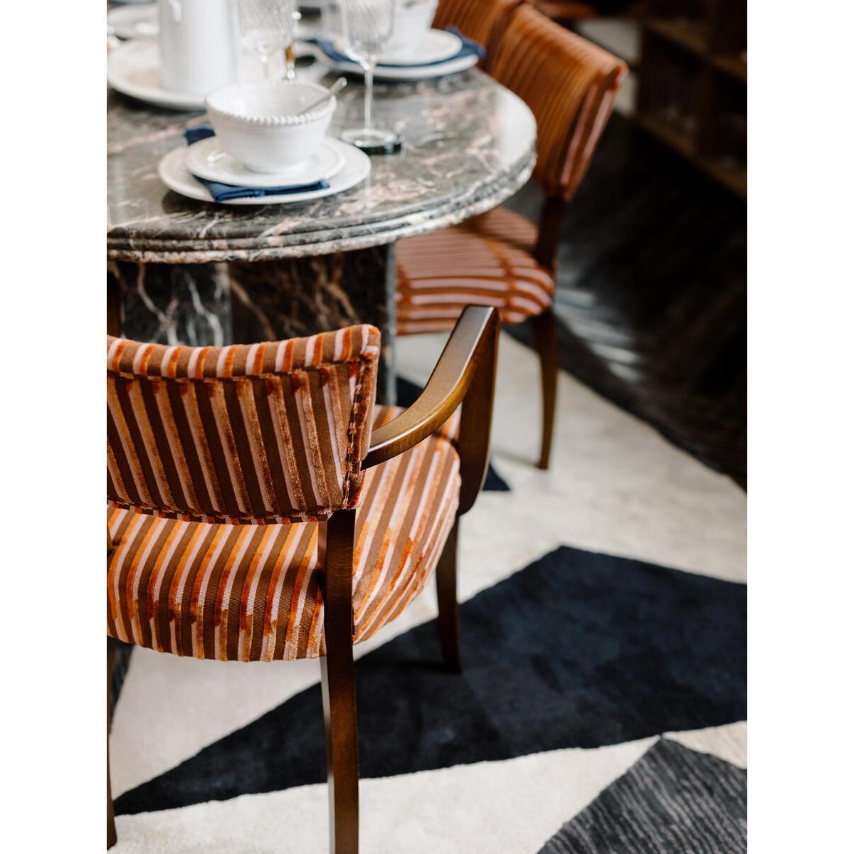 These Molina dining chairs are a fantastic choice for adding a touch of elegance and texture to both traditional and contemporary interiors. I love their rich velvet upholstery - it immediately elevates a space while offering a soft, comfortable seating option. The subtle tufting and striped pattern add visual interest without overwhelming the room. They work particularly well in period-style dining rooms or modern schemes where you want a hint of classic sophistication. For styling tips, pair them with a neutral-toned table to let the fabric and design shine, and consider adding complementary velvet cushions or a patterned rug to complete the look. These chairs are versatile enough to work in a variety of settings, from elegant dinner parties to relaxed breakfast nooks.