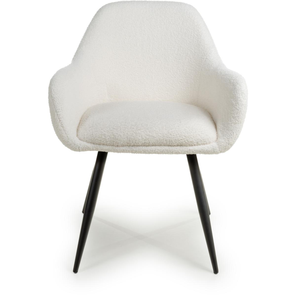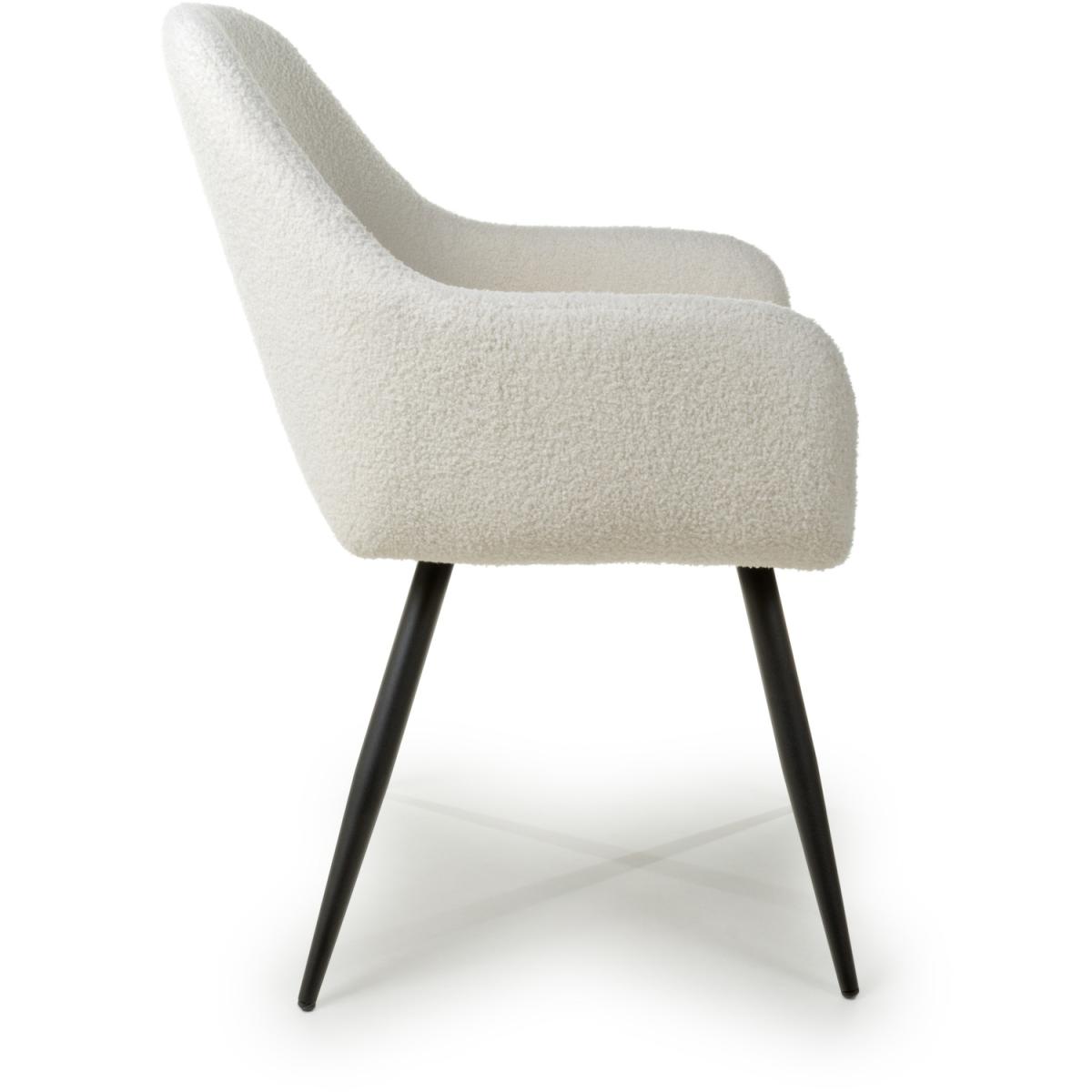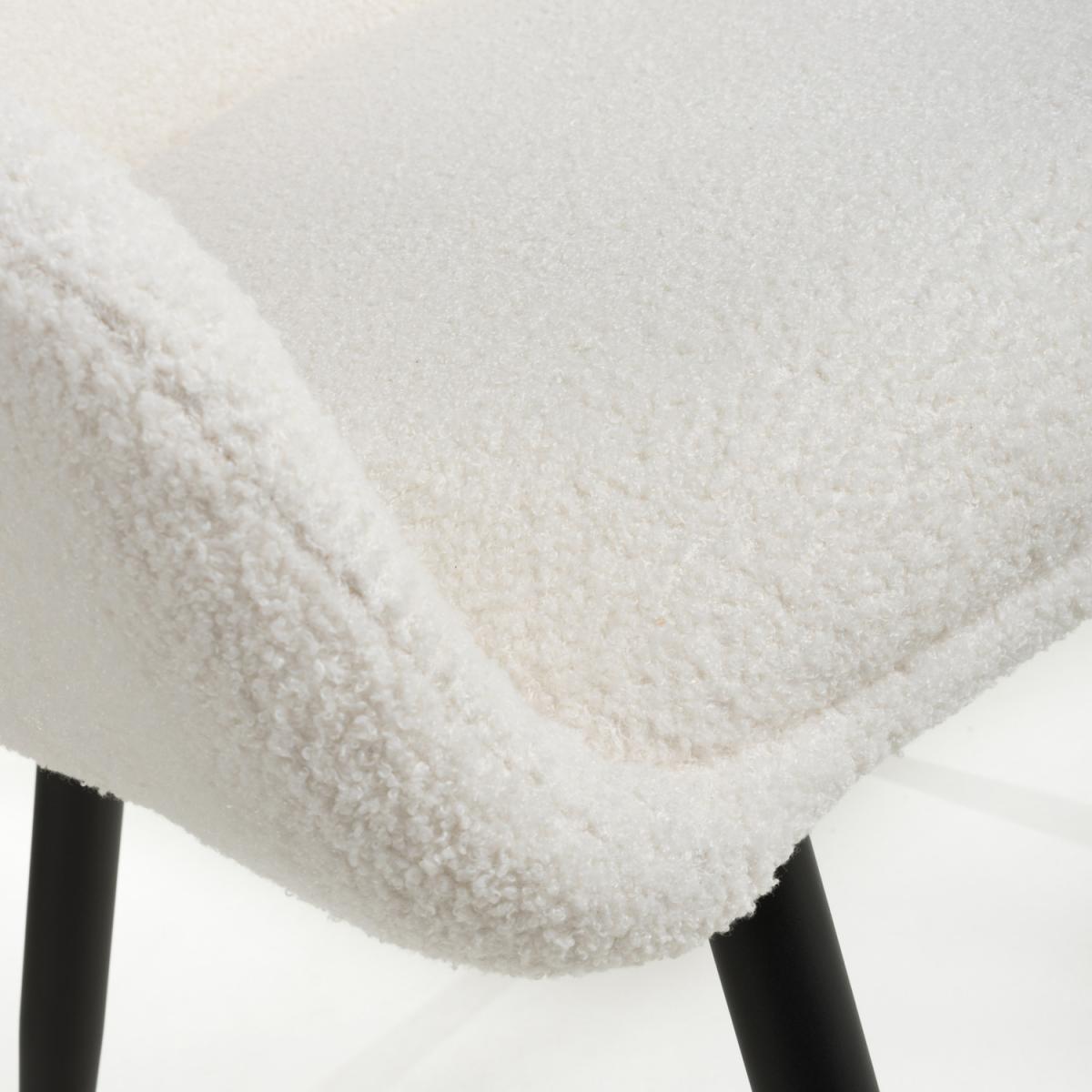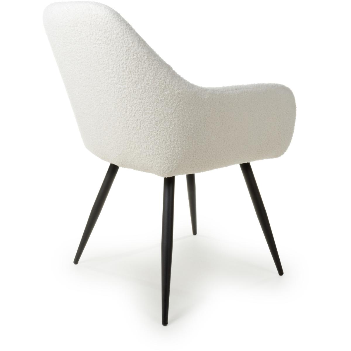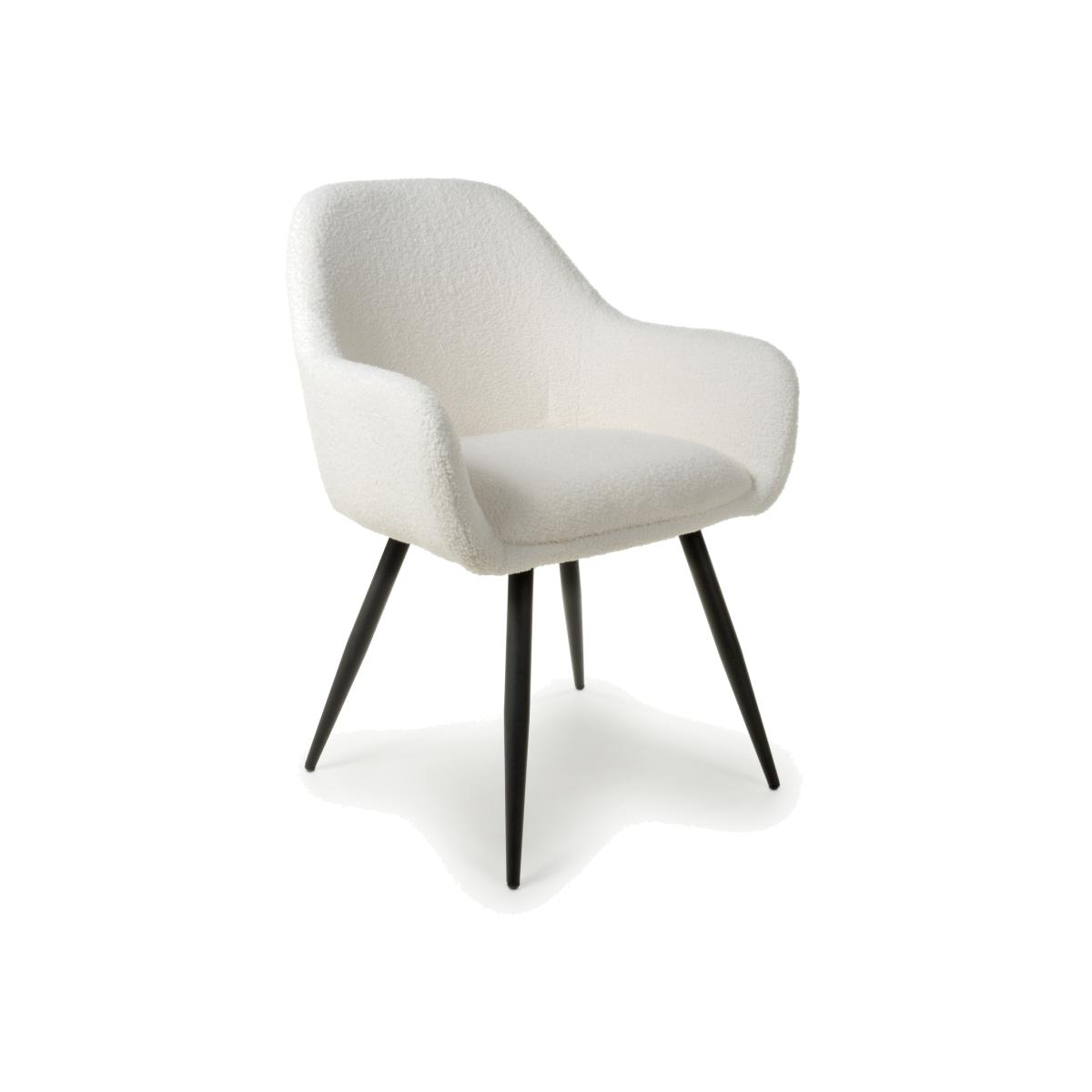 This trendsetting dining chair comes upholstered in luxurious boucle fabric. The gently sloping back and armrests provide extra comfort. Supplied with tapered black metal legs. Assembly required. Sold in boxes of 2.