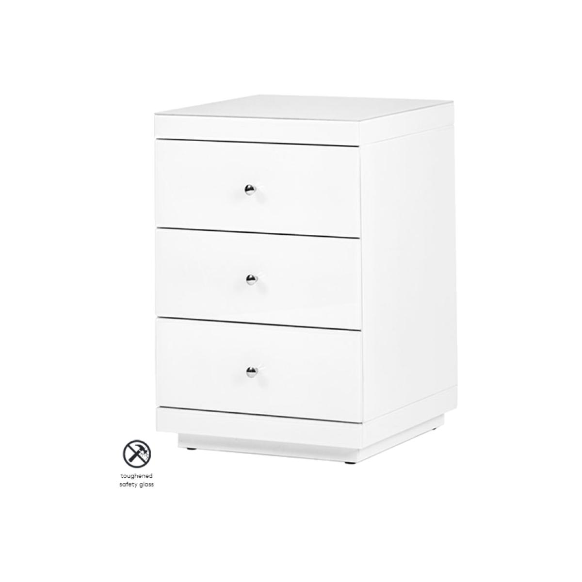 Pair of timeless hand-crafted bedside tables. Toughened white glass with 4mm bevelled edge. Three spacious drawers. Solid timber frame. Metal drawer runners. Sleek conical handles. This listing is for two Bedside tables only, all other items are sold separately.
