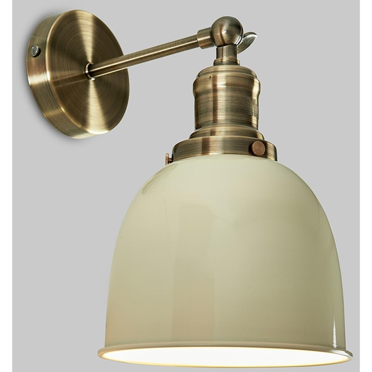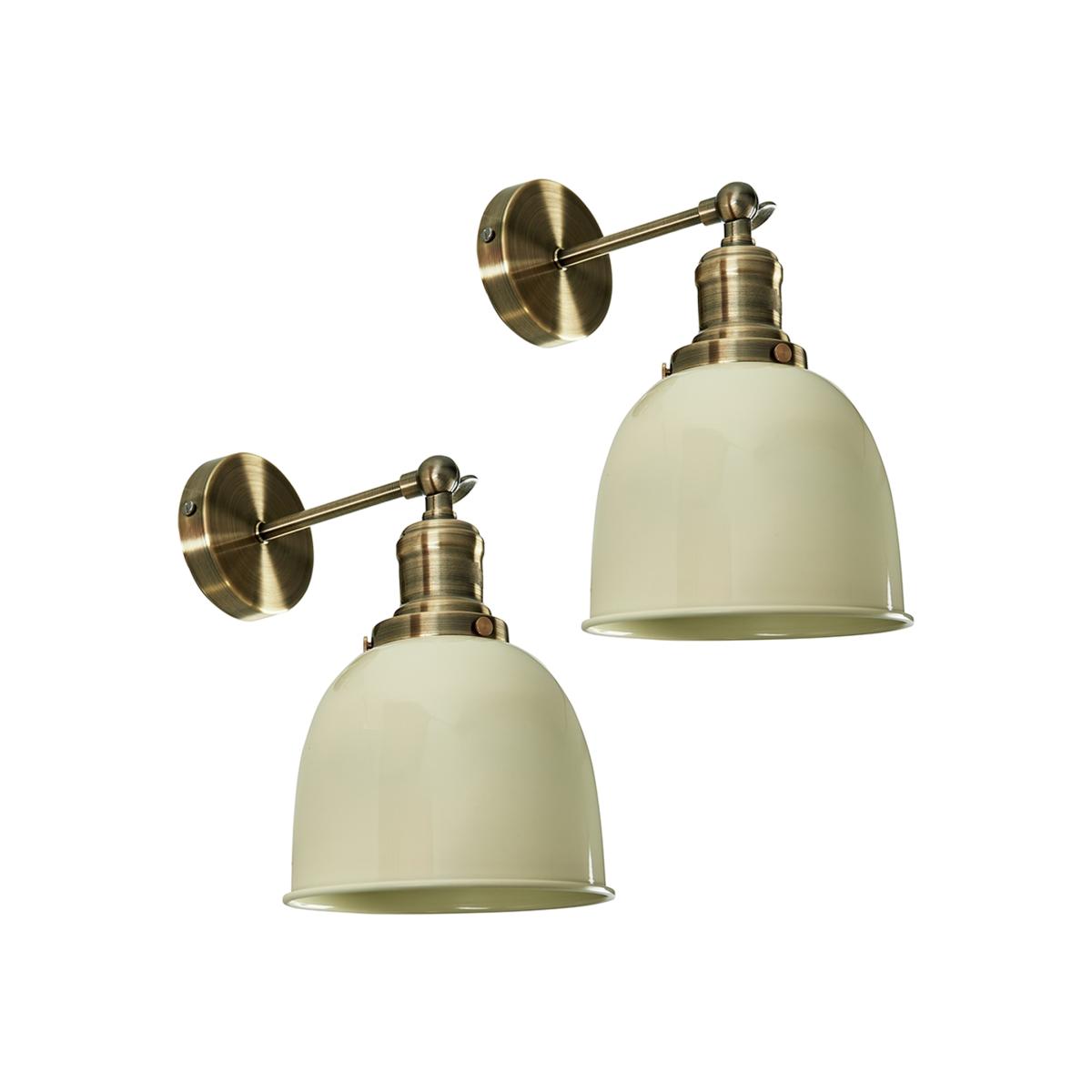 A pair of retro style wall light fittings in an antique brass finish, complete with gloss cream metal dome shaped shades. These wall lights feature a knuckle joint that allows you to adjust the angle of the lamp into your desired position. Wall lights are a great way to bring additional lighting to a room and are particularly useful to illuminate a dull alcove.