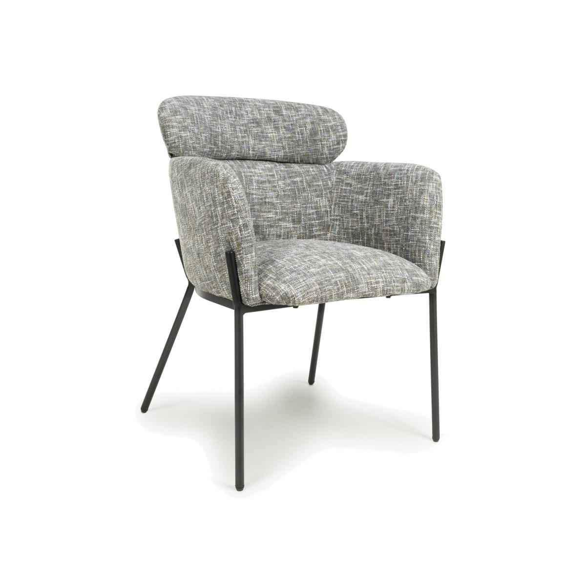 This understated contemporary accent chair comes in a stunning multi-tonal textured woven toffee coloured fabric. The generous bucket seat provides extreme comfort, and is complimented by high armrests. A cylindrical headrest cushion adds an extra layer of comfort. The seat is supported by a distinctive slim and angular black metal leg frame. Assembly required. Sold in sets of 2.