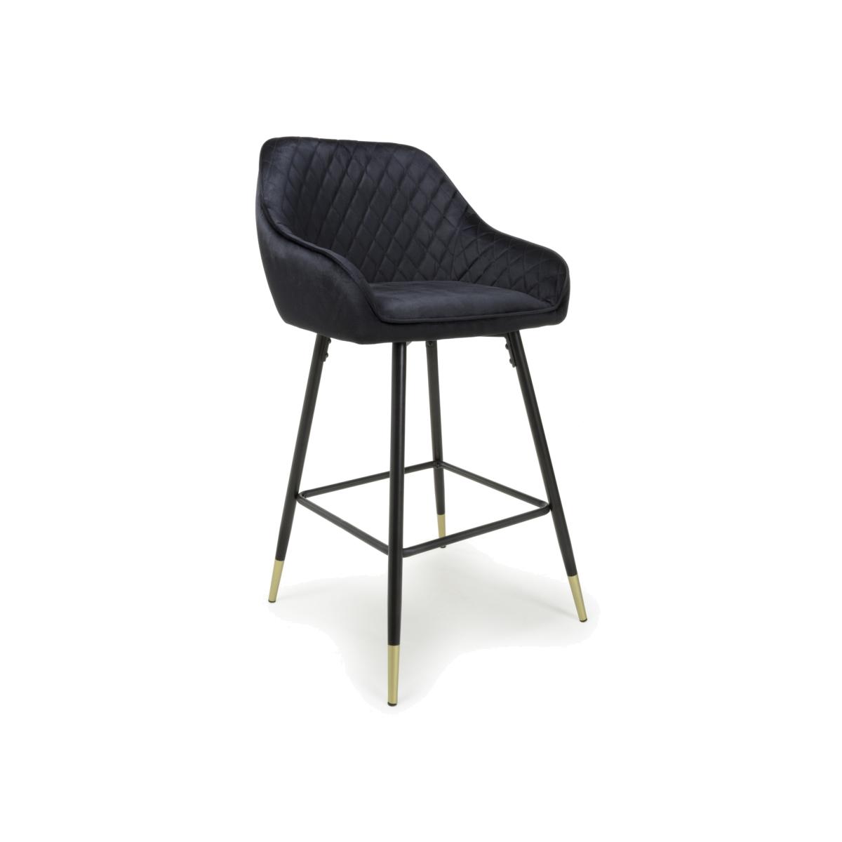 A highly desirable bar stool upholstered in brushed velvet. The gently sloping back, padded armrests and square frame footrest combine to provide an extra level of comfort. The tapered leg frame comes in black metal with eye catching gold trim near the feet. Assembly required. Sold in boxes of 2.