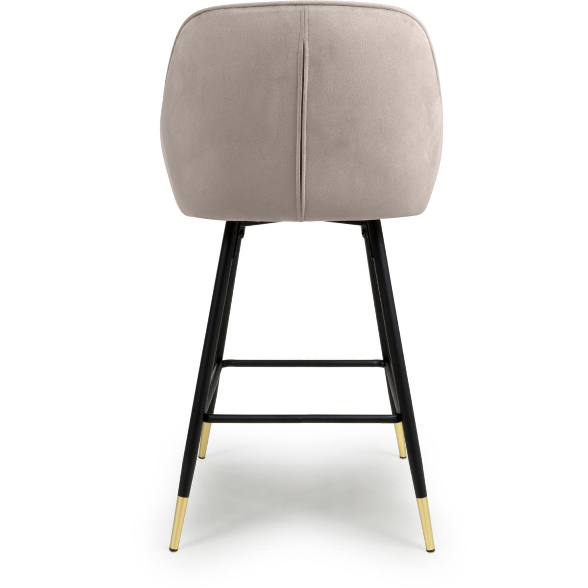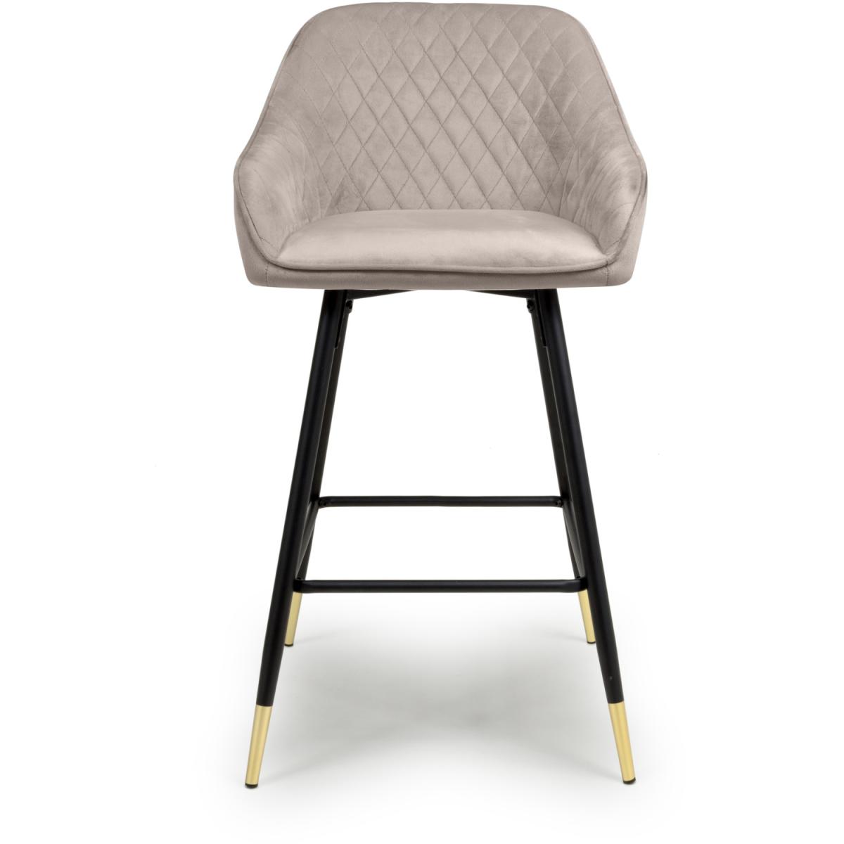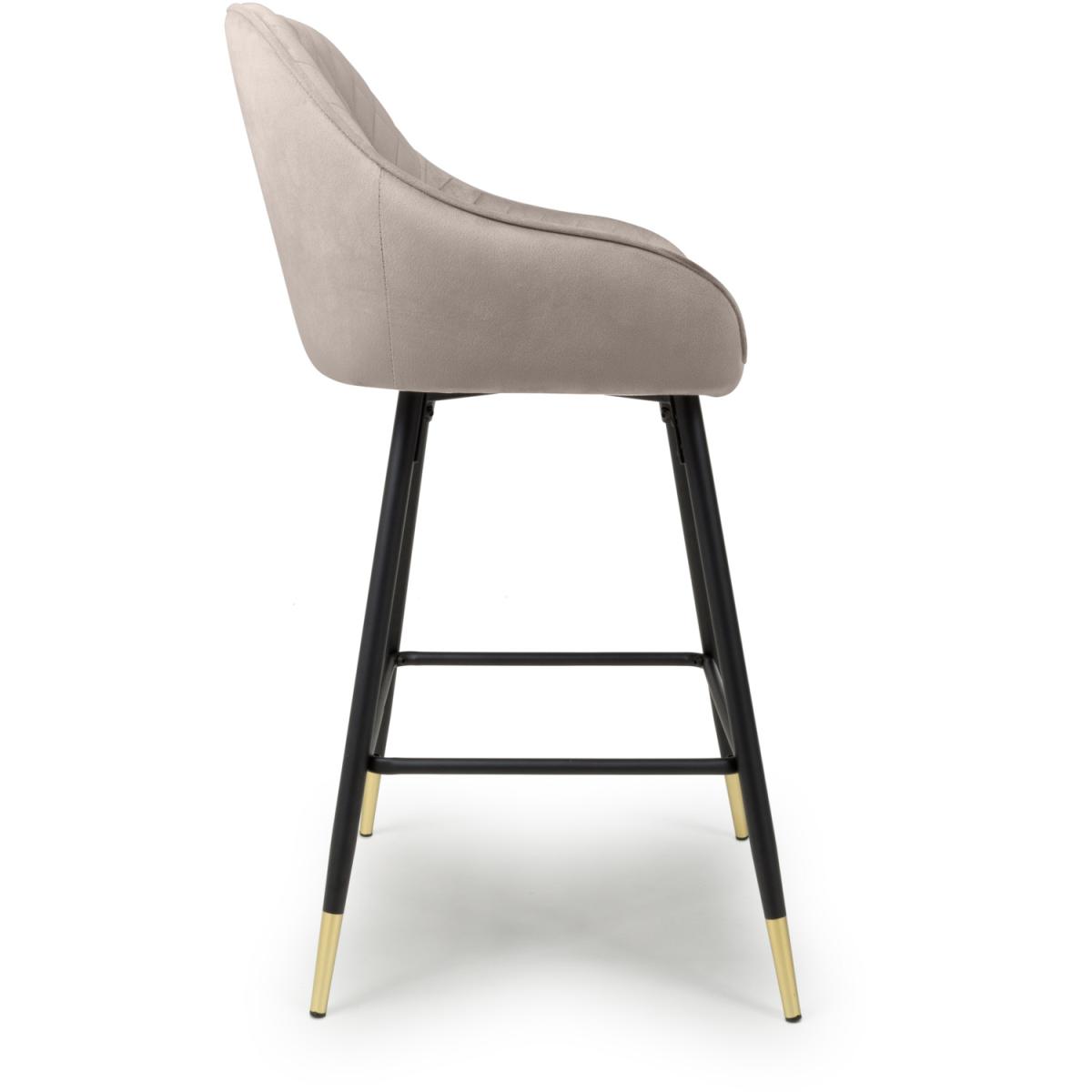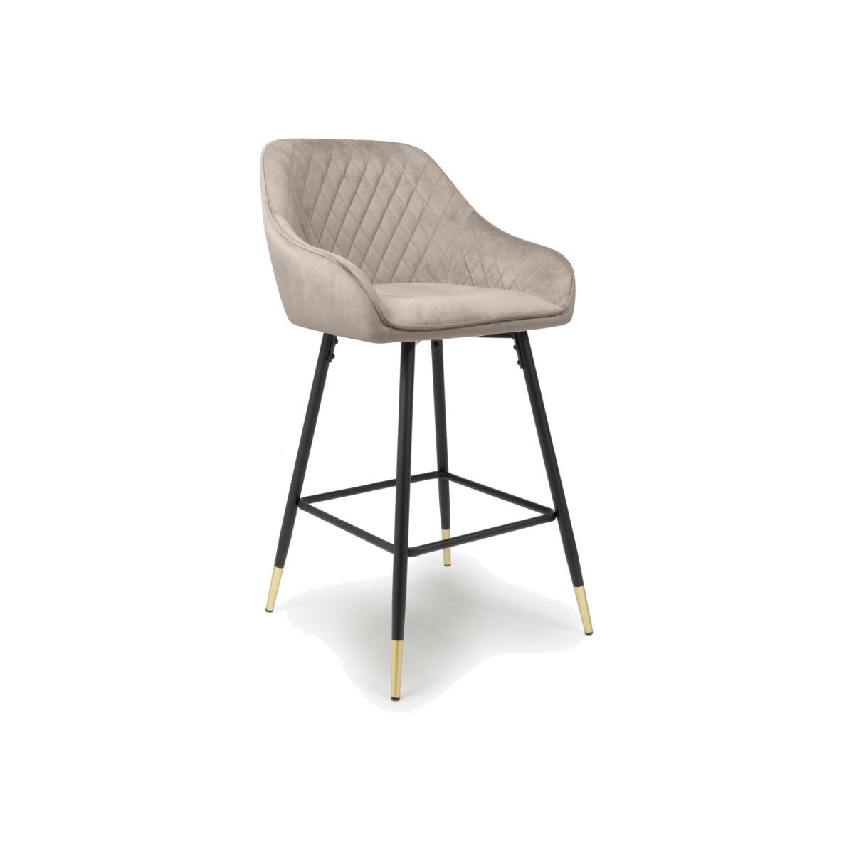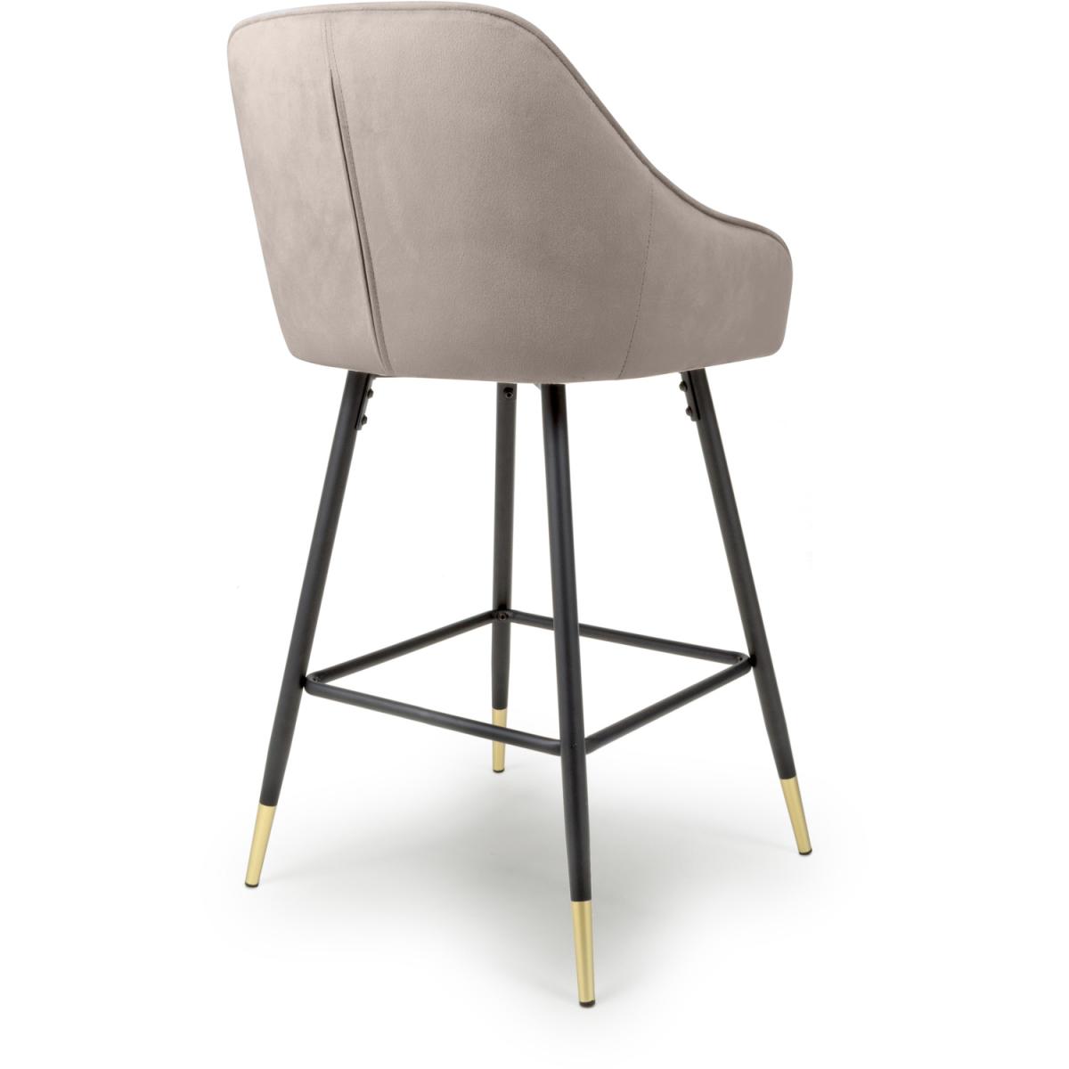 A highly desirable bar stool upholstered in brushed velvet. The gently sloping back, padded armrests and square frame footrest combine to provide an extra level of comfort. The tapered leg frame comes in black metal with eye catching gold trim near the feet. Assembly required. Sold in boxes of 2.