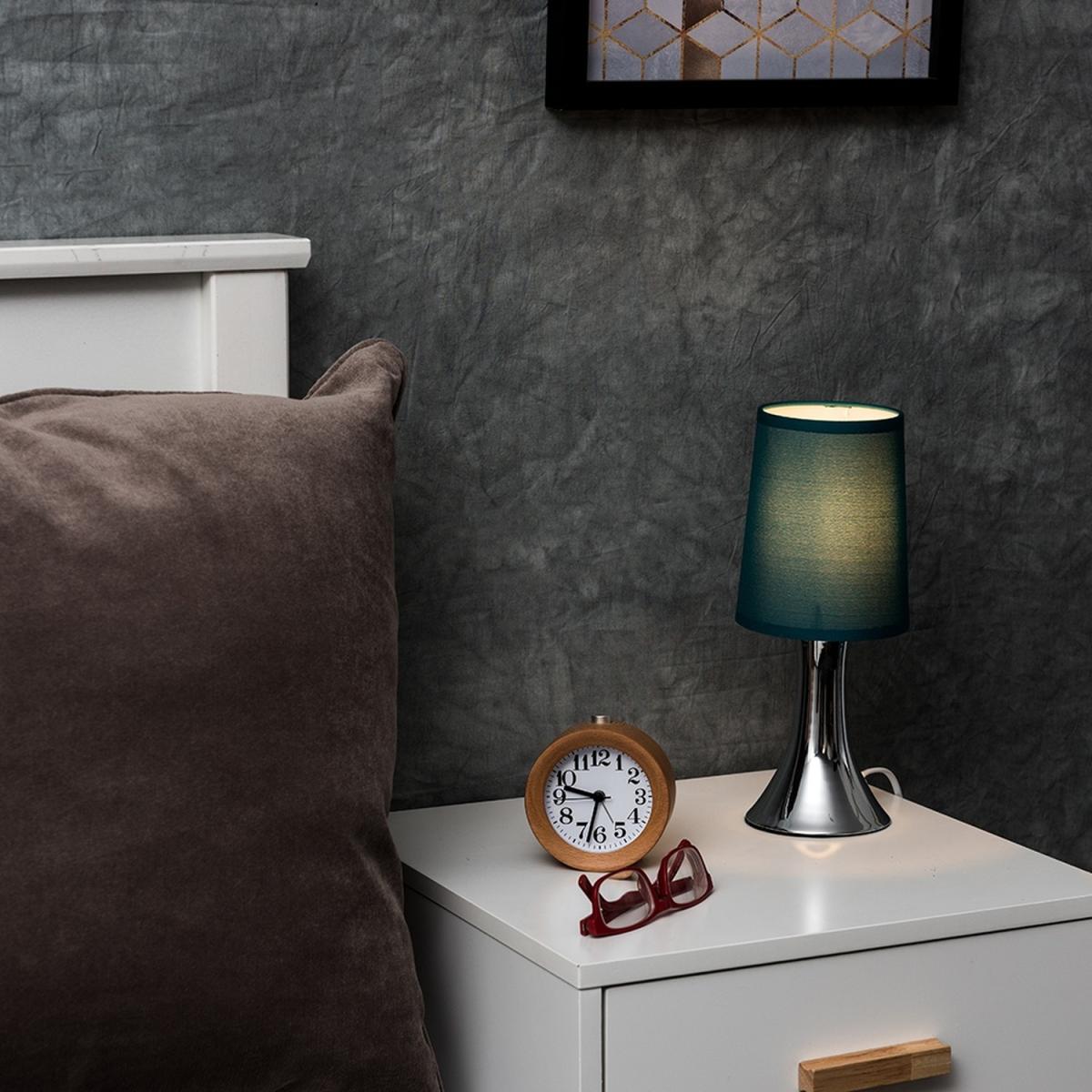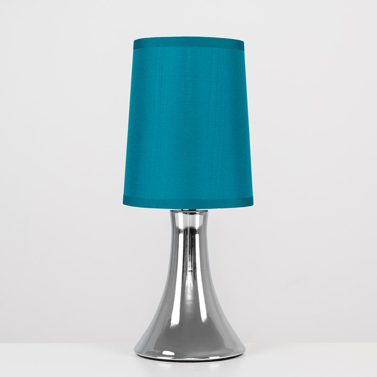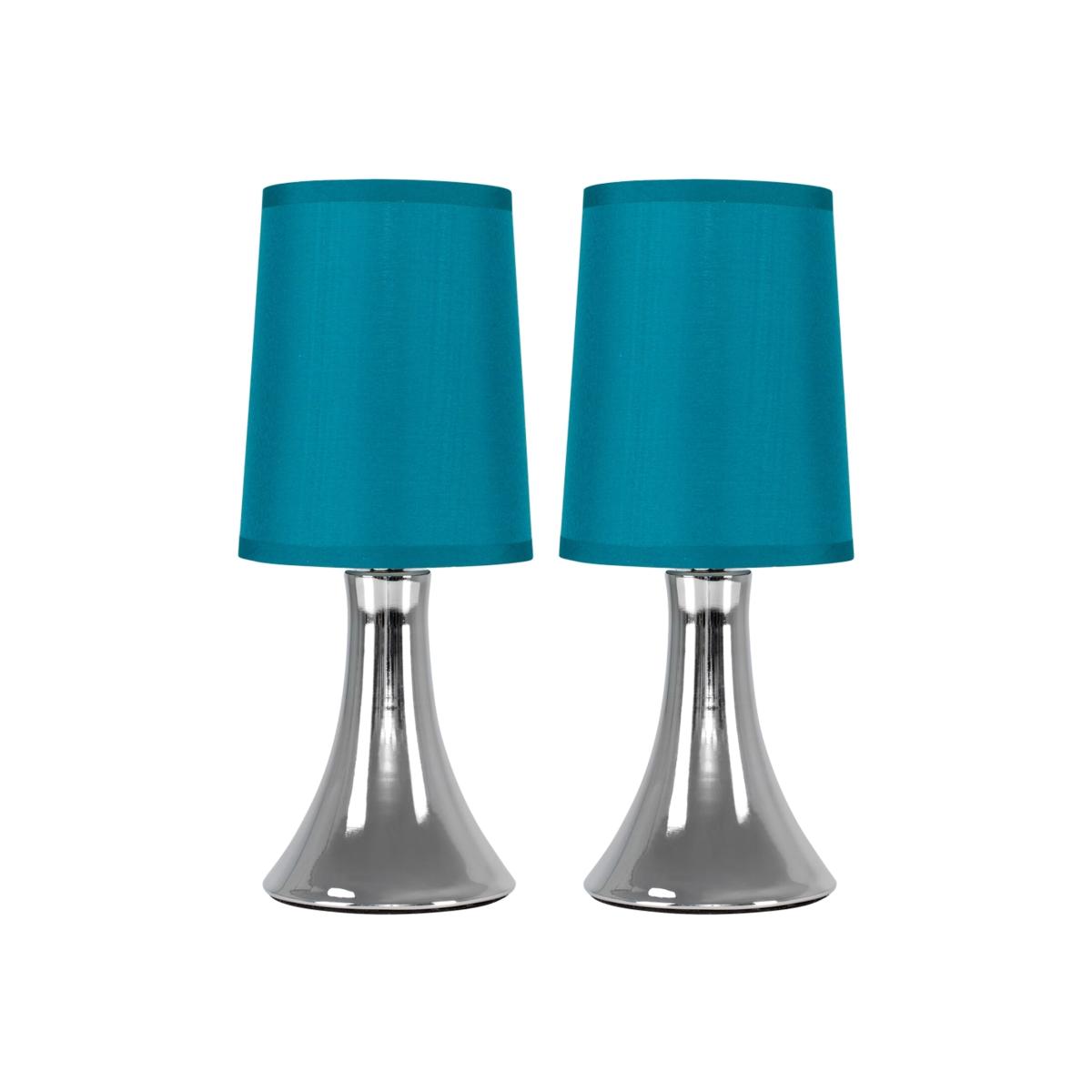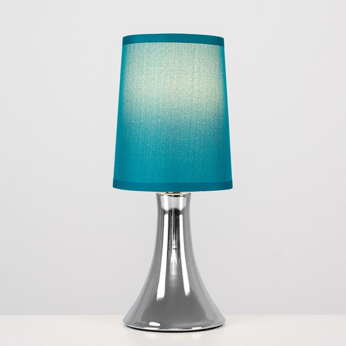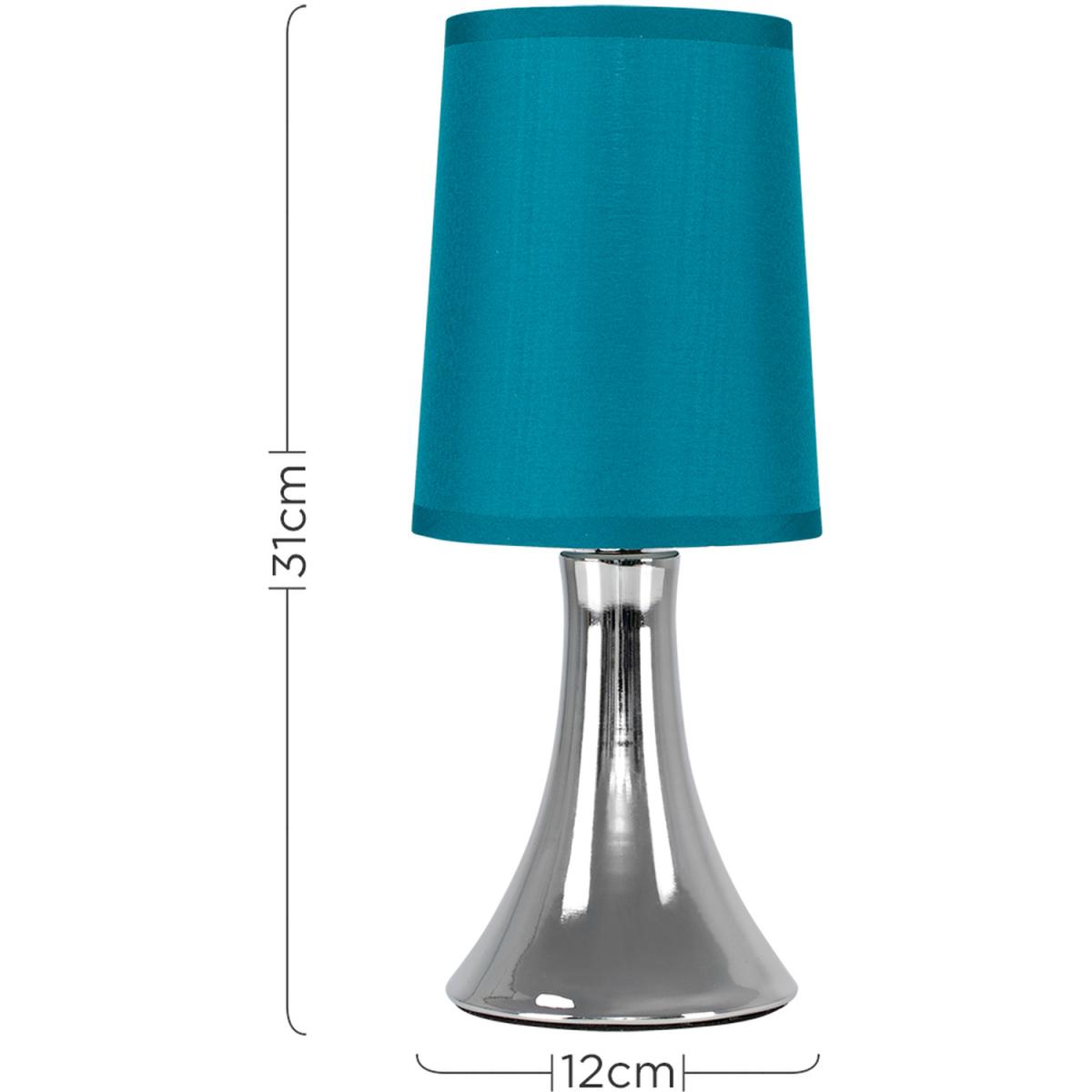 This fantastic pair of touch table lamps with a stunning curved trumpet polished chrome base are wonderful additions to any contemporary home. The teal fabric shade allows the light to be dispersed evenly throughout the room. Simply touch the metal base to turn it on. The light can be set to 4 stages, off, a low level light for mood lighting, a medium level light for general lighting and a high level light which is the brightest setting to create an intense pool of light. Table lamps are brilliant as complementary lighting and are perfect to light up dull corners. 2 x 40w SES E14 Candle Bulbs Are Required - Not Supplied. Please Note This lamp requires dimmable bulbs. Not suitable for standard LED or energy saving bulbs.