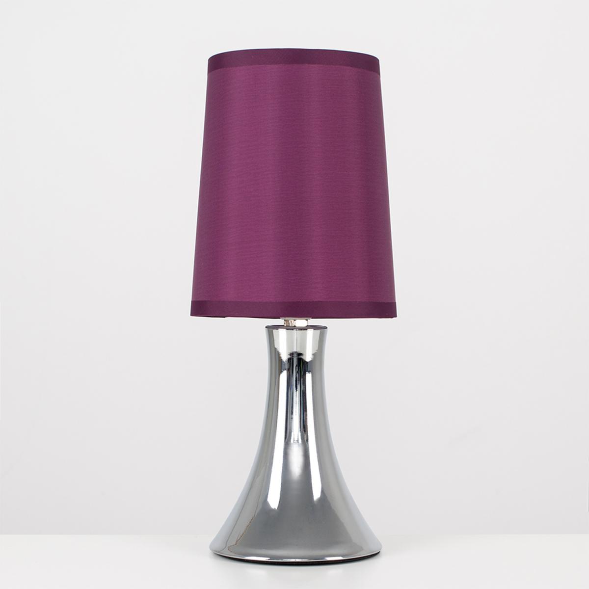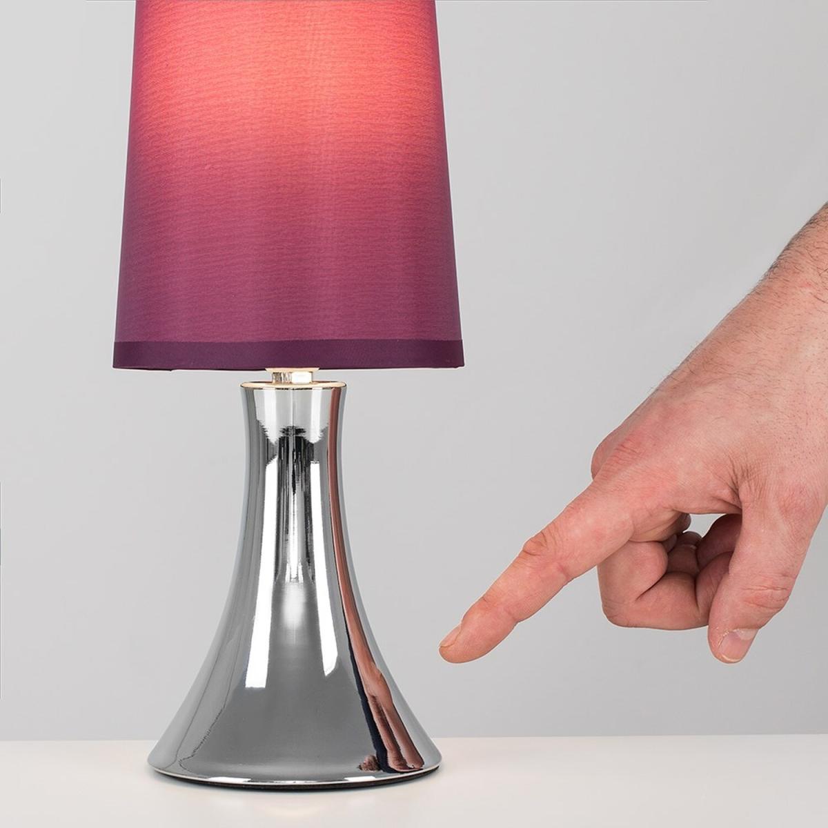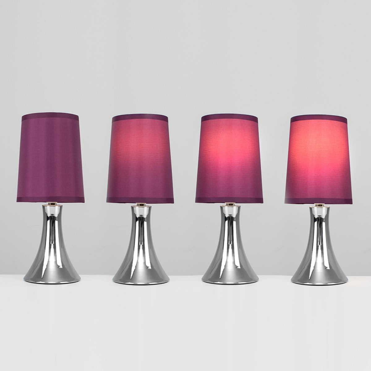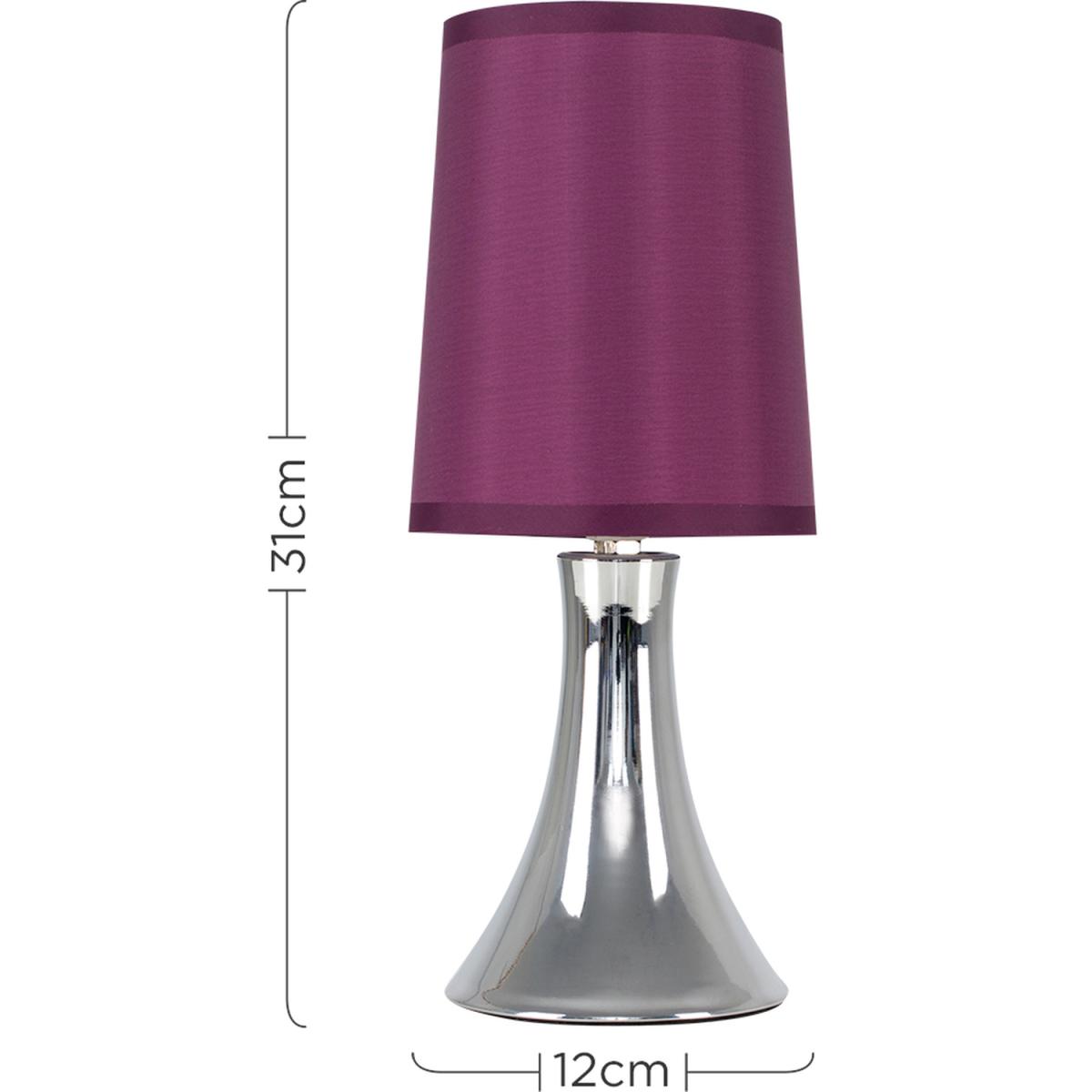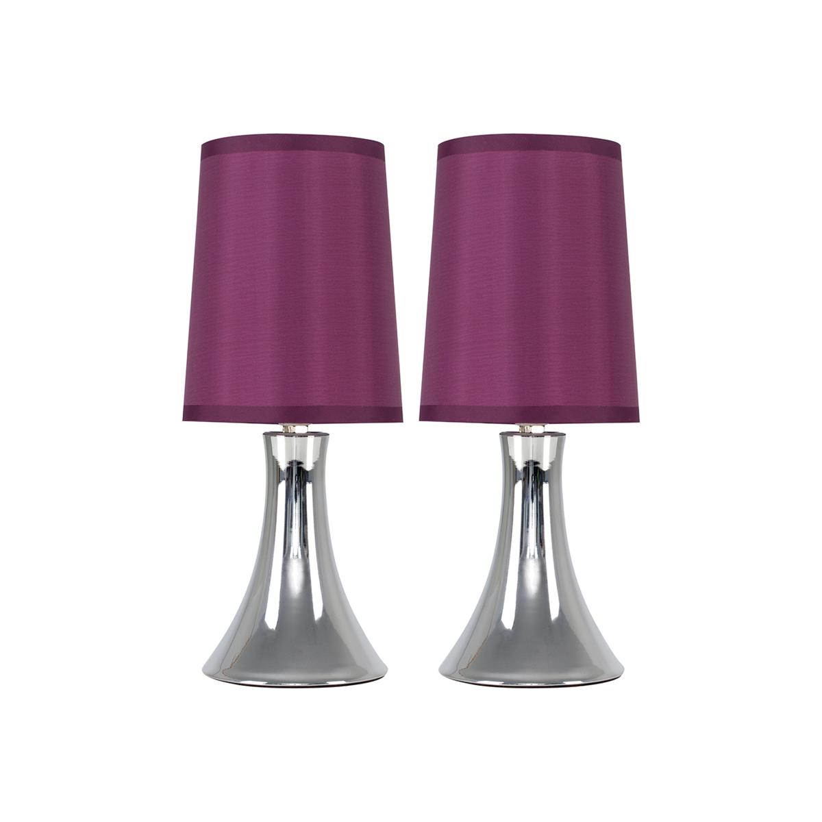 This fantastic pair of touch table lamps with a stunning curved trumpet polished chrome base are wonderful additions to any contemporary home. The purple fabric shade allows the light to be dispersed evenly throughout the room. Simply touch the metal base to turn it on. The light can be set to 4 stages, off, a low level light for mood lighting, a medium level light for general lighting and a high level light which is the brightest setting to create an intense pool of light. Table lamps are brilliant as complementary lighting and are perfect to light up dull corners. 2 x 40w SES E14 Candle Bulbs Are Required - Not Supplied. Please Note This lamp requires dimmable bulbs. Not suitable for standard LED or energy saving bulbs.