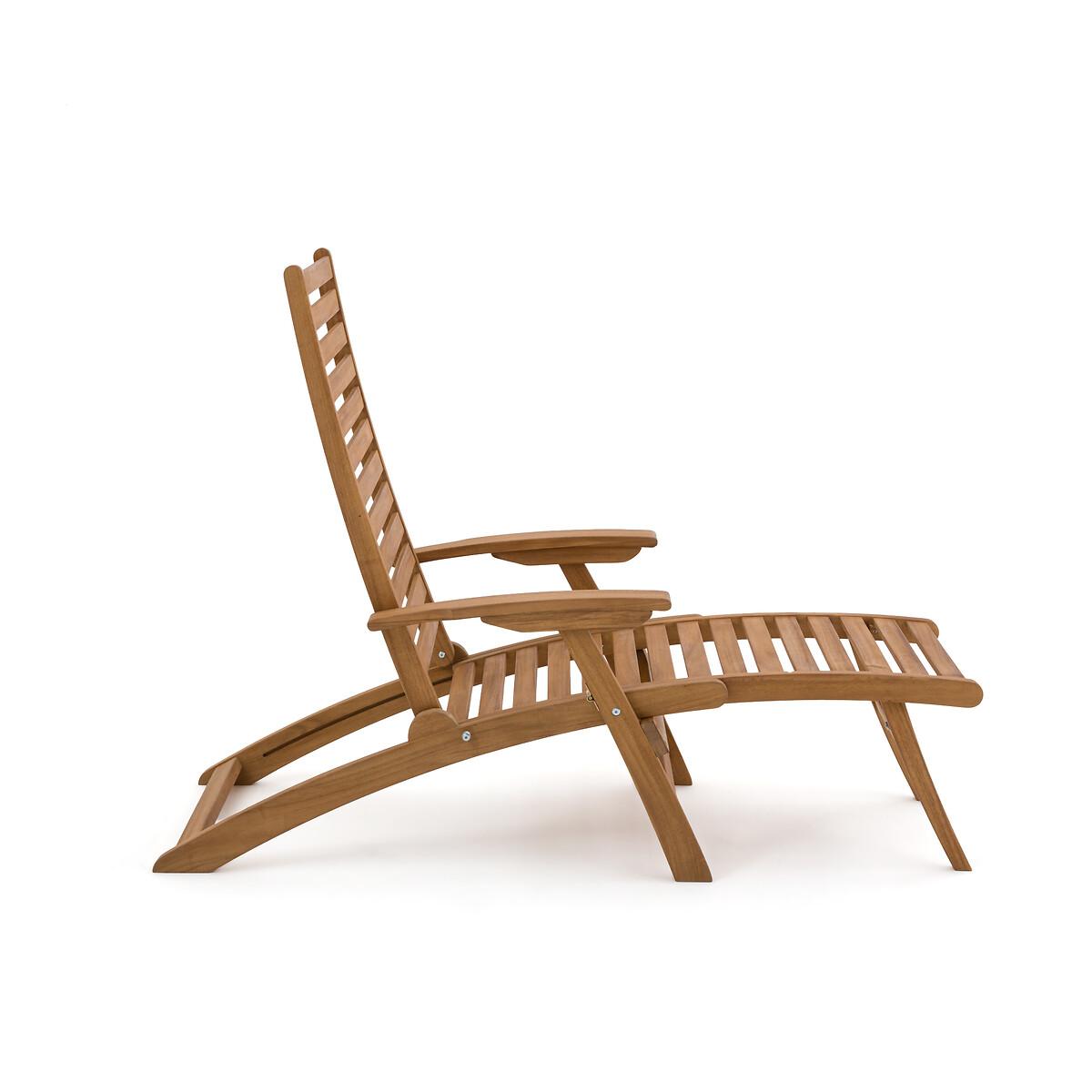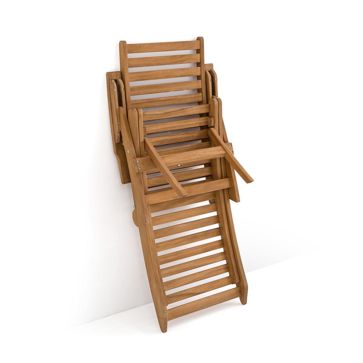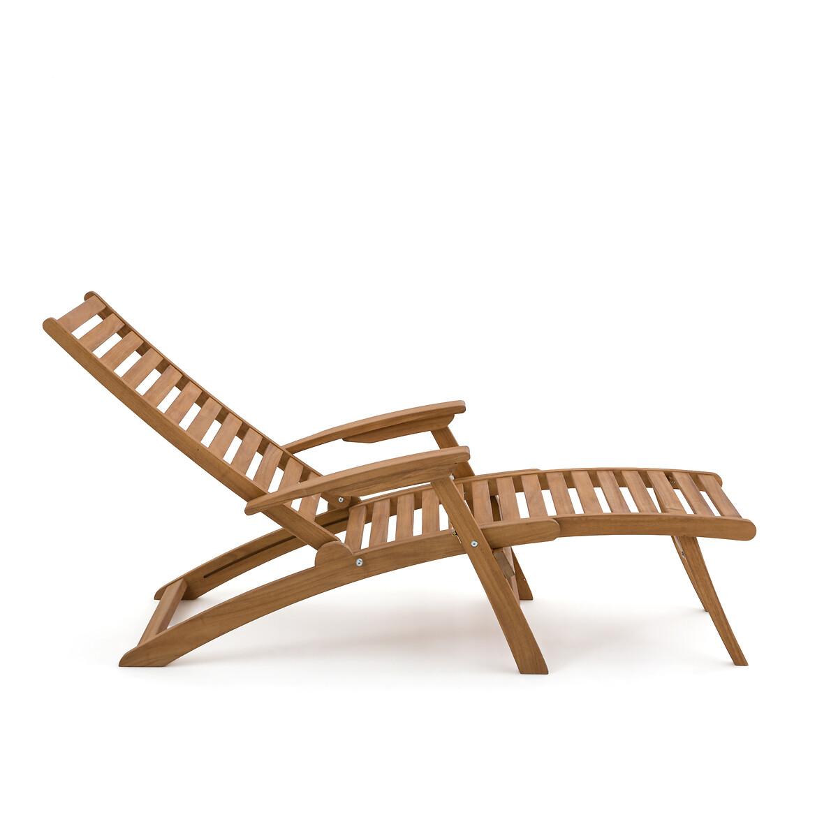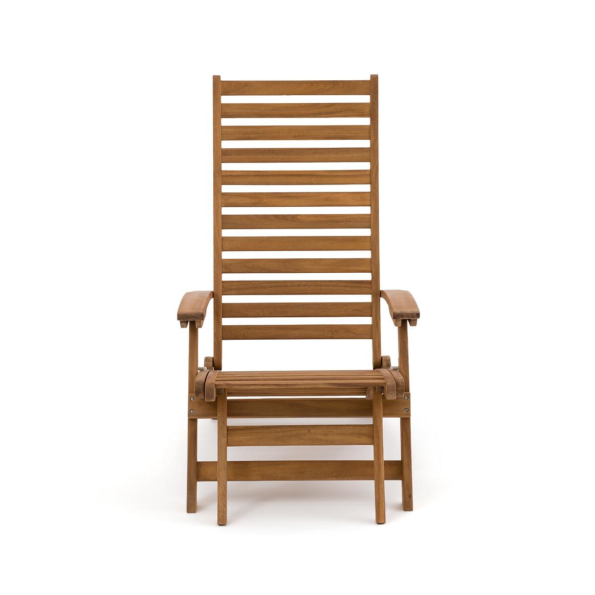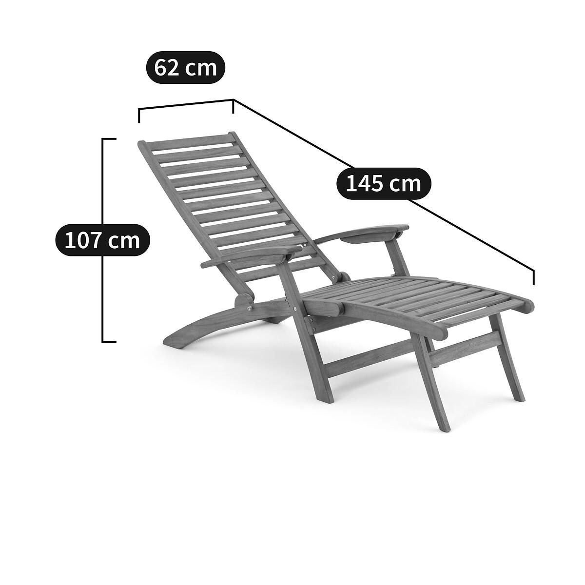 An invitation to relax. Designed in acacia, this garden armchair transforms into a lounge chair with its extendable then retractable seat. Its 3-position adjustable backrest offers all the comfort to fully enjoy sunny days. Folding for easy storage. Product Details • In FSC® certified acacia, oiled finish • Back and seat in 4.4cm openwork slats • Back adjustable in 3 positions • Retractable footrest under the seat • Folding • Max weight 100 kg Quality Info • Acacia is a wood that offers good mechanical properties (good resistance to insects and fungi) and is resistant to bad weather (alternation of dry and humid periods).Dimensions • Width: 62cm • Height: 107cm • Depth: 145cm • Weight: 12kgDelivery:. Sold pre-assembled. Note! Please check that all access points are large enough to accommodate your delivery (doors, stairs, lifts). • WOOD FROM SUSTAINABLY MANAGED FORESTS. FSC® certified wood comes from forests that are environmentally, socially and economically well managed. Dimensions and weight of parcel1 parcel • L143 x H18 x D66.5cm. 16kg