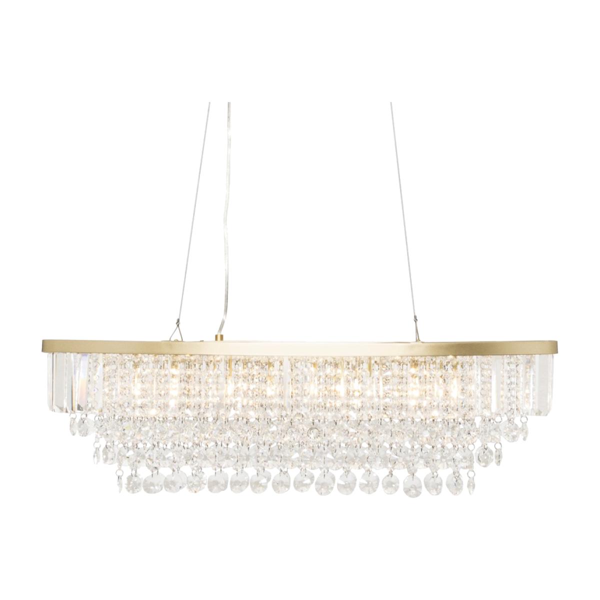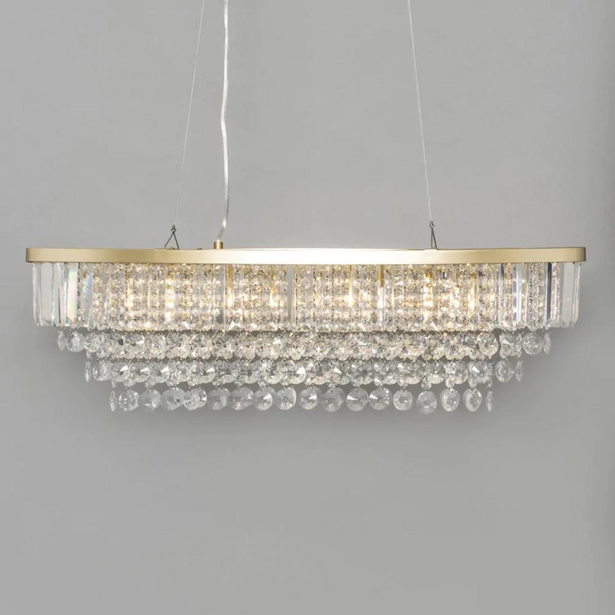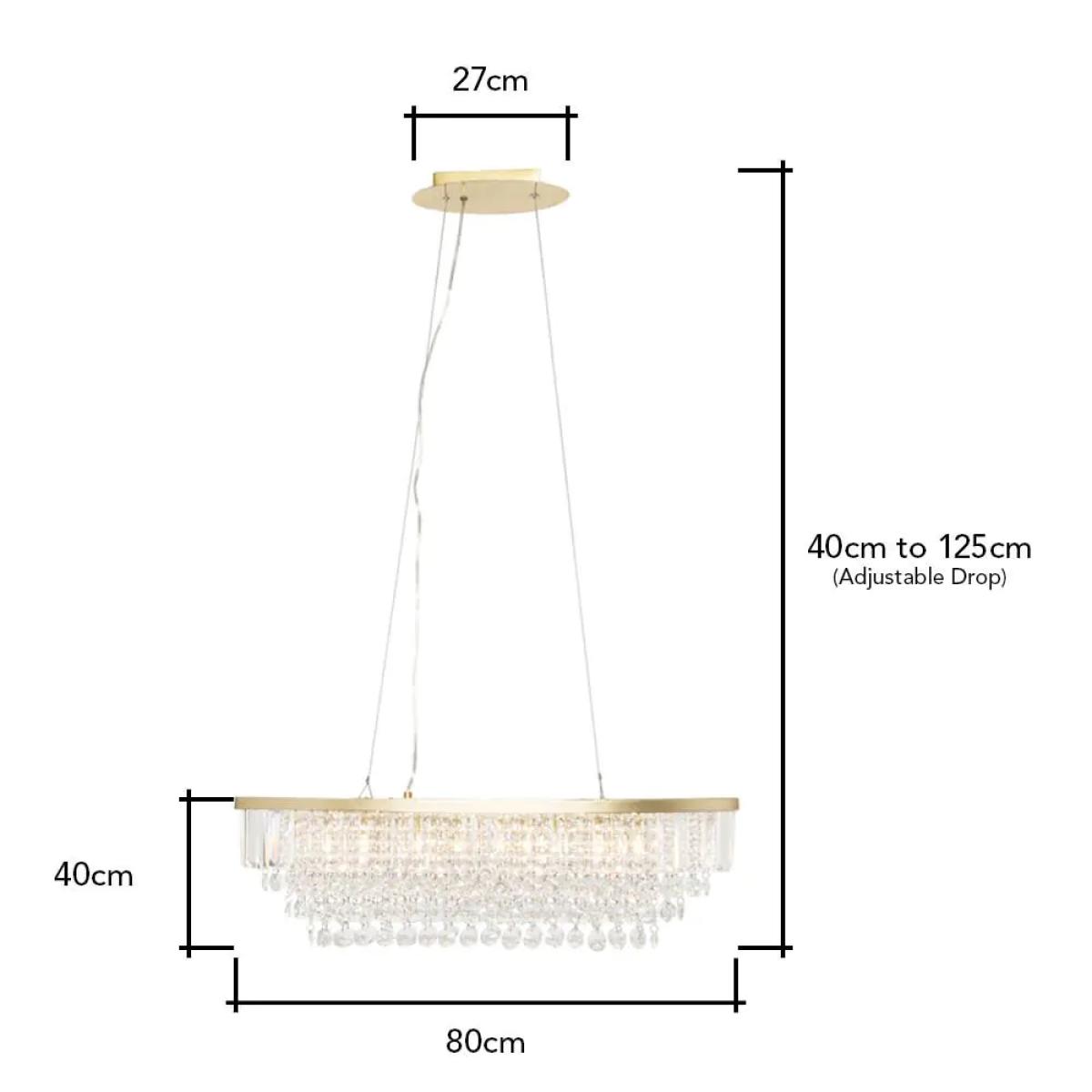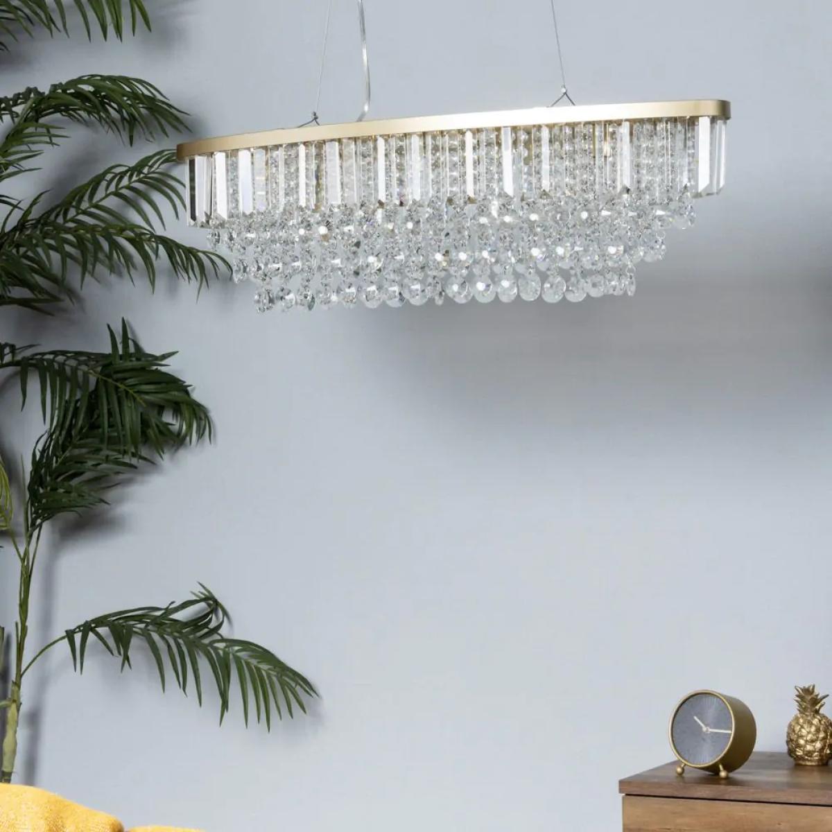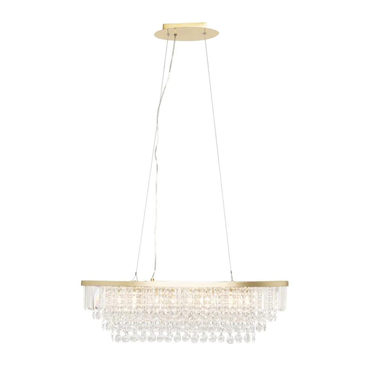 Opulent lighting design for your interior décor with the Paladina Ceiling Pendant Diner Bar, Satin Brass. This ceiling pendant features an oval of crystal effect prisms and tiers of stunning crystal effect droplets which sparkle beautifully as they reflect the light from within. It is also height adjustable and finished in satin brass for a luxurious look that suits neutral colour schemes or post-modern decor.