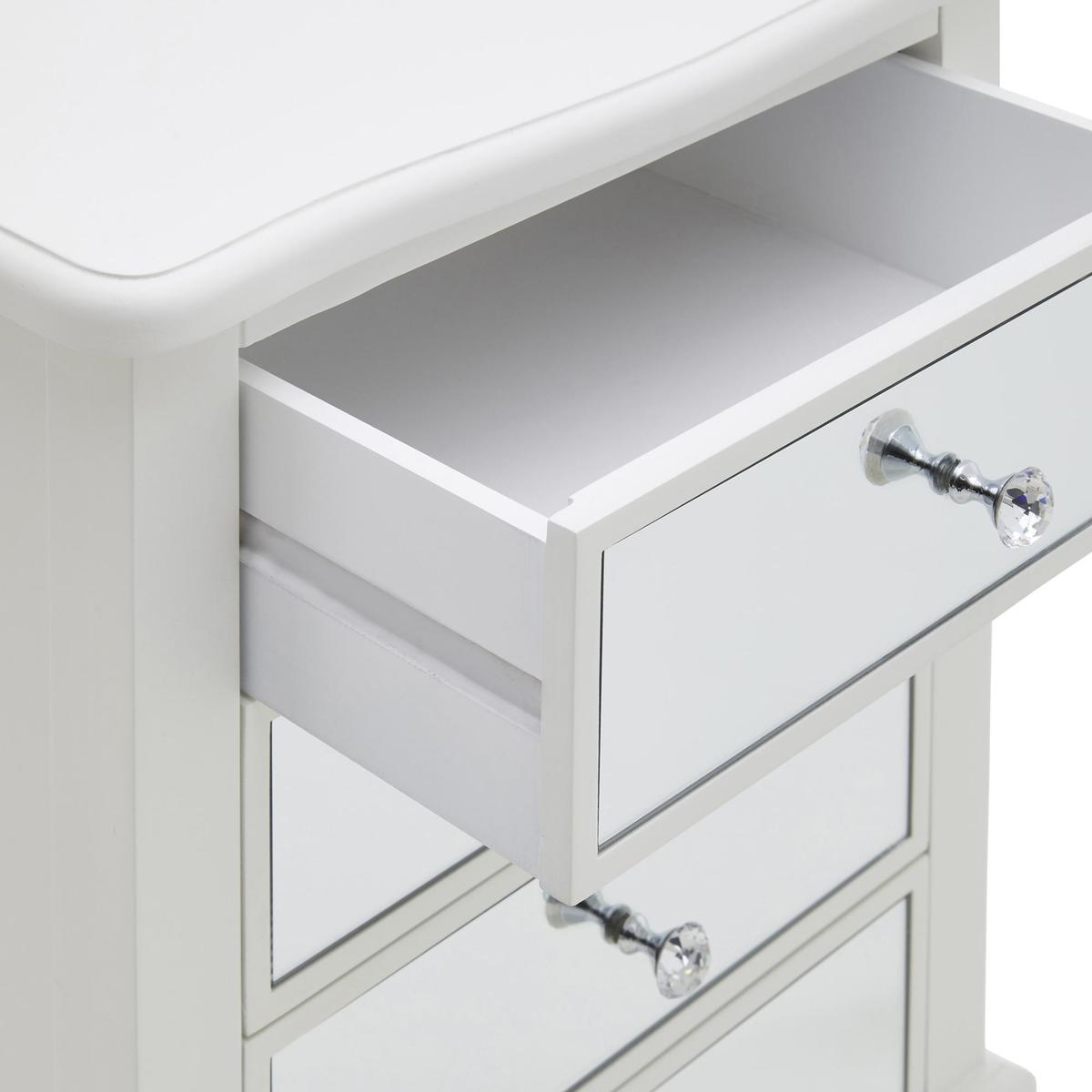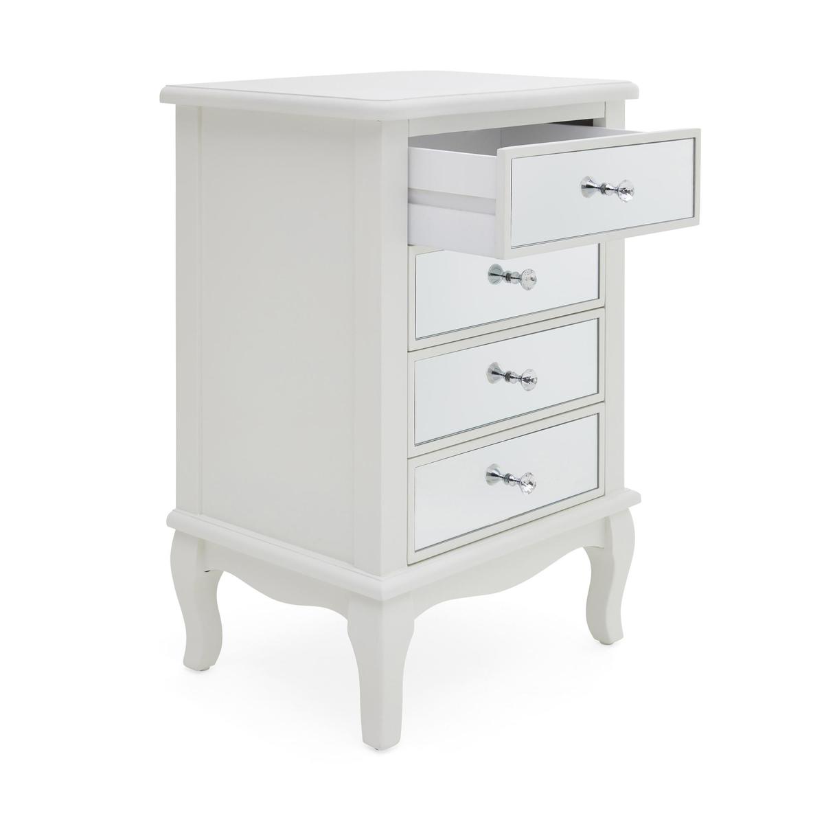 Dunelm Exclusive - Designed and Developed by Dunelm. Inspired by French styling and elegantly crafted with a contrasting mix of wood and mirrored front, the Palais range is the perfect way to add a hint of glamour and style to your home. Fashioned in a painted ivory colourway, this range features curved legs crafted from solid rubber wood and complimenting crystal effect glass handles. Designed to maximise storage space, this fully assembled bedside table features four spacious drawers equipped with smooth runners.