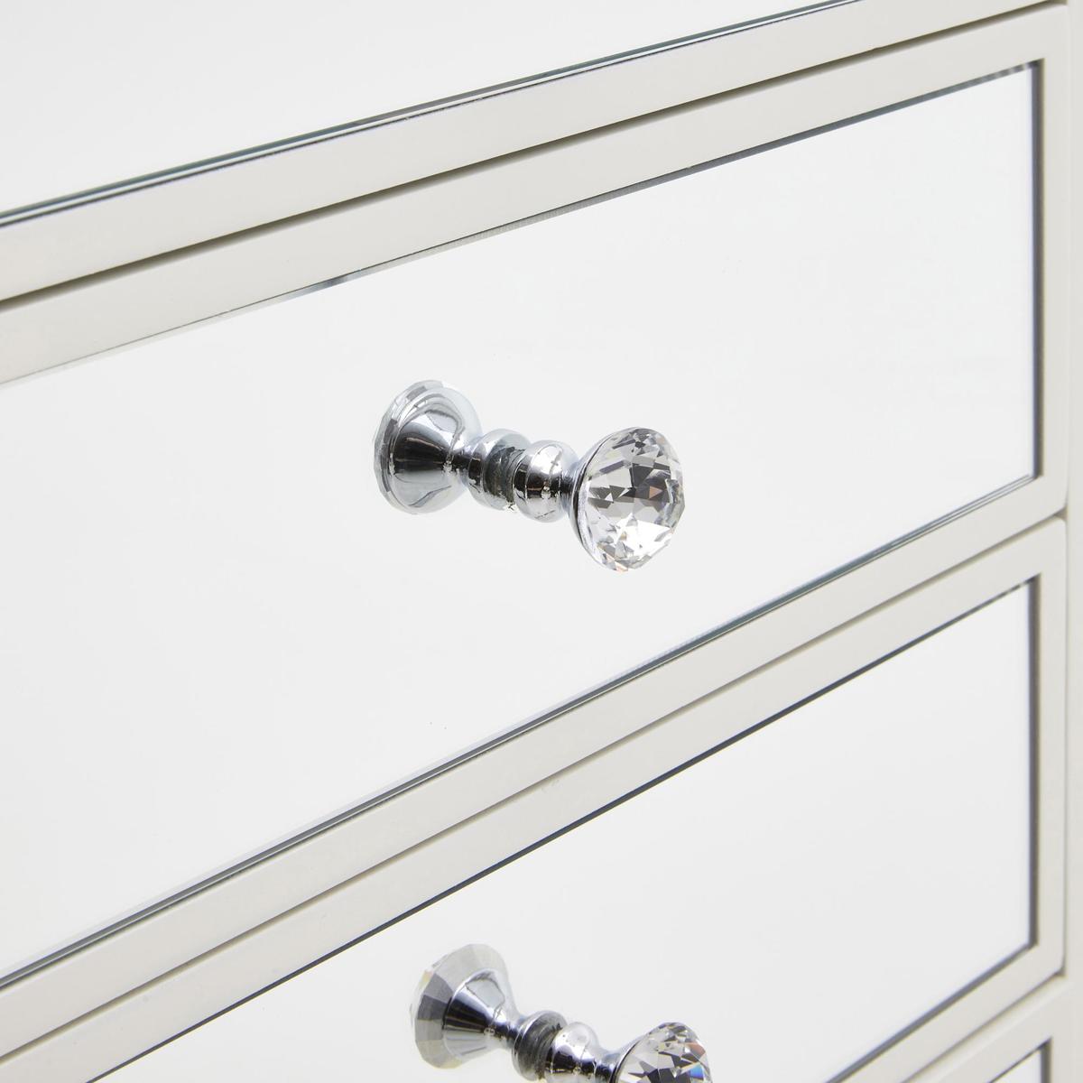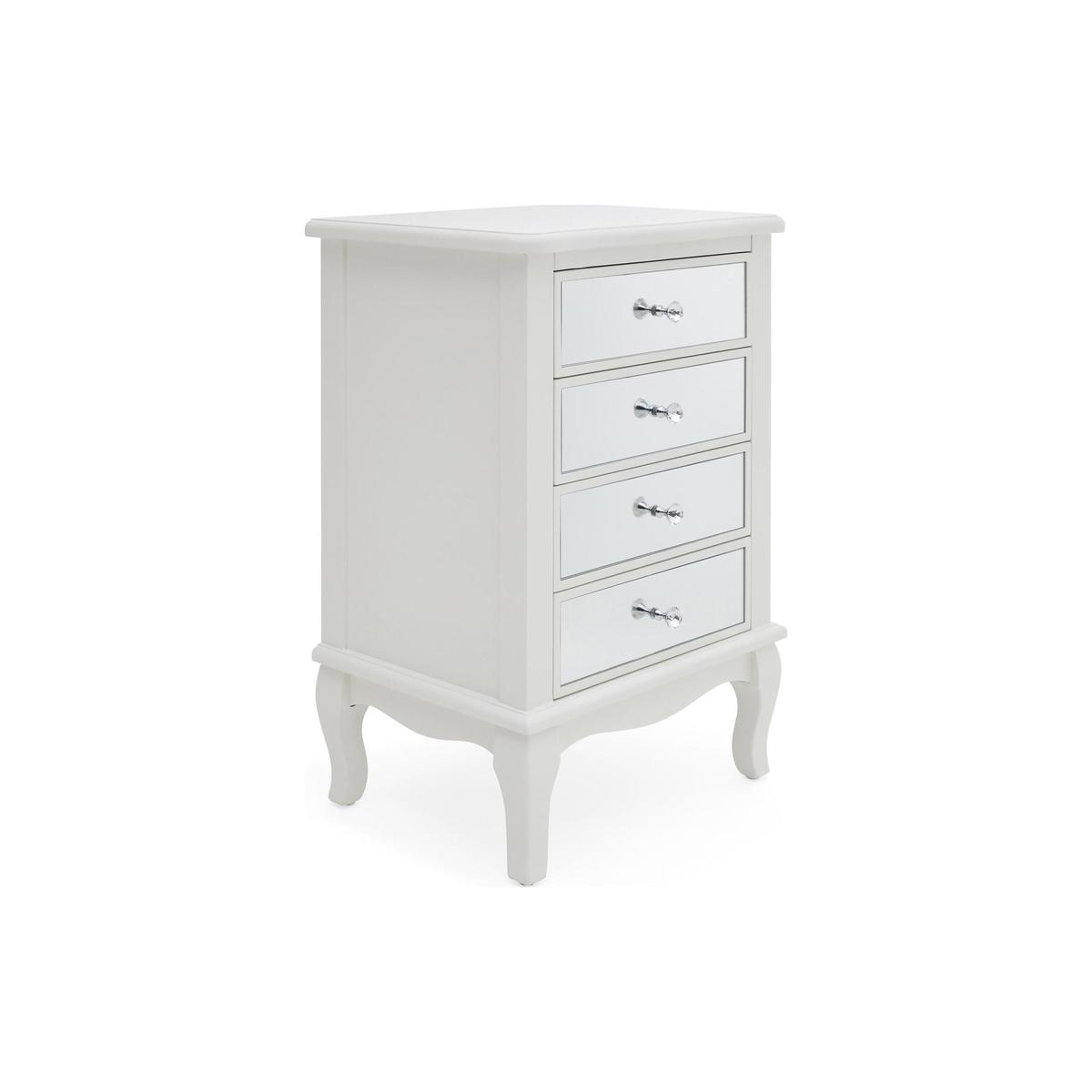 I love this chic little bedside table for its versatile elegance. The mirrored finish with an ivory tone makes it perfect for both classic and contemporary bedrooms, adding a touch of understated glamour. It’s practical too - the four drawers offer ample storage while maintaining a tidy look. For styling, I recommend pairing it with soft textiles like linen bedding and subtle metallic accents to enhance its sophisticated vibe. It works particularly well in vintage-inspired interiors or modern spaces with a touch of romantic charm. To keep it looking fresh, consider adding a small lamp and a decorative tray on top, while ensuring the handles are kept polished for a crisp, finished appearance.