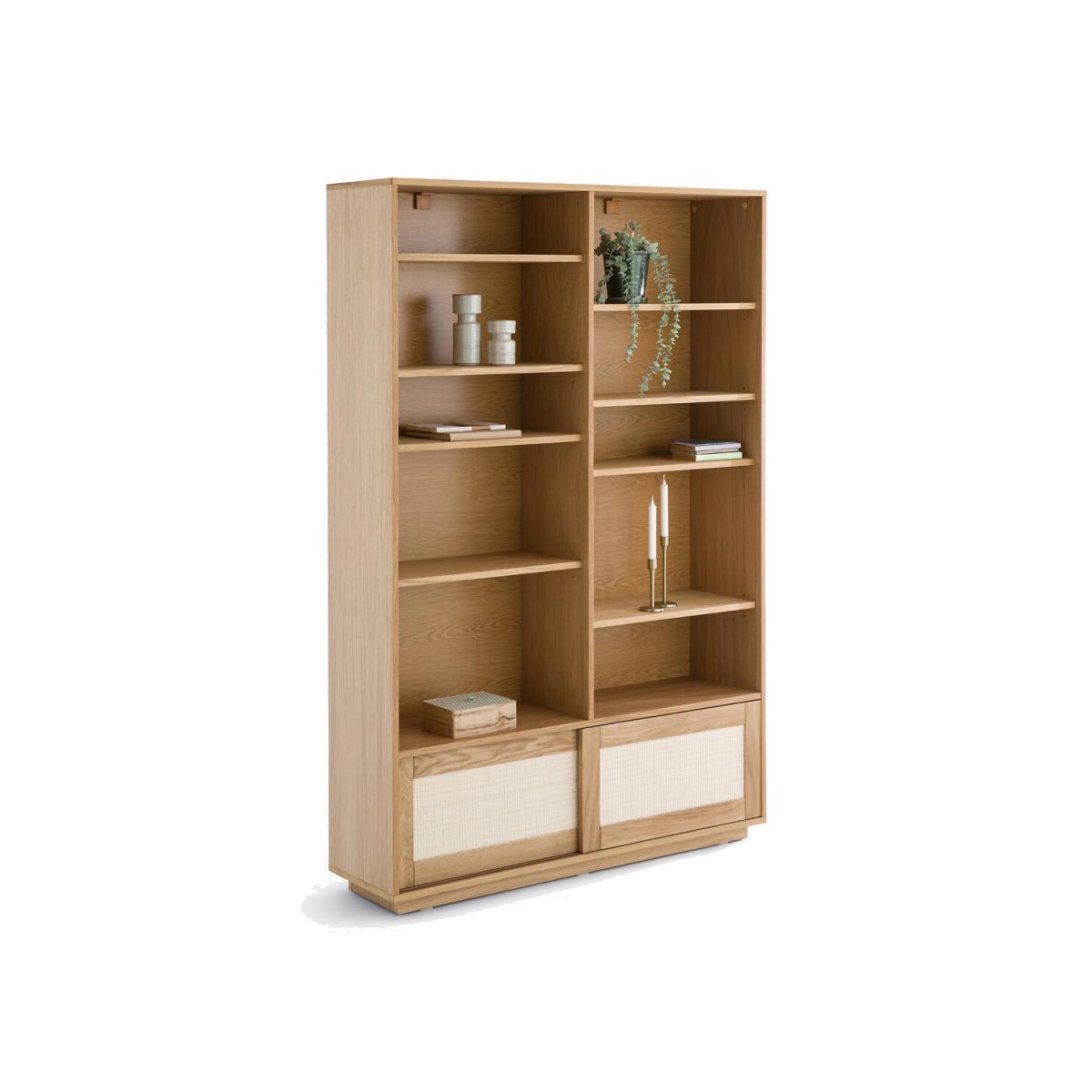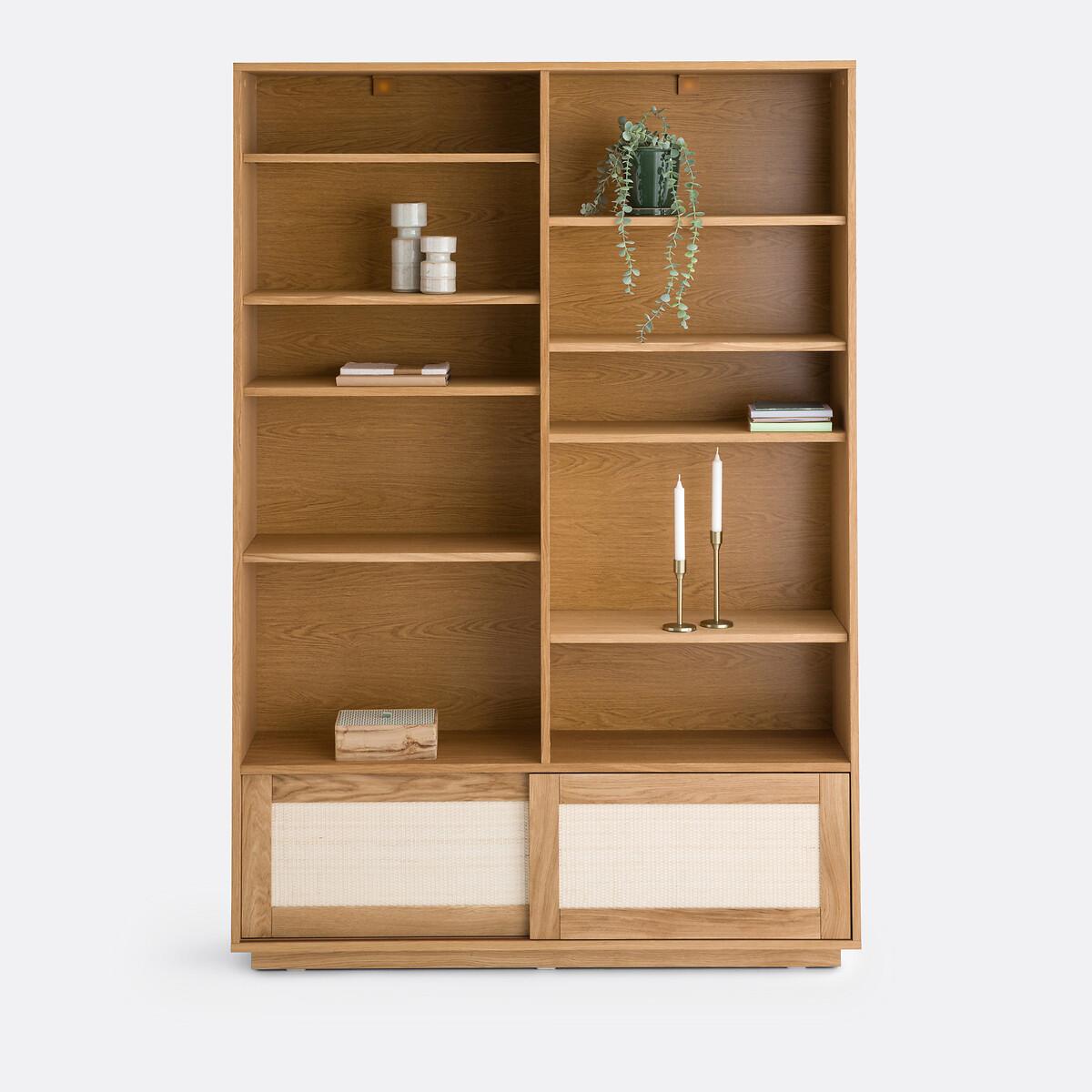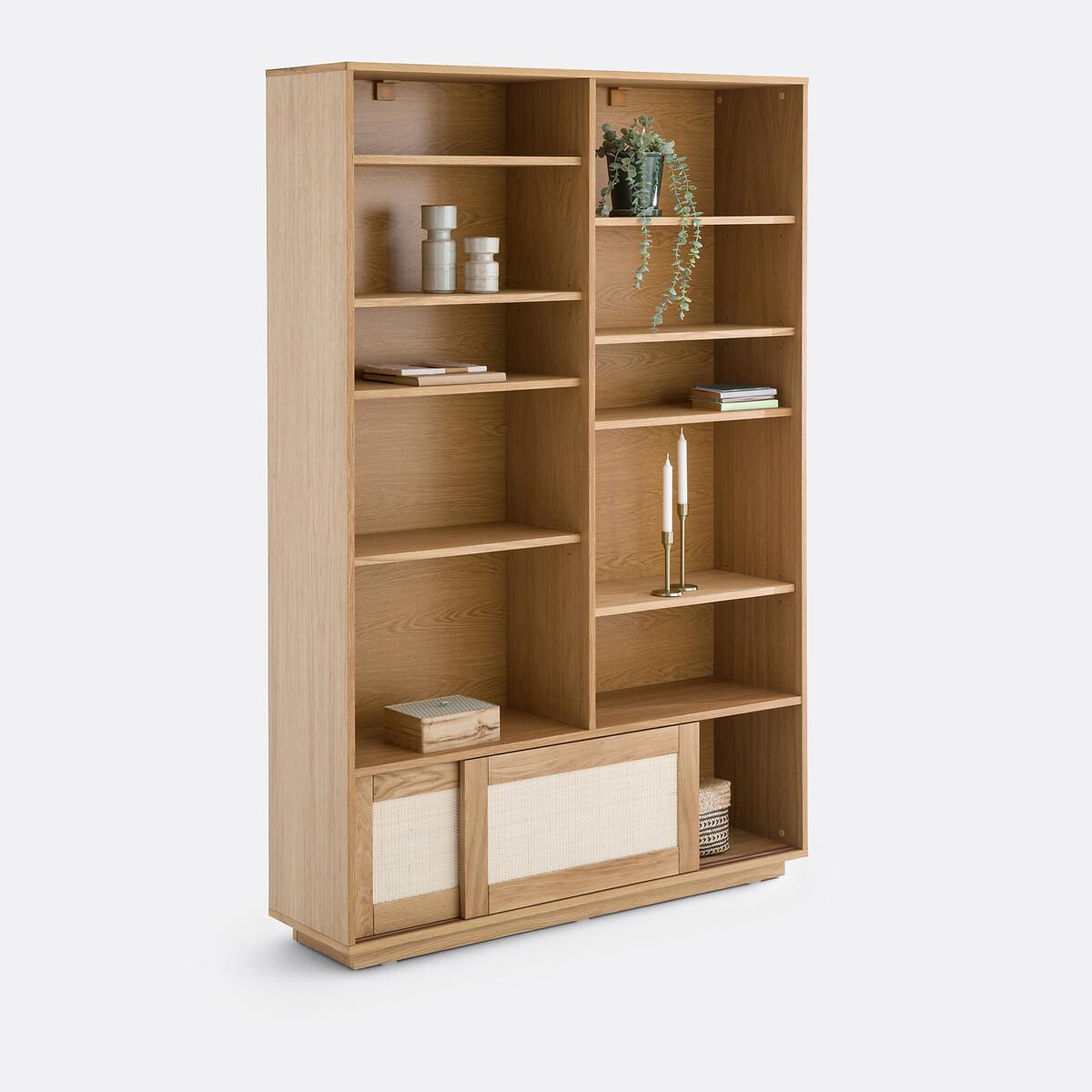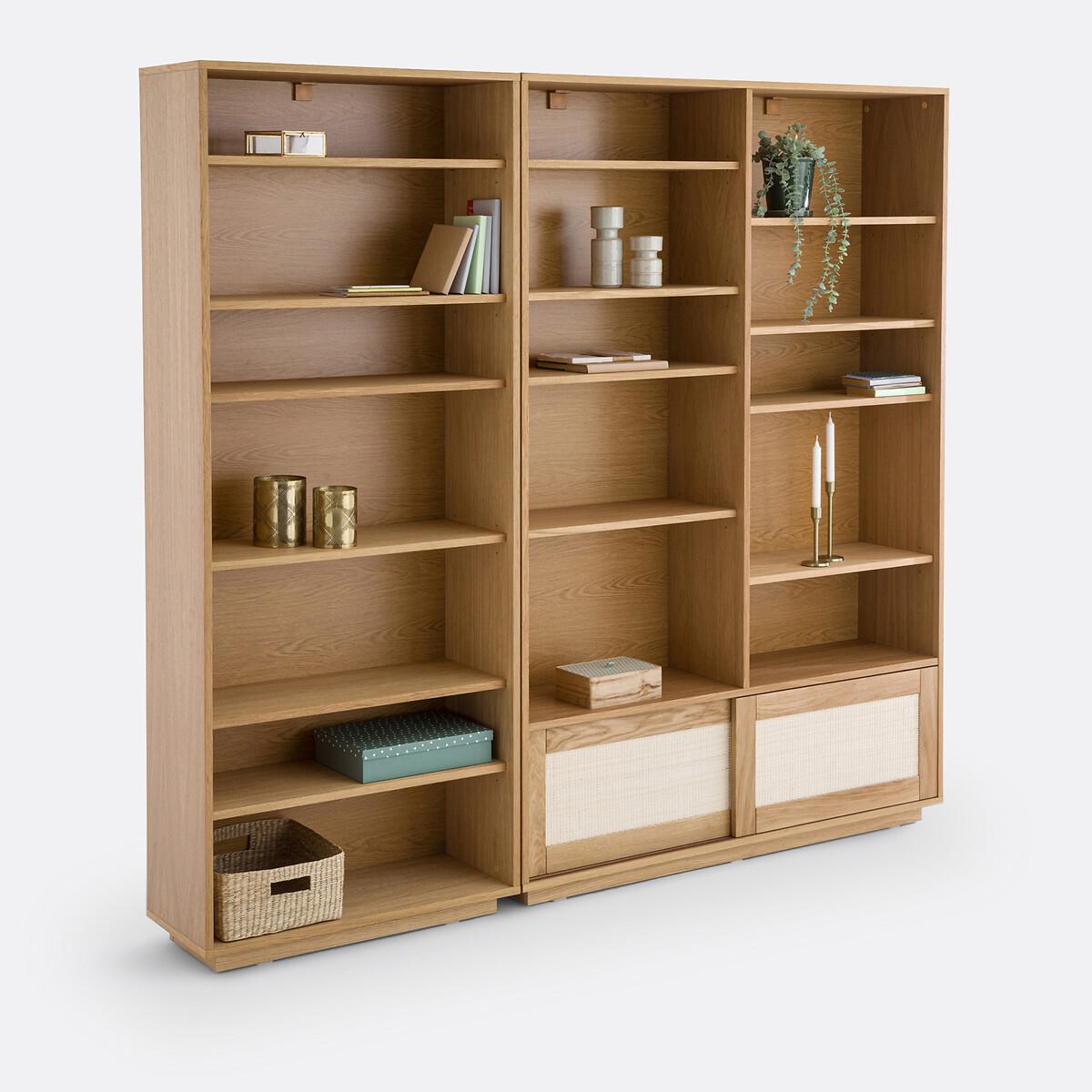 Store, classify, display and showcase your books: create a unique library at home by arranging the different modules of the Palano range. It allows oak modules to be combined with other oak and cane modules. Coordinating contemporary furniture, inspired by the Scandinavian style, to choose and assemble according to your interior. Designed by La Redoute Intérieurs. Made in Europe. Product Details • Apothecary library module • Unit and shelves in oak veneered particle board, clear polyurethane varnish finish • Slightly recessed base in oak veneer particle board • 1 vertical divider, 2 fixed shelves and 6 removable and adjustable shelves, 10 compartments • Lower section: 2 cane veneered sliding doors, solid oak frame, 2 storage compartments • Wall fixing (screws and plugs not supplied)Dimensions. Overall • Width: 146cm • Height: 197cm • Depth: 33cm. Usable space • Dimensions of compartments on the left at the top (excluding shelf): L65 x H65 x D31.5cm • Dimensions of compartments on the left at the bottom (excluding shelf): L65 x H77 x D31.5cm • Dimensions of compartments on the right at the top (excluding shelf): L65 x H65 x D31.5cm • Dimensions of compartments on the right at the bottom (excluding shelf): L75.5 x H67 x D31.5cm • Compartment cupboard dimensions: L65 x H33 x D26cm • Assembly required. • Made in Europe. • WOOD FROM SUSTAINABLY MANAGED FORESTS. FSC® certified wood comes from forests that are environmentally, socially and economically well managed. Dimensions and weight of parcel3 parcels • L109 x H11 x D75cm. 31kg • L152 x H8 x D43cm. 20kg • L201 x H8 x D39cm. 24kg