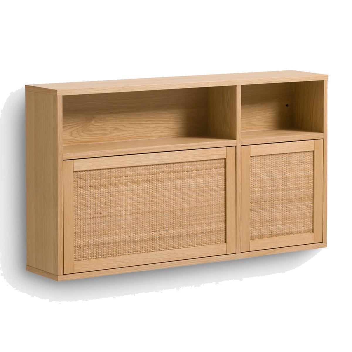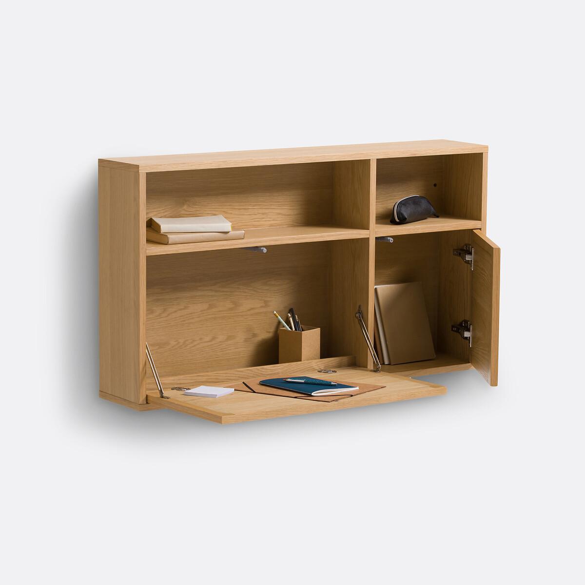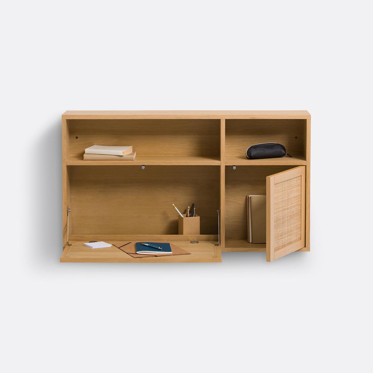 The Palano compact wall desk is part of our Les Ingénieux collection. Creations full of ideas to make life simpler and everyday life more beautiful, imagined by our designers in France.. A contemporary design inspired by Scandinavian style with a small footprint: the Palano desk mixes oak and cane. With its small format, it's ideal for optimising space. Why you'll love this product • Its desktop unfolds in two seconds: to gain work space without losing floor space. • Its multiple compartments - like a mini bureau - allow you to store all office equipment. • When its top is closed (20cm deep), it can be used as a small shelf. • Its cane-plated door adds a trendy touch. • Thanks to its light oak colour, it works with all interiors. Product Details • In oak-veneered MDF and rubberwood, nitrocellulose varnish finish and woven natural rattan • FSC® certified wood • Door on the right, push-pull opening • Folding tray with cylinders for push-pull opening • Storage compartments inside and outside • Cable access hole • Wall fixing (screws and plugs not supplied)Dimensions. Overall • Width: 107cm • Height: 60cm • Depth: Closed 20cm • Weight: 27.4kg. Usable space • Upper open compartments:L66.5 x H18.5 x D16.3cm; L35 x H18.5 x D16.3cm • Compartment behind right door:L35 x H35.5 x D16.3cm• Sold pre-assembled. • WOOD FROM SUSTAINABLY MANAGED FORESTS. FSC® certified wood comes from forests that are environmentally, socially and economically well managed. Dimensions and weight of parcel1 parcel • L117 x H26.5 x D71cm. 32kg