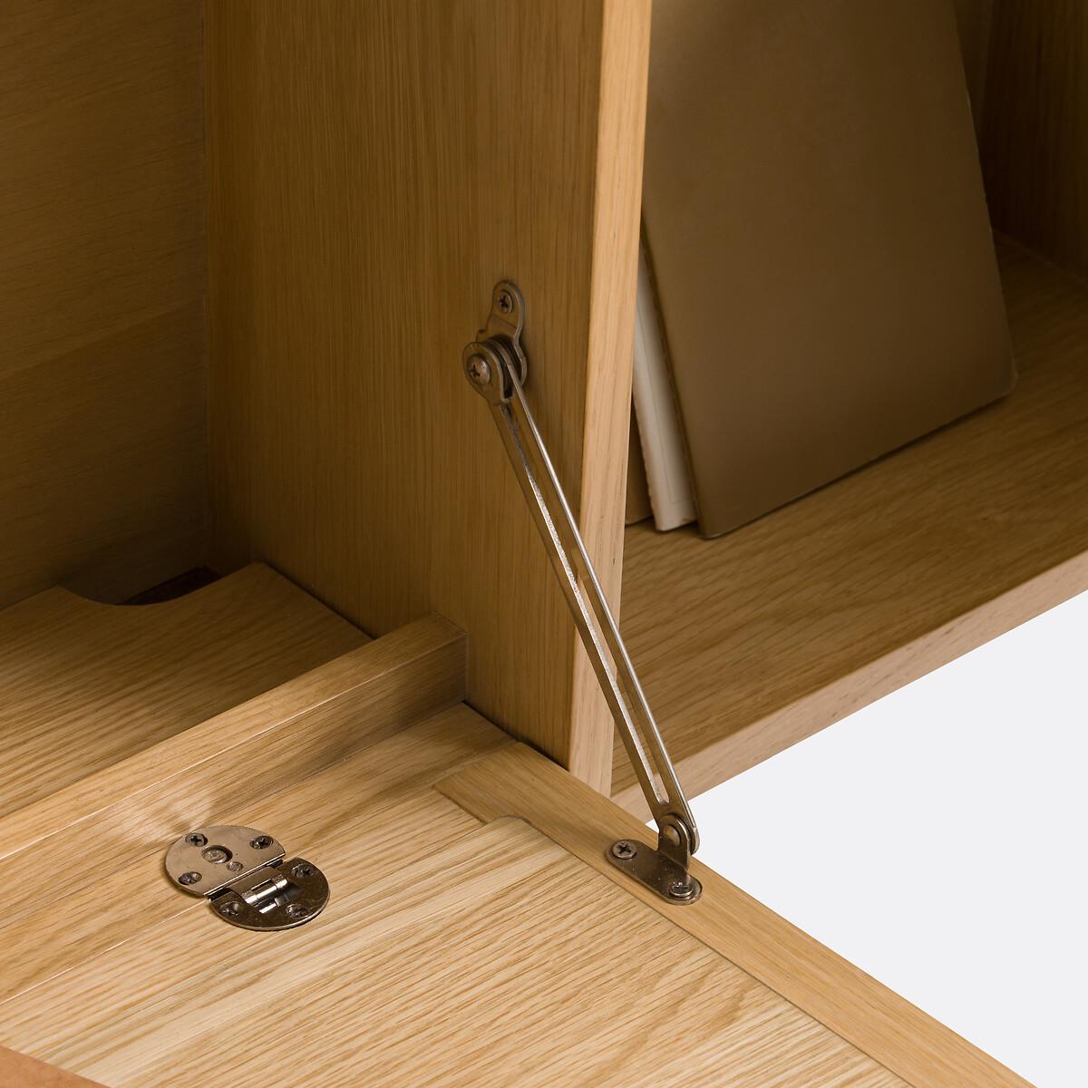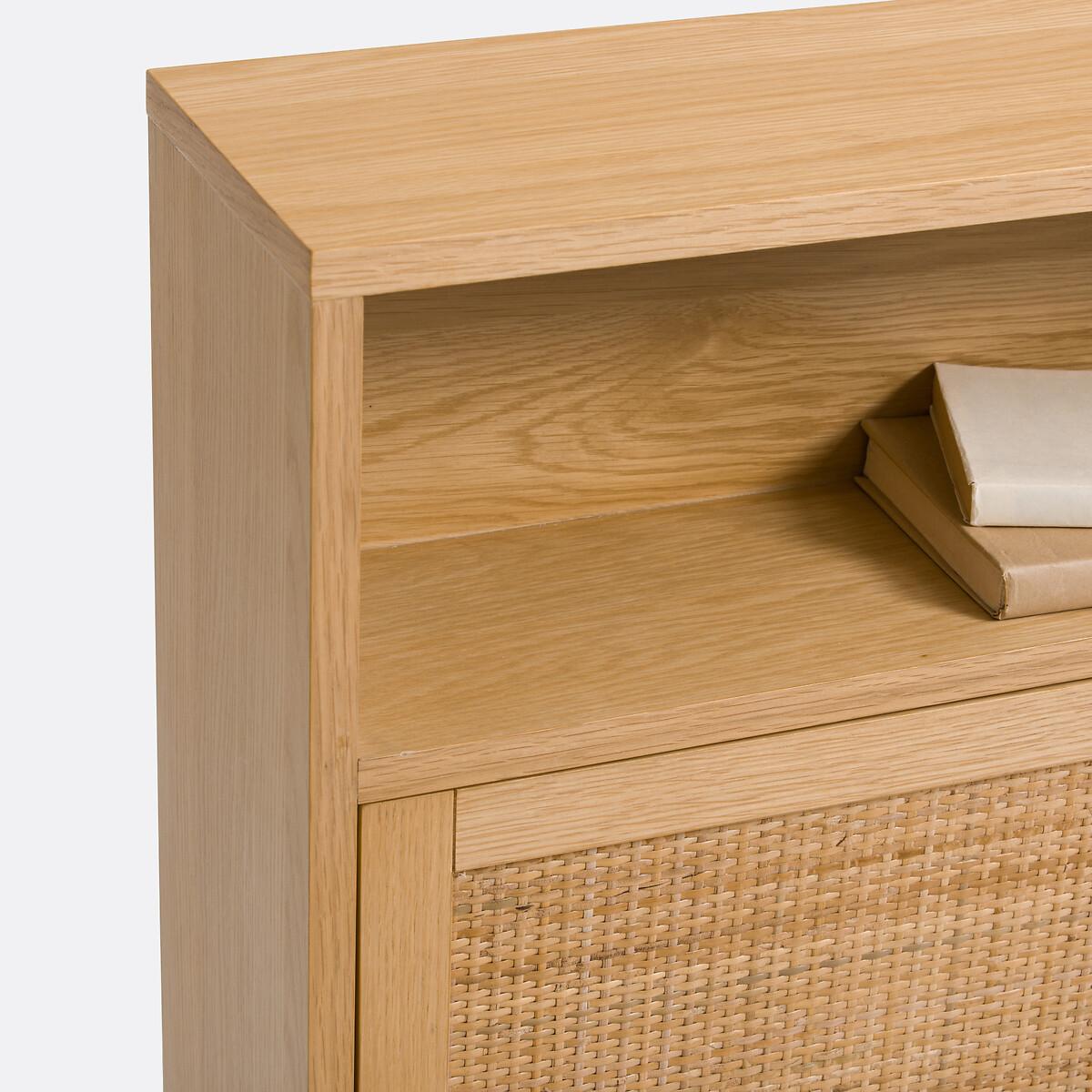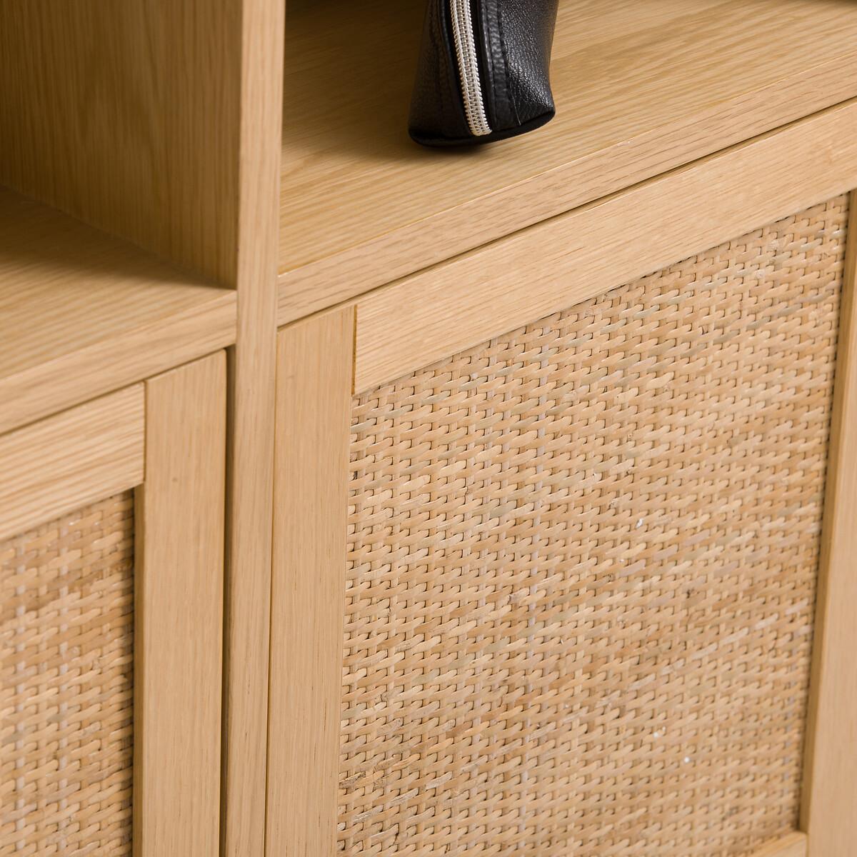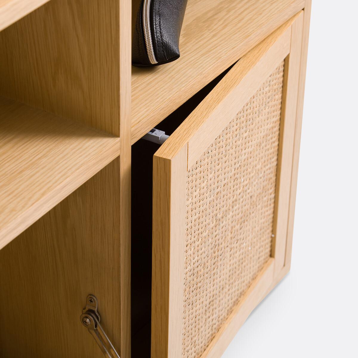 The Palano compact wall desk is part of our Les Ingénieux collection. Creations full of ideas to make life simpler and everyday life more beautiful, imagined by our designers in France.. A contemporary design inspired by Scandinavian style with a small footprint: the Palano desk mixes oak and cane. With its small format, it's ideal for optimising space. Why you'll love this product • Its desktop unfolds in two seconds: to gain work space without losing floor space. • Its multiple compartments - like a mini bureau - allow you to store all office equipment. • When its top is closed (20cm deep), it can be used as a small shelf. • Its cane-plated door adds a trendy touch. • Thanks to its light oak colour, it works with all interiors. Product Details • In oak-veneered MDF and rubberwood, nitrocellulose varnish finish and woven natural rattan • FSC® certified wood • Door on the right, push-pull opening • Folding tray with cylinders for push-pull opening • Storage compartments inside and outside • Cable access hole • Wall fixing (screws and plugs not supplied)Dimensions. Overall • Width: 107cm • Height: 60cm • Depth: Closed 20cm • Weight: 27.4kg. Usable space • Upper open compartments:L66.5 x H18.5 x D16.3cm; L35 x H18.5 x D16.3cm • Compartment behind right door:L35 x H35.5 x D16.3cm• Sold pre-assembled. • WOOD FROM SUSTAINABLY MANAGED FORESTS. FSC® certified wood comes from forests that are environmentally, socially and economically well managed. Dimensions and weight of parcel1 parcel • L117 x H26.5 x D71cm. 32kg