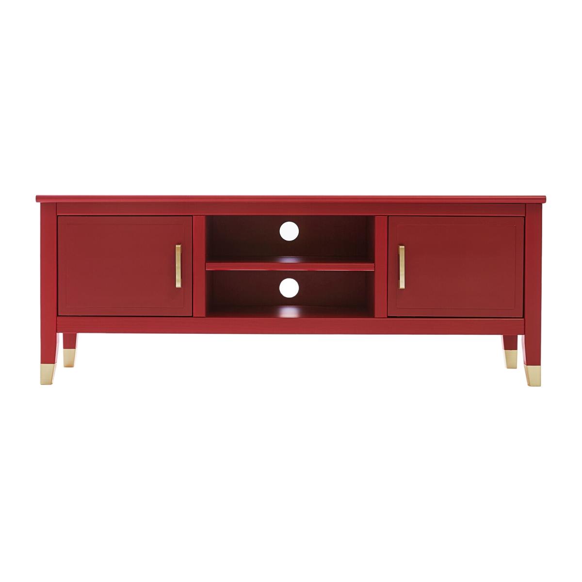 I love the bold pop of colour that this red media unit brings to a room-it can serve as a striking focal point in neutral or monochrome interiors. Its clean lines and functional design make it versatile enough for modern, mid-century, or eclectic spaces. I’d recommend styling it with a few well-chosen accessories like minimal vases or books on top, leaving the open shelves for practical storage or displays. The gold accents on the legs add a touch of sophistication, so pairing it with other metallic accents can help create a cohesive look. It works particularly well in lively family areas or contemporary living rooms where a splash of colour can lift the overall aesthetic without overwhelming the space.