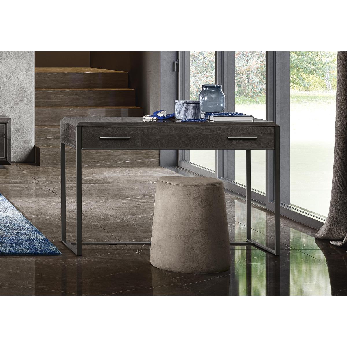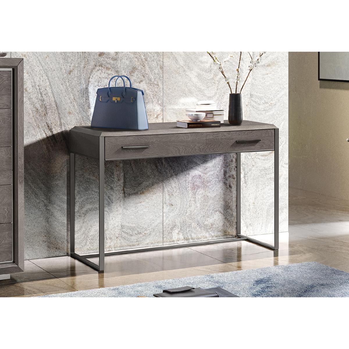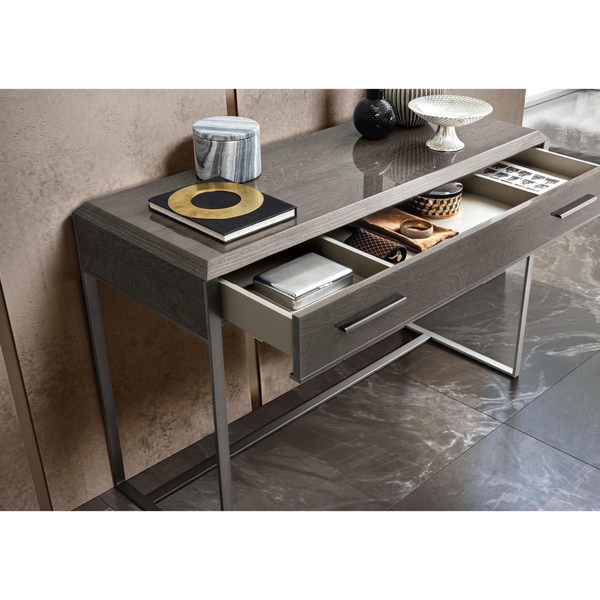 Modern glam style. Gorgeous high-gloss lacquered surfaces. Elegant contemporary details. Meet our Italian bedroom furniture collection Palazzo from Italian brand Modum. This stunning range is as extensive as it is striking. You'll find chests of drawers in all sizes, spacious sliding and hinged wardrobes, and a truly incredible bed frame with a choice of high-gloss or cushioned headboard. Finished in silver birch with a subtle woodgrain effect, pieces showcase bevelled edges and gunmetal grey metallic accents. And everything is made in Italy for that effortless blend of chic style and quality craftsmanship. For more of this fabulous glam look, be sure to discover the Palazzo dining furniture collection. This clean-lined dressing table combines a glam high-gloss finish with bold lines and metallic accents. Functional as well as stylish, it has a single full-width drawer that’s ideal for keeping accessories dust-free. Why you'll love it. The ultimate in gorgeous Italian furniture for bedrooms. Modern glam style. High-gloss lacquered dressing table is striking and stylish. Stunning silver birch finish with a subtle woodgrain effect. Gunmetal grey metallic frame and base. Chrome-effect plinth. Soft-closing drawer with metal handles. Pairs perfectly with the Palazzo stool. Beautifully made in Italy. What you need to know. 1 drawer. The lacquered finish is 4 layers deep, the result of a unique high-tech process. Please note that the lacquered finish may show surface scratches under certain lighting. This dressing table may take time to settle into a carpeted floor. Avoid overfilling or overweighting the drawer. Part of the extensive Italian-made Palazzo bedroom furniture collection. Palazzo is also available as a living and dining room collection. Warning!. This item should be fixed to a wall using the anti-tip wall-hanging kit provided. Be sure to use the correct wall fixings suitable for the walls in your home. Failure to do so could result in injury if this unit tips over unexpectedly or is knocked, pulled down or otherwise displaced. Please note. Our delivery team will not be able to attach this unit to your wall. It will be unwrapped and left for you to install.