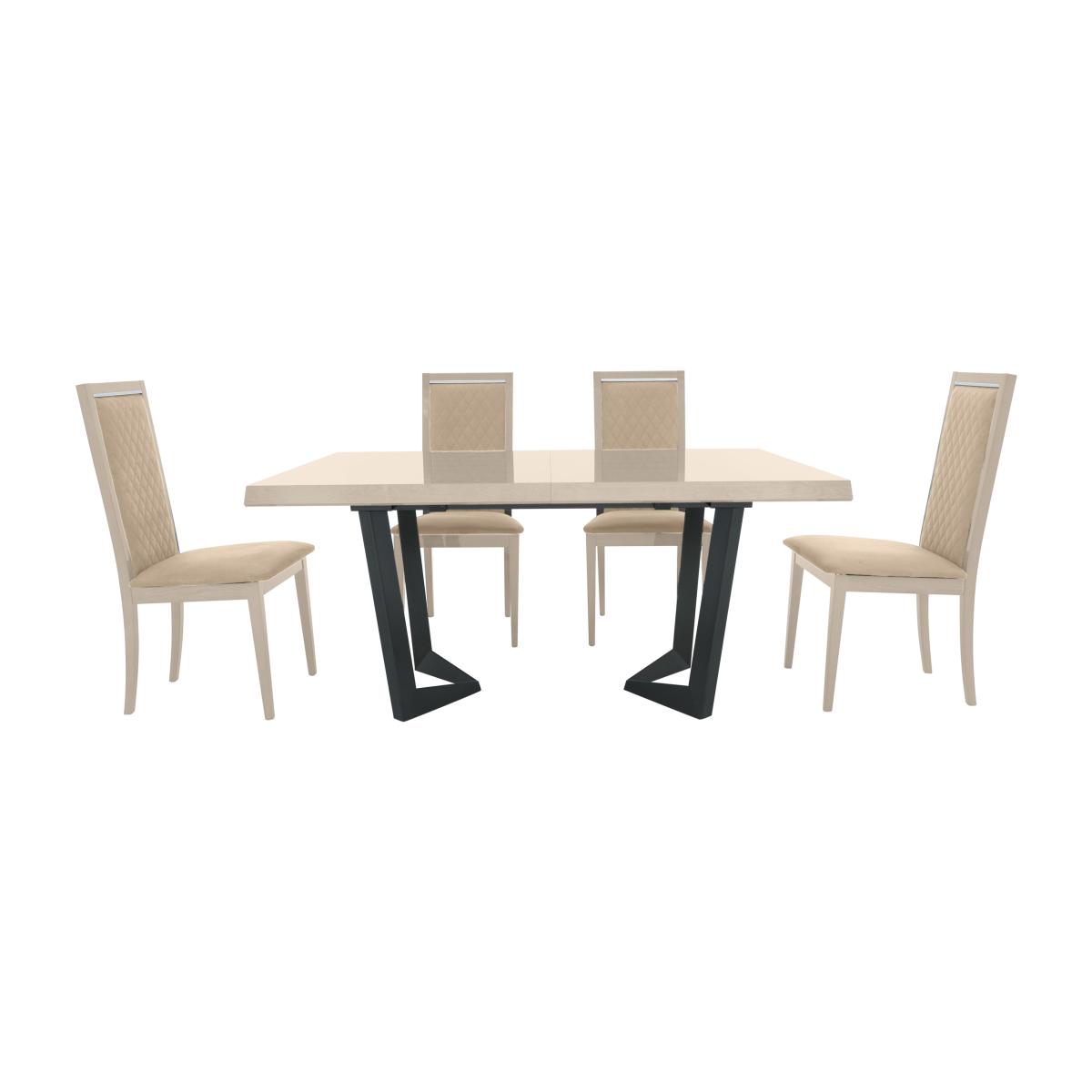 With its sophisticated pale lacquered finish, striking angled base and high-backed dining chairs, this dining set is perfect for a formal dining room – and has more than a hint of cool contemporary style. Why you'll love it. The ultimate in gorgeous Italian furniture. Modern glam style. Extending high-gloss dining table makes a striking statement. Sand birch lacquered top and tapered edges feature a continuous woodgrain effect. Powder-coated stainless steel angled base. Table smoothly slides apart to accommodate up to 4 extension leaves. 2 extension leaves are included; additional leaves are available separately. This dining set includes 4 formal dining chairs with elegant high backs. Meticulous diamond-pattern stitching on inner and outer chair backs. Upholstered in a selection of stain-repellent fabric styles and colours. High-gloss lacquered legs and frame have a woodgrain effect in a choice of 3 colours. Beautifully made in Italy. What you need to know. Chair frame is made with solid beech wood. Seat cushioning is made of foam. Dining table is supplied with 2 extension leaves. Additional extension leaves may be purchased separately. Dining table accommodates a maximum of 4 extension leaves. With 4 extension leaves, this 160 cm table extends to 360 cm. Seats 8 and up to 12 with 4 extension leaves. Extension leaves cannot be stored within the body of the table. The lacquered finish is 4 layers deep, the result of a unique high-tech process. Please note that the lacquered finish may show surface scratches under certain lighting. Part of the extensive Italian-made Palazzo living and dining collection. Dining sets are available with different high-gloss table finishes and styles of dining chair. Palazzo is also available as a bedroom furniture collection.
