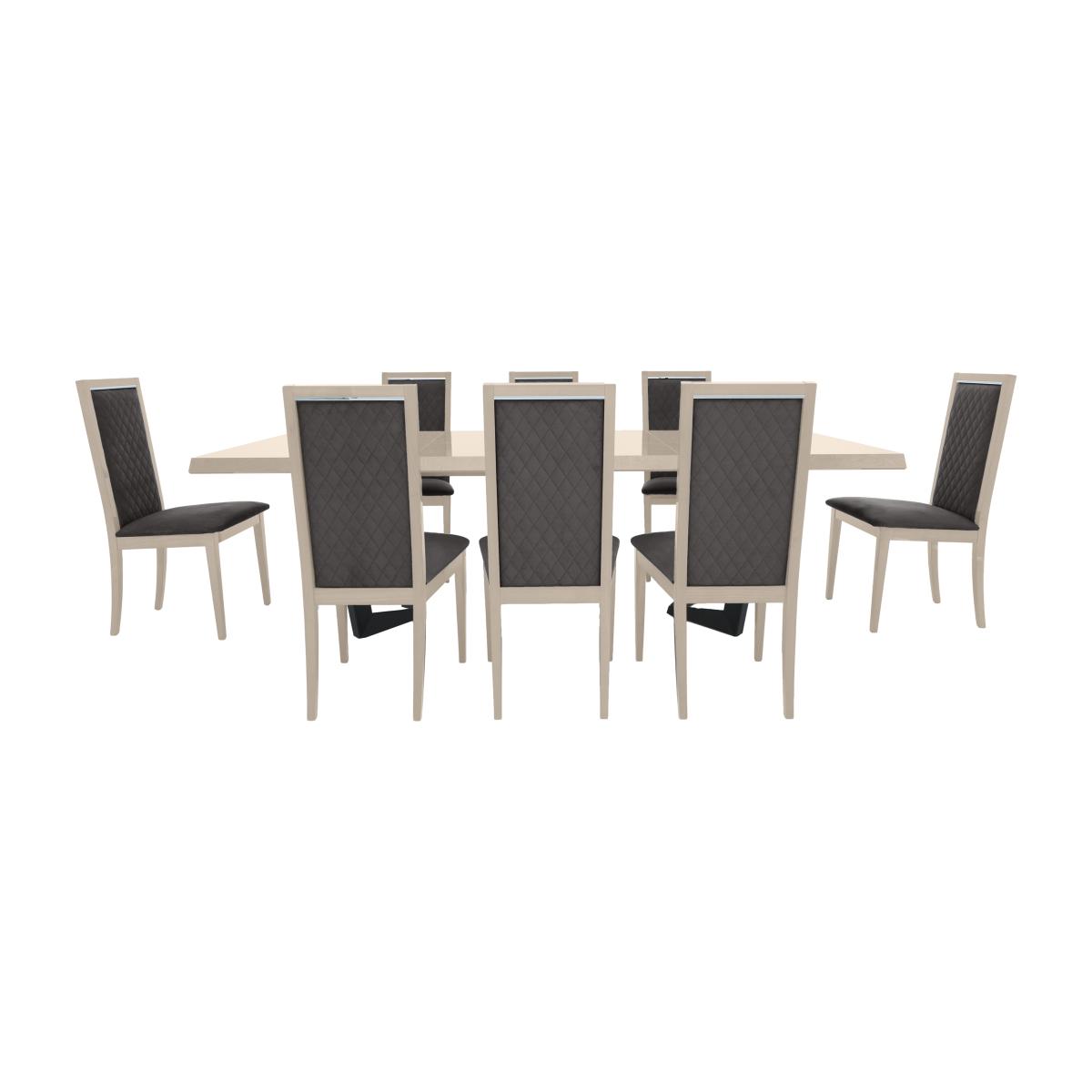 Stylish design meets exceptional craftsmanship in this Italian dining set. With its lacquered top and stainless steel base, this extending dining table is the essence of statement dining. Why you'll love it. The ultimate in gorgeous Italian furniture. Modern glam style. Extending high-gloss dining table makes a striking statement. Sand birch lacquered top and tapered edges feature a continuous woodgrain effect. Powder-coated stainless steel angled base. Table smoothly slides apart to accommodate up to 4 extension leaves. 2 extension leaves are included; additional leaves are available separately. This dining set includes 8 formal dining chairs with elegant high backs. Meticulous diamond-pattern stitching on inner and outer chair backs. Upholstered in a selection of stain-repellent fabric styles and colours. High-gloss lacquered legs and frame have a woodgrain effect in a choice of 3 colours. Beautifully made in Italy. What you need to know. Chair frame is made with solid beech wood. Seat cushioning is made of foam. Dining table is supplied with 2 extension leaves. Additional extension leaves may be purchased separately. Dining table accommodates a maximum of 4 extension leaves. With 4 extension leaves, this 160 cm table extends to 360 cm. Seats 8 and up to 12 with 4 extension leaves. Extension leaves cannot be stored within the body of the table. The lacquered finish is 4 layers deep, the result of a unique high-tech process. Please note that the lacquered finish may show surface scratches under certain lighting. Part of the extensive Italian-made Palazzo living and dining collection. Dining sets are available with different high-gloss table finishes and styles of dining chair. Palazzo is also available as a bedroom furniture collection.
