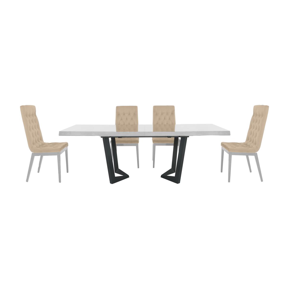 With its flawless high-gloss finish and superb craftsmanship, our 100% made in Italy Palazzo dining range from Italian brand Modum is the very essence of modern Italian furniture style. From dining sets to sideboards and occasional tables to curio cabinets, the collection’s gorgeous lacquered surfaces are enhanced with a subtle woodgrain pattern, bevelled edges and gunmetal grey metallic accents. Effortless contemporary style is matched by practical design choices like push to open drawers and built-in LED cabinet lighting. At the heart of the collection is the Palazzo extending dining table which includes two extension leaves and can accommodate two more for an absolutely stunning dining table that’s a full four metres in length. Love Palazzo’s fabulous glam style? It’s also available as a bedroom furniture collection. This Italian made extending dining table and four buttoned dining chairs is a real showstopper. You’ll love the quality build and stunning looks in your dining room. Why you'll love it This large extending dining table offers plenty of glamorous seating. Modern glam style. Extending high-gloss dining table makes a striking statement. Glossy white lacquered top with tapered edges. Powder-coated stainless steel angled base. Table smoothly slides apart to accommodate up to 4 extension leaves. Fully extended, this dining table is a very impressive 4 metres. 2 extension leaves are included; additional leaves are available separately. Set includes 4 dining chairs with lavish seat and inside back buttoning. Upholstered in a selection of stain-repellent fabric styles and colours. Lacquered top also available with a woodgrain effect in a choice of colours. Part of the extensive Palazzo living and dining collection. This dining set is beautifully made in Italy. What you need to know Chair legs are made with solid beech wood. Seat cushioning is made of foam. Dining table is supplied with 2 extension leaves. Additional extension leaves may be purchased separately. Dining table accommodates a maximum of 4 extension leaves. Up to 2 extension leaves can be stored within the table. With 4 extension leaves, this 200 cm table extends to 400 cm. Seats 10 and up to 14 with 4 extension leaves. The lacquered finish is 4 layers deep, the result of a unique high-tech process. Please note that the lacquered finish may show surface scratches under certain lighting. Part of the extensive Italian-made Palazzo living and dining collection. Dining sets are available with different high-gloss table finishes and styles of dining chair. Palazzo is also available as a bedroom furniture collection.