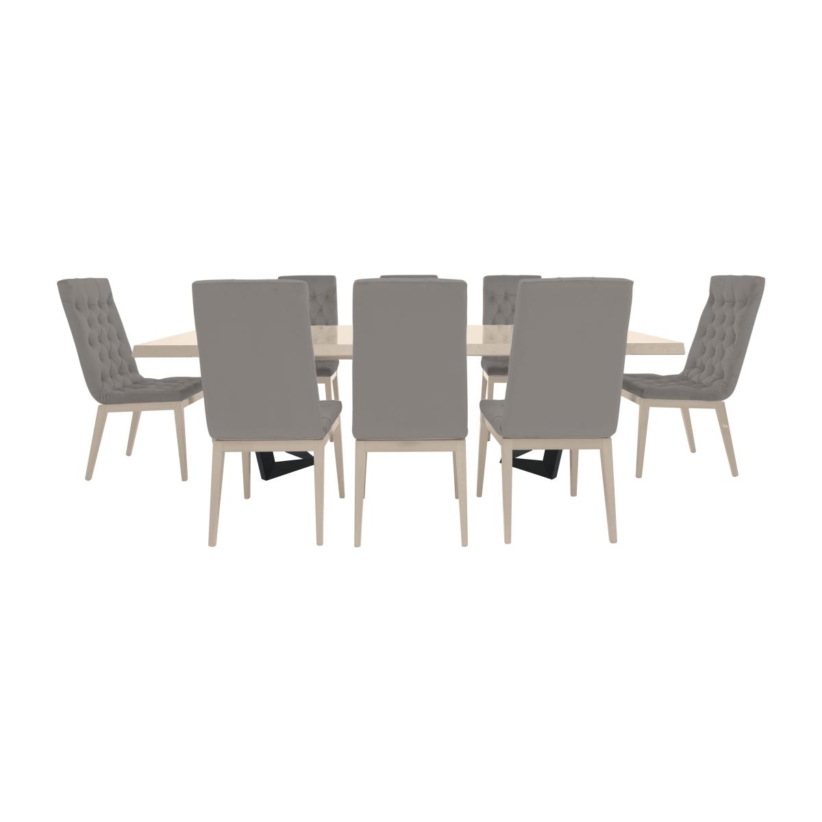Large and luxe, this high-gloss extending dining table is the very essence of modern glam Italian style. We love its lacquered top in pale sand birch and bold angled base. Why you'll love it. The ultimate in gorgeous Italian furniture. Modern glam style. Extending high-gloss dining table makes a striking statement. Sand birch lacquered top and tapered edges feature a continuous woodgrain effect. Powder-coated stainless steel angled base. Table smoothly slides apart to accommodate up to 4 extension leaves. Fully extended, this dining table is a very impressive 4 metres. 2 extension leaves are included; additional leaves are available separately. Set includes 8 dining chairs with lavish seat and inside back buttoning. Upholstered in a selection of stain-repellent fabric styles and colours. High-gloss lacquered legs with a woodgrain effect in a choice of 3 colours. Beautifully made in Italy. What you need to know. Chair legs are made with solid beech wood. Seat cushioning is made of foam. Dining table is supplied with 2 extension leaves. Additional extension leaves may be purchased separately. Dining table accommodates a maximum of 4 extension leaves. With 4 extension leaves, this 200 cm table extends to 400 cm. Seats 10 and up to 14 with 4 extension leaves. Extension leaves cannot be stored within the body of the table. The lacquered finish is 4 layers deep, the result of a unique high-tech process. Please note that the lacquered finish may show surface scratches under certain lighting. Part of the extensive Italian-made Palazzo living and dining collection. Dining sets are available with different high-gloss table finishes and styles of dining chair. Palazzo is also available as a bedroom furniture collection.