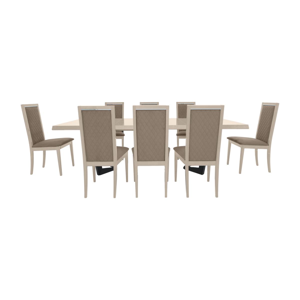 This beautifully crafted Italian dining set includes a very large 14-seater extending dining table with a pale high-gloss lacquered finish, and eight elegant dining chairs. Why you'll love it. The ultimate in gorgeous Italian furniture. Modern glam style. Extending high-gloss dining table makes a striking statement. Sand birch lacquered top and tapered edges feature a continuous woodgrain effect. Powder-coated stainless steel angled base. Table smoothly slides apart to accommodate up to 4 extension leaves. Fully extended, this dining table is a very impressive 4 metres. 2 extension leaves are included; additional leaves are available separately. This dining set includes 8 formal dining chairs with elegant high backs. Meticulous diamond-pattern stitching on inner and outer chair backs. Upholstered in a selection of stain-repellent fabric styles and colours. High-gloss lacquered legs and frame have a woodgrain effect in a choice of 3 colours. Beautifully made in Italy. What you need to know. Chair frame is made with solid beech wood. Seat cushioning is made of foam. Dining table is supplied with 2 extension leaves. Additional extension leaves may be purchased separately. Dining table accommodates a maximum of 4 extension leaves. With 4 extension leaves, this 200 cm table extends to 400 cm. Seats 10 and up to 14 with 4 extension leaves. Extension leaves cannot be stored within the body of the table. The lacquered finish is 4 layers deep, the result of a unique high-tech process. Please note that the lacquered finish may show surface scratches under certain lighting. Part of the extensive Italian-made Palazzo living and dining collection. Dining sets are available with different high-gloss table finishes and styles of dining chair. Palazzo is also available as a bedroom furniture collection.