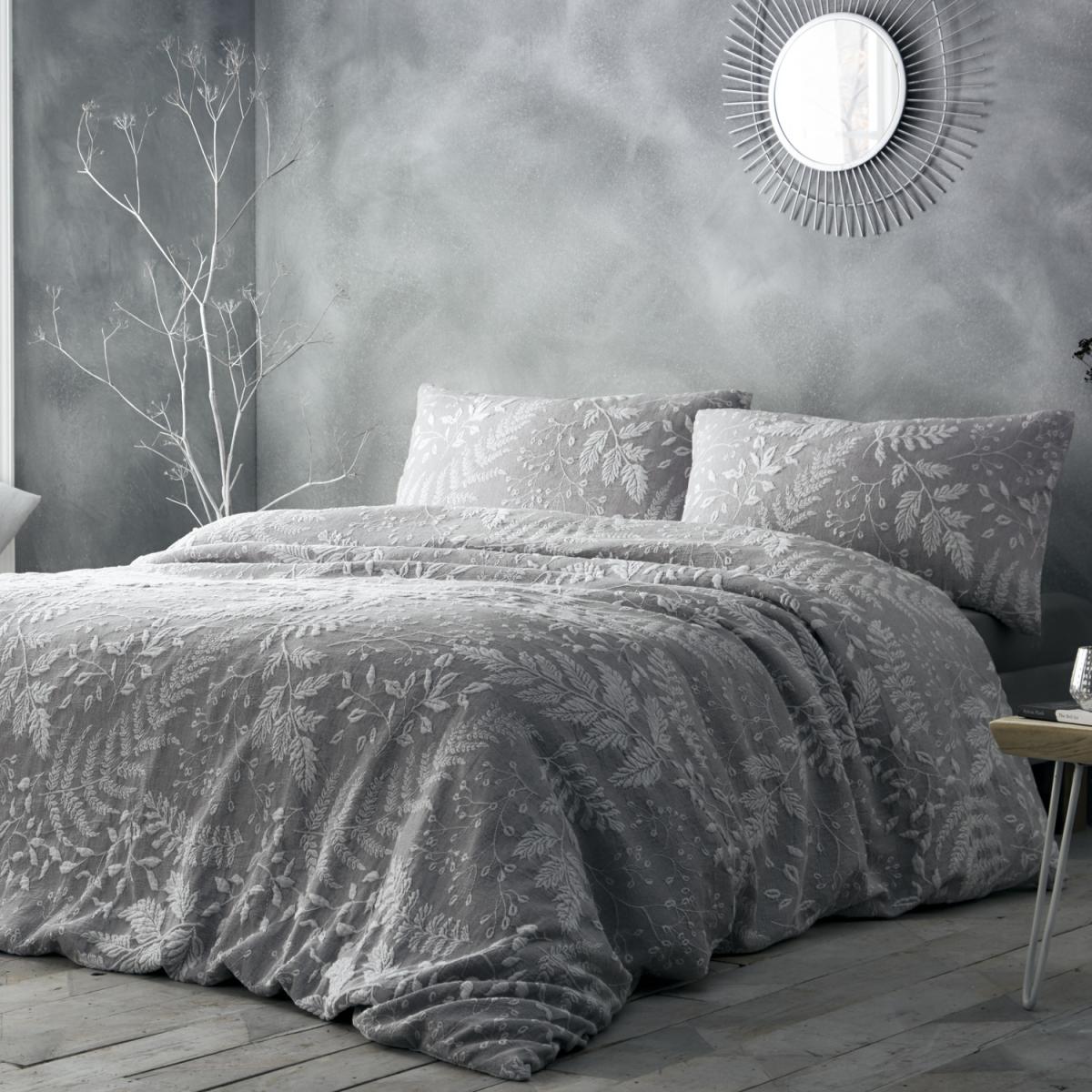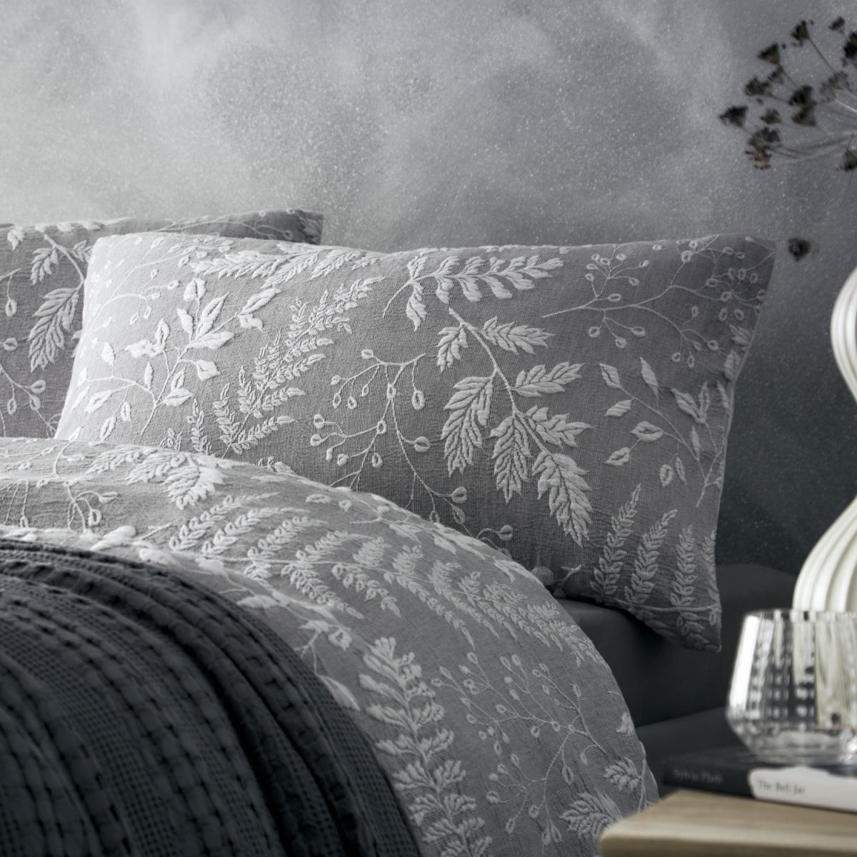 Elegant grey and white tones are combined on the Palazzo Duvet Cover and Pillowcase Set to create a luxury jacquard relief duvet that explores delicate leaves and woodland florals. The use of knit, embroidery, and tassels infuses your room with texture, and matching cushions are available for a complete and coordinated appearance.