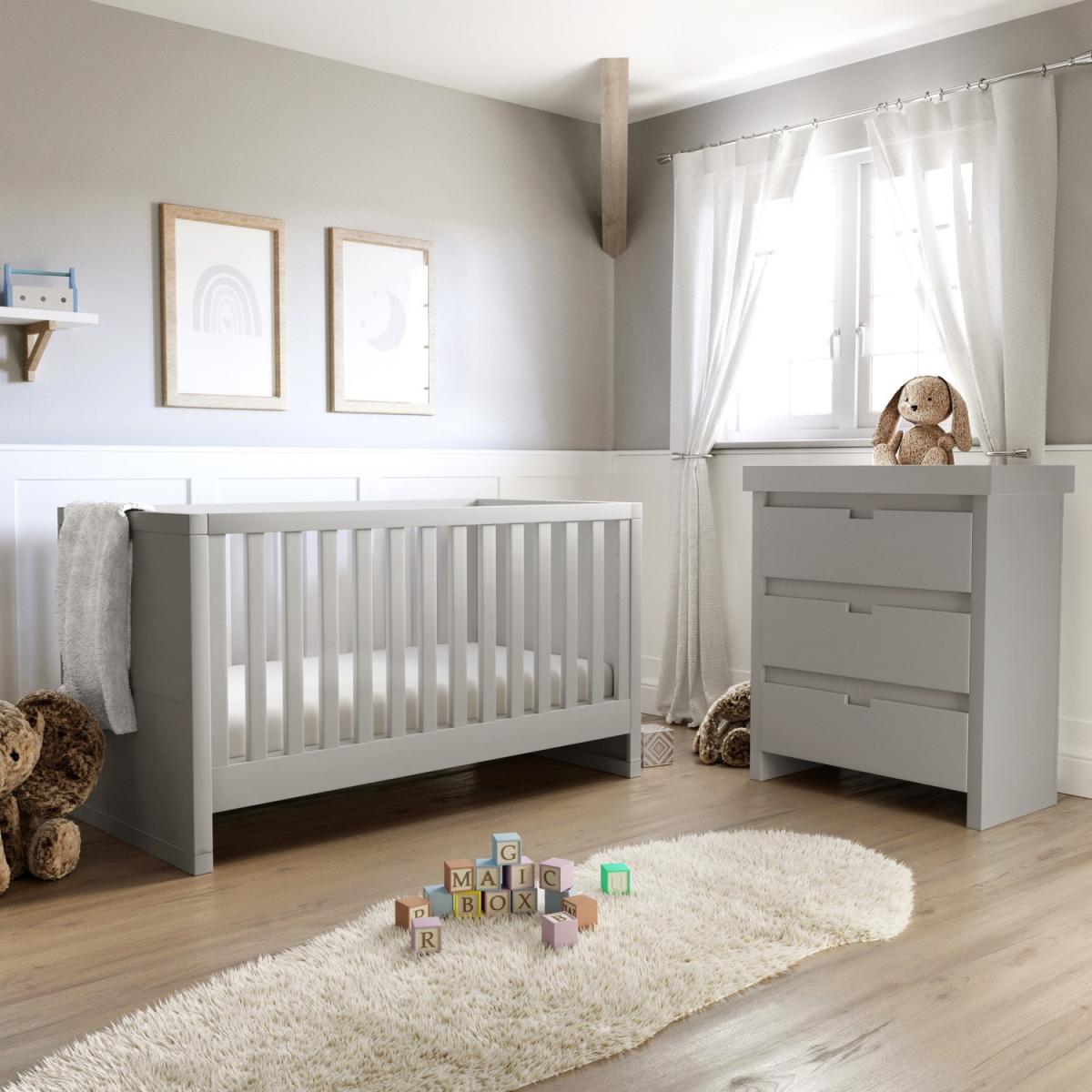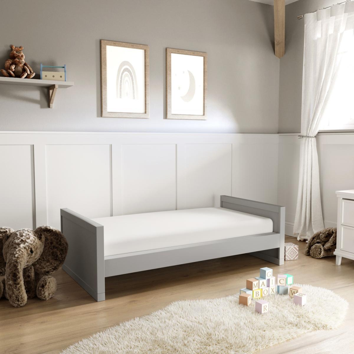 Features we love Converts to a toddler bed that lasts up to 4 years old Contemporary grey finish would suit any modern nursery. Three cot base height positions to aid baby’s growth. Made from organically sourced New Zealand Pine A matching 3-drawer changing station is also available All about me. This Mason grey cot bed would make a modern yet cosy addition to your baby's nursery. It has three adjustable cot base heights to enable you to lift your child in and out with ease. When they're ready or able to climb out it easily converts to a toddler bed and it even has room for a bed guard to make the transition easy. Add the matching three drawer changing station to complete the look. Need to know. Packaging dimensions. Box 1 W49 x D82 x H19 cm / Box 2 W75 x D148 x H9 cm Packaging weight. Box 1 19.5kg / Box 2 17 kg Product dimensions. W74.8 x D149 x H84 cm Age range. From birth until 4 years old Product weight. 36.5kg Bed mattress size. 140 x 70 cm Colour. Pale grey Finish. Painted Material. Pinewood and MDF covered ends Bed base. Wooden slatted For use. Indoors Assembly required. Yes Mattress included. No. Conforms to European safety standard EN 716 2008+A1 2013 and British safety standard BS 8509 2008+A1 2011.