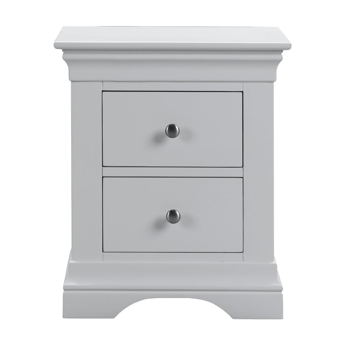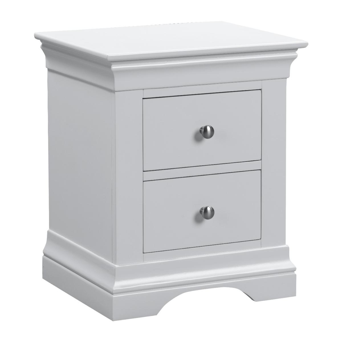 Features we love Elegant French design with a contemporary feel. Finished with pale grey paint suitable for any decor. Two drawers for storing your night-time essentials. Featuring high quality rounded brushed silver handles. Delivered fully assembled. Need to know. Overall Dimensions. W50 x D41 x H59.8 cm Each internal drawer dimensions. W27.8 x D27.6 x H14 cm Colour. Pale Grey Finish. Painted Material. Pine and MDF Weight. 15.5kg Assembly required. No..