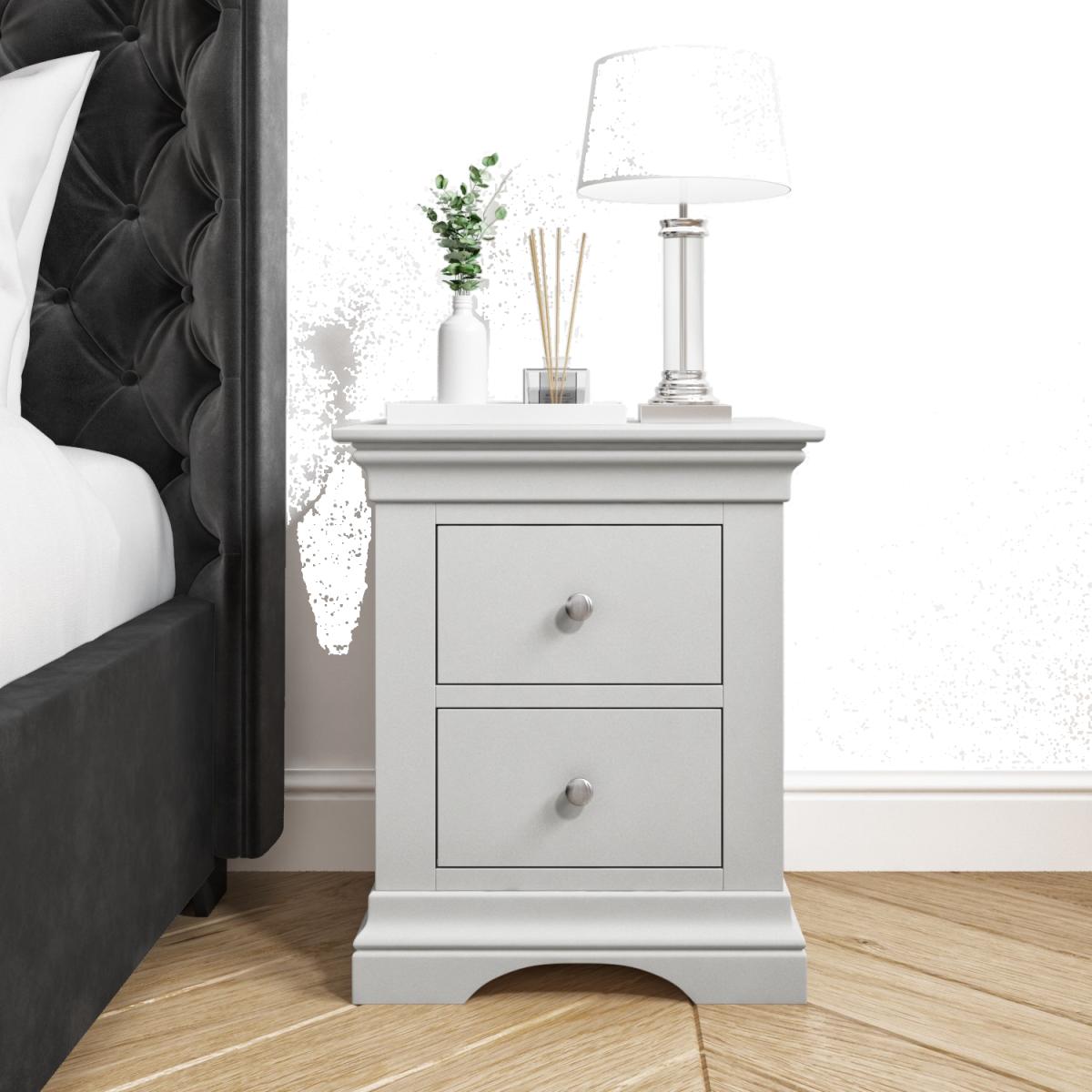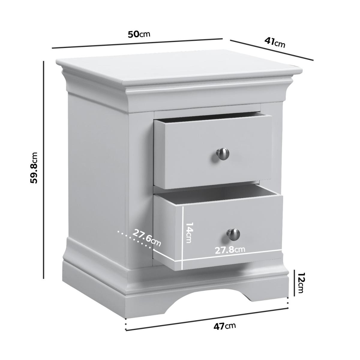 Features we love Elegant French design with a contemporary feel Finished with pale grey paint, suitable for any decor Two drawers for storing your night-time essentials Featuring high quality rounded, brushed silver handles Delivered fully assembled Need to know Overall Dimensions:W50 x D41 x H59.8 cm Each internal drawer dimensions:W27.8 x D27.6 x H14 cm Colour:Pale Grey Finish: Painted Material: Pine and MDF Weight: 15.5kg Assembly required: No