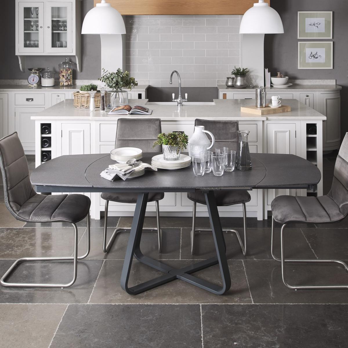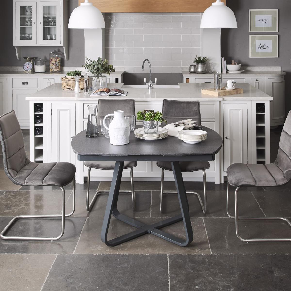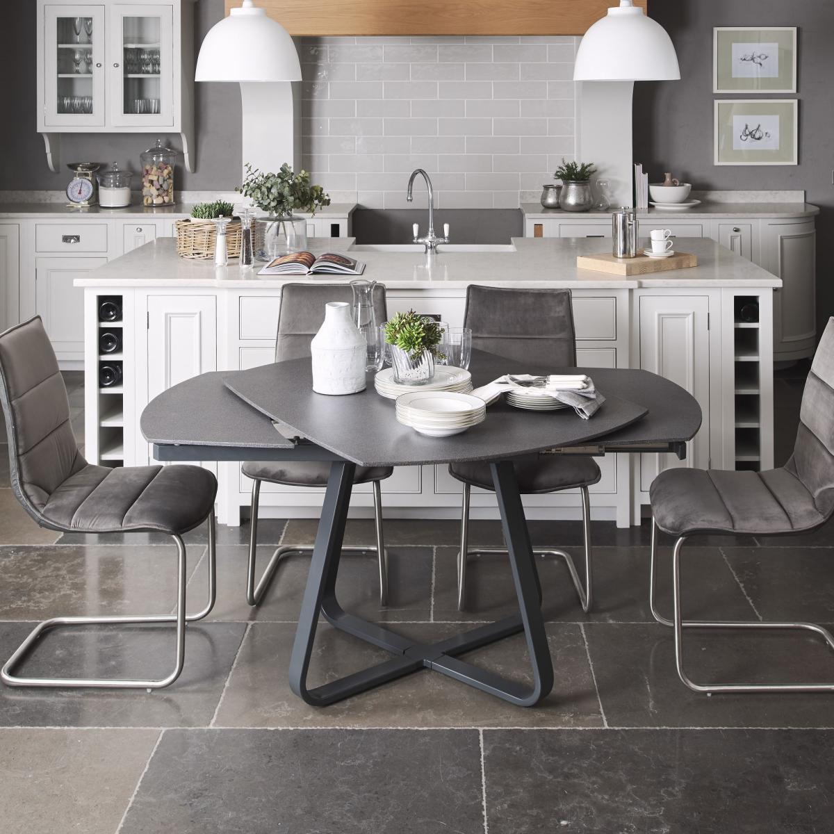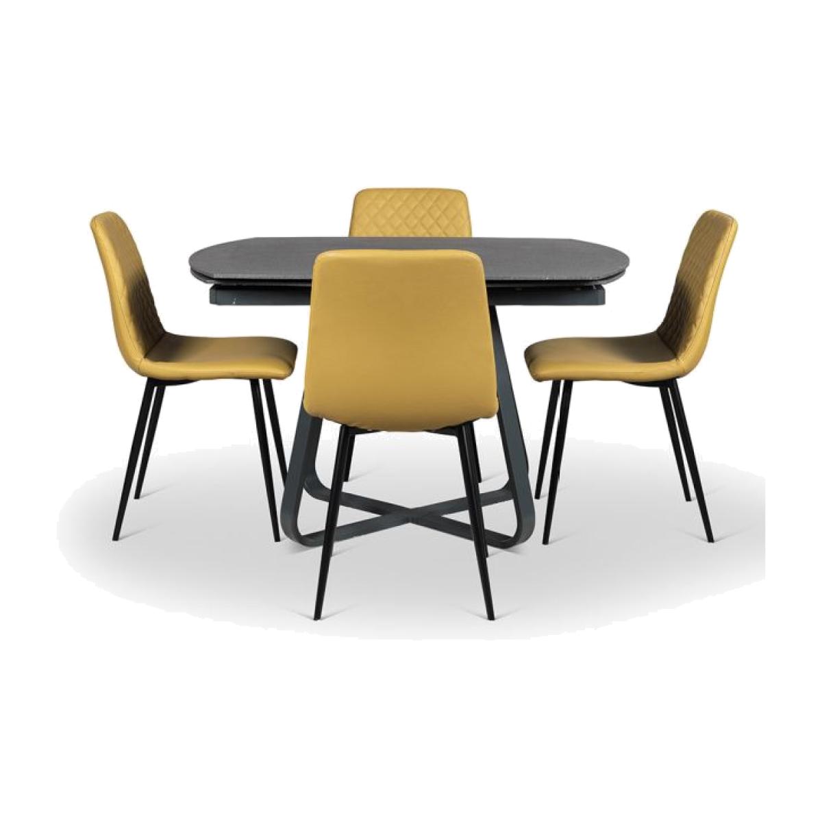 Perfect for any modern home our dining bundle including the Palermo Motion Dining Table and four Ripley Dining Chairs in Mustard is a stunning contemporary set. The table extends with a smooth motion of turning the centre platter and features a durable grey coated tempered glass top. Paired with the Ripley chairs that are upholstered in a faux leather fabric with diamond quilted back detail and sit on top of modern black metal legs this combination dining bundle would look fabulous in any home.