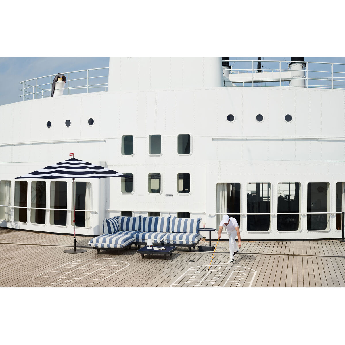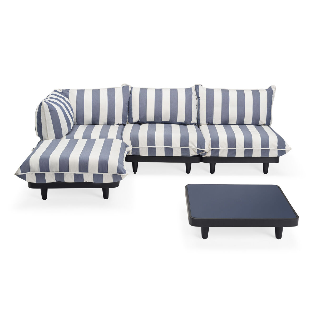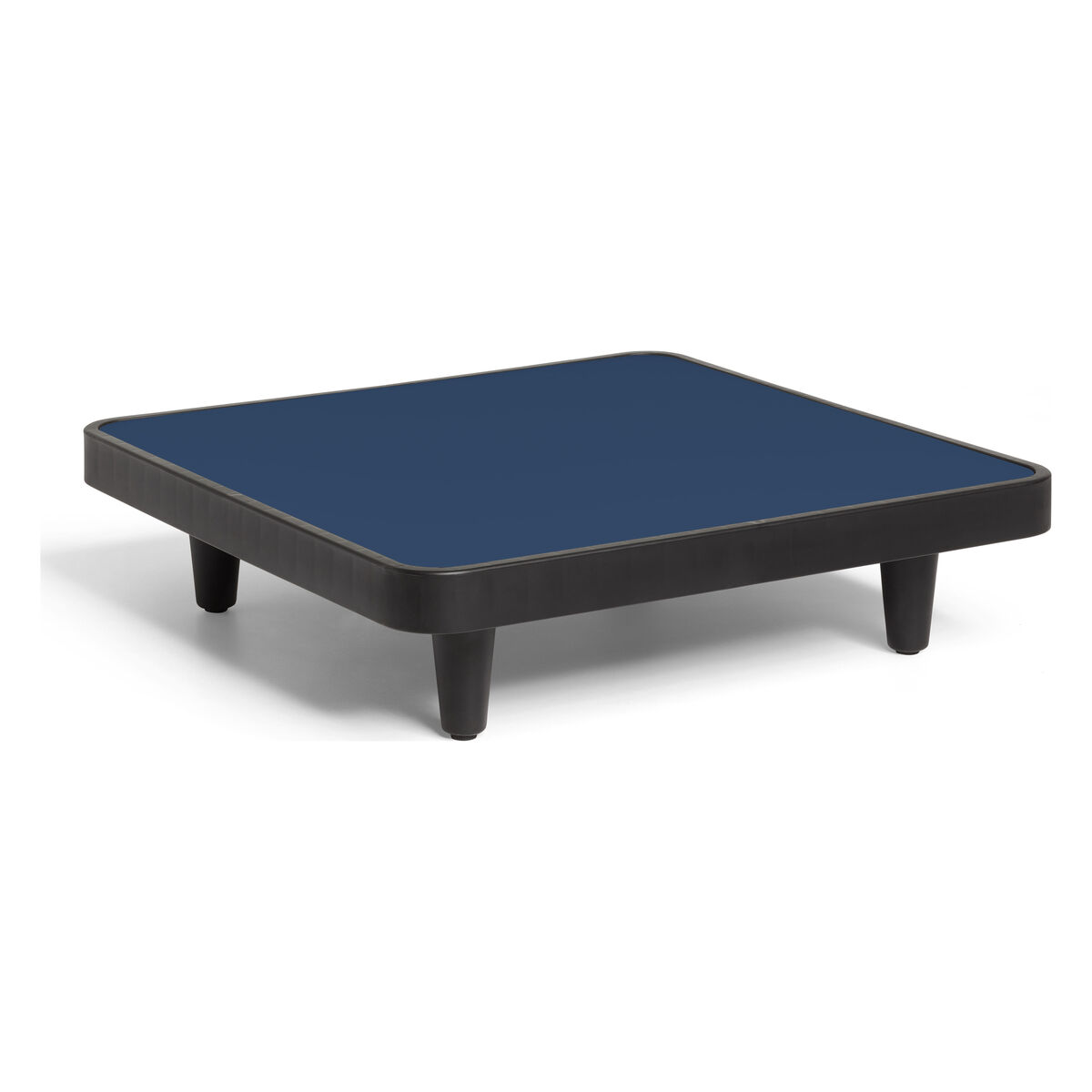 Modular design, modern lines, highly comfortable padded seats: the Paletti collection lets you compose a great outside seating area. The design of the Paletti range takes inspiration from stackable and easy-to-store transport pallets. Use the different models from the collection to create a bespoke paradise for relaxing in no time at all. Combine, invite and relax. With its urban look, both casual and elegant, Paletti will make a splash in a garden, by the pool or on a terrace. The materials are resistant to outdoor conditions and hard-wearing. The Paletti collection includes a fireside chair, a corner fireside chair, a pouffe and a coffee table that make up a complete living room. The Paletti coffee table creates a nice contrast of materials and colours. The aluminium top is encircled by a charcoal grey border which gives it originality and sophistication. The base is made of recycled polyethylene.