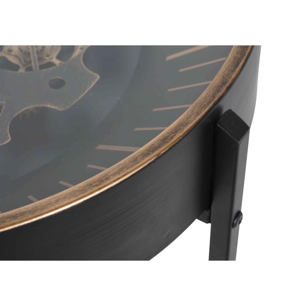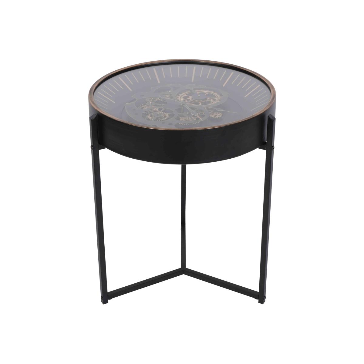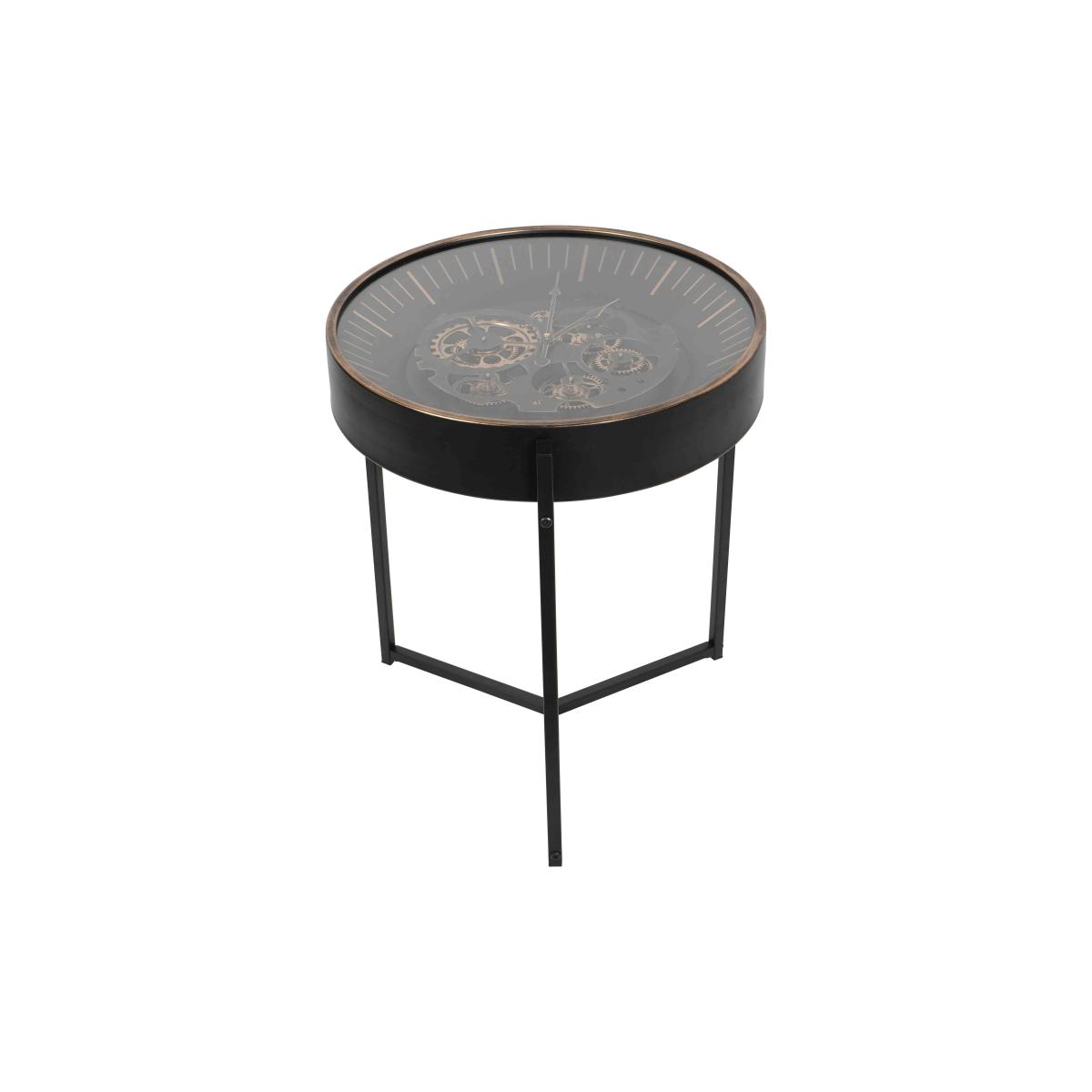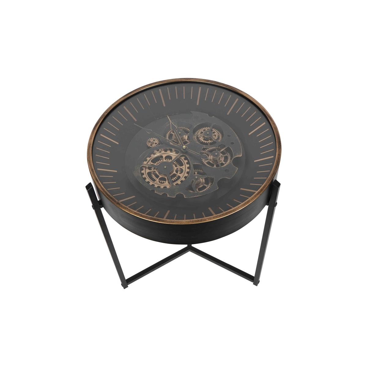 The Palladium side table combines chic style and sophisticated flair. Elevated by a moving mechanism, its minimalistic frame promises durability and aesthetic appeal. Why you'll love it Far from your standard piece of furniture. Its sleek design serves as both a clock and a stylish table. Mesmerising moving cogs captivate attention. A versatile addition to any home. Available in black and nickel or black and gold. What you need to know Made of metal. Requires 3 x AA batteries, not included. Batteries should be changed twice a year. For indoor use only. To clean, simply dust with a soft cloth. Dimensions Height: 57 cm (23 in). Width: 49 cm (20 in). Depth: 49 cm (20 in).