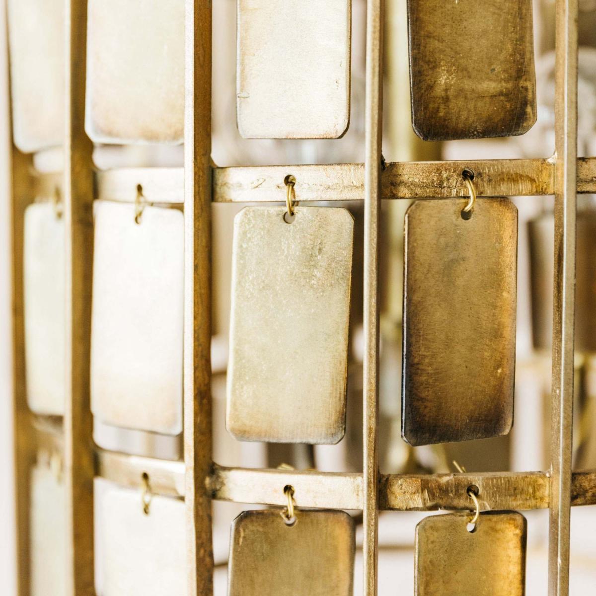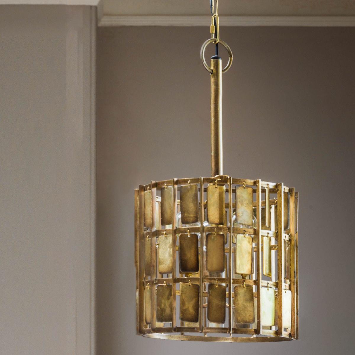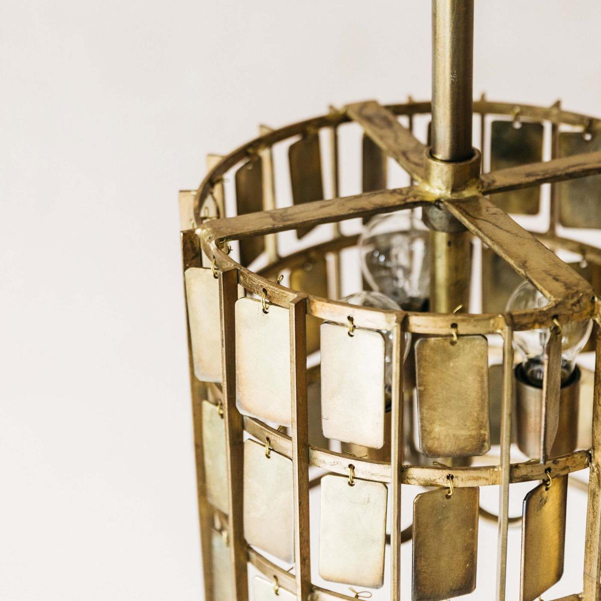 Handcrafted with an antiqued lacquered brass-plated finish, our Pallas pendant features rows of individual iron discs hung within a cylindrical frame. Features three separate bulbs for ample illumination in any room.