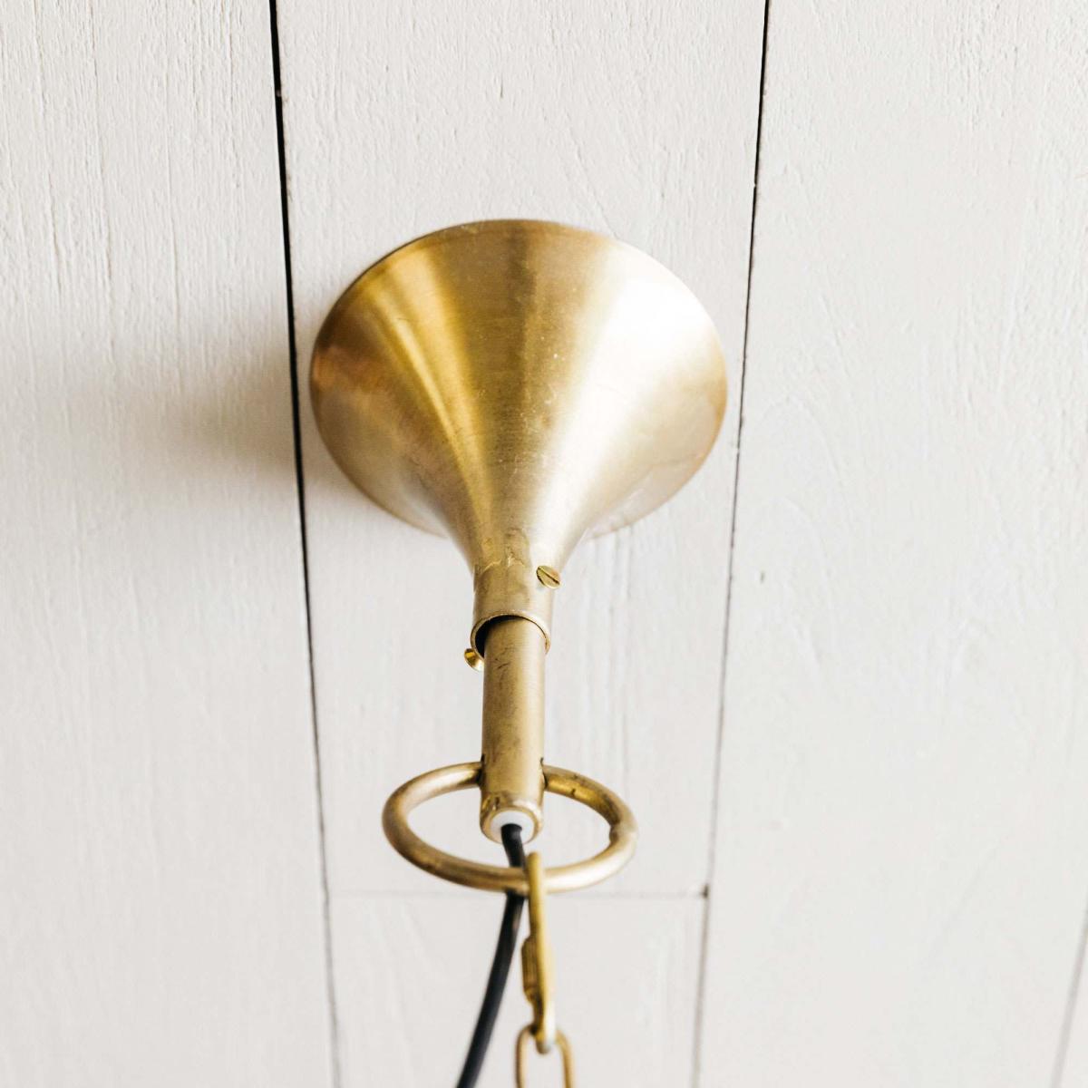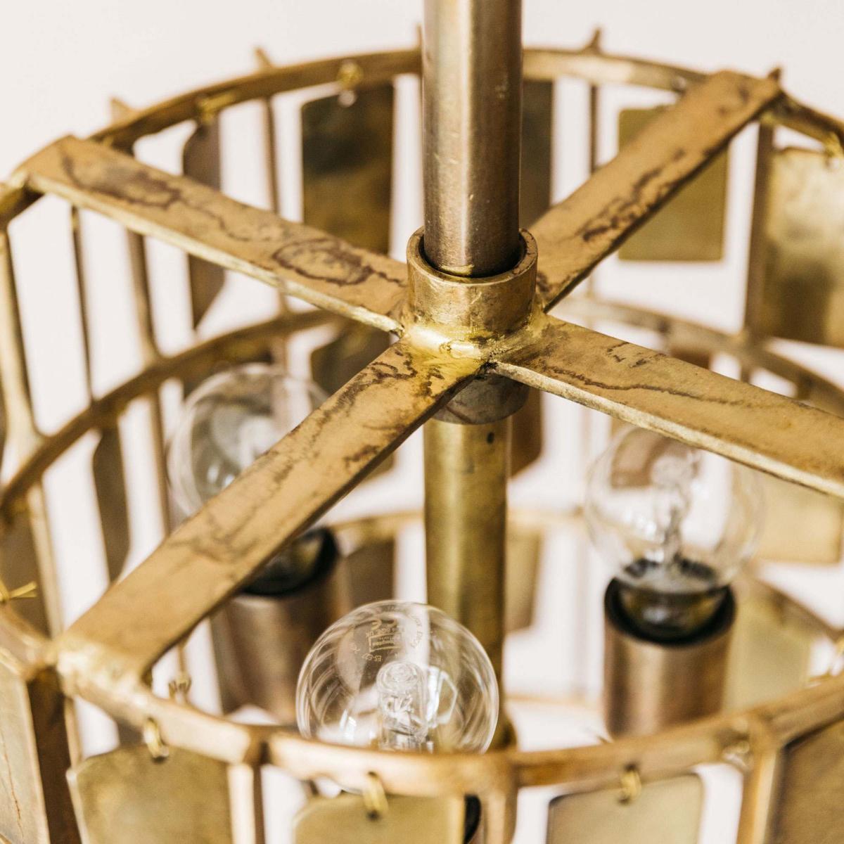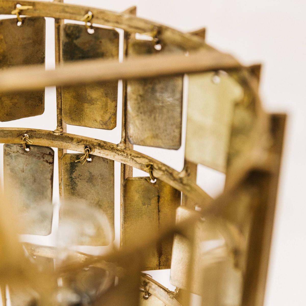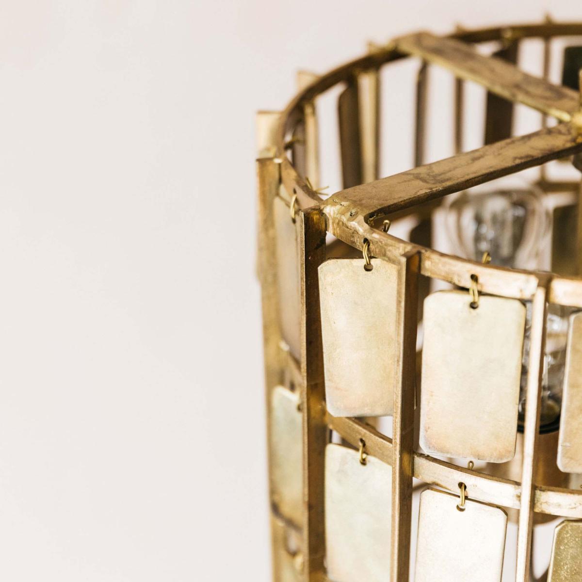 Handcrafted with an antiqued lacquered brass-plated finish, our Pallas pendant features rows of individual iron discs hung within a cylindrical frame. Features three separate bulbs for ample illumination in any room.