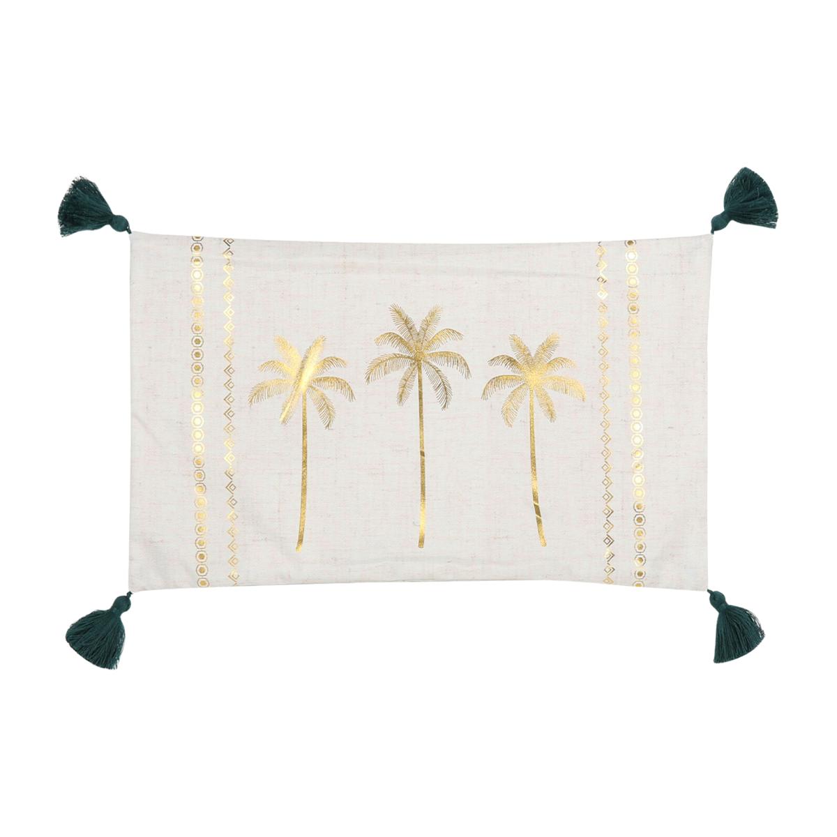 Add some exotic bohemian vibes to your garden or patio with this Palm Outdoor Cushion. Featuring a natural-coloured fabric with a gold metallic palm tree print, this cushion also has teal tassels for a pop of colour. This cushion brings comfort and style to your patio furniture.