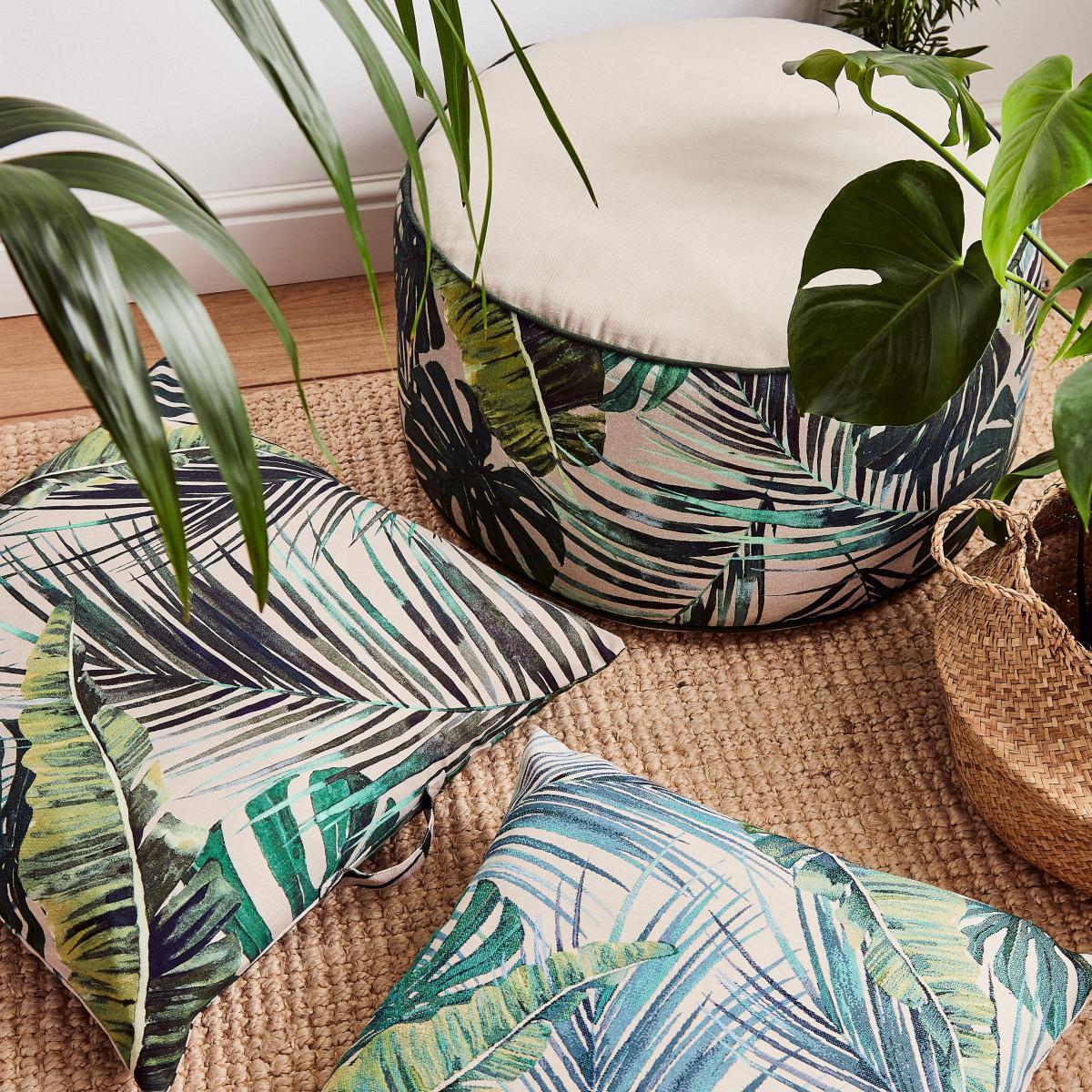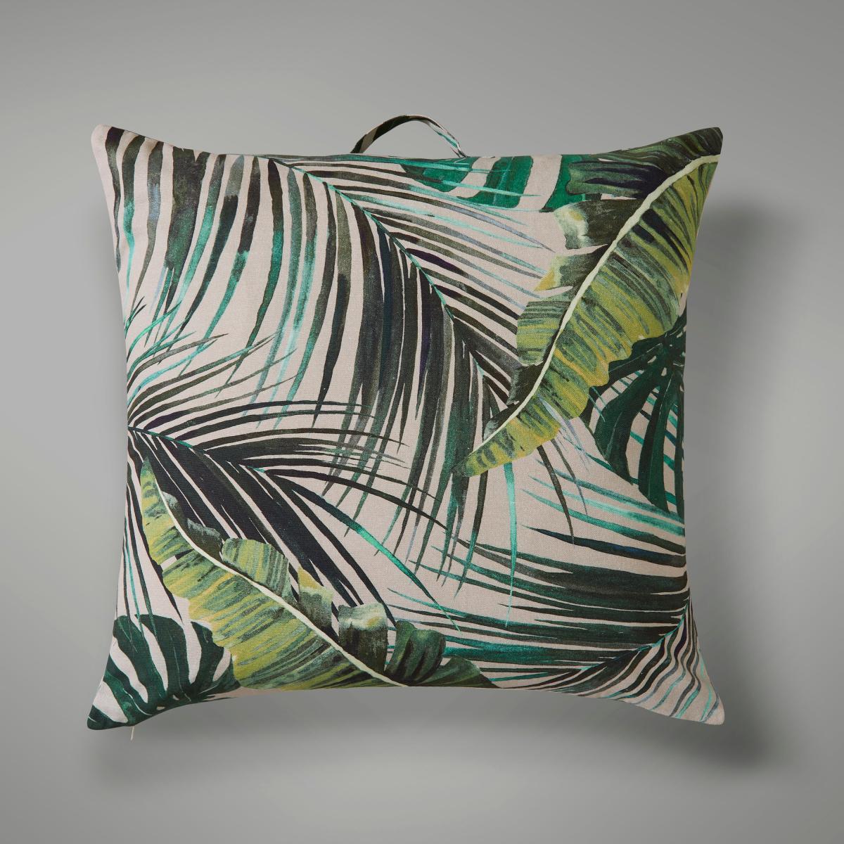 Exclusively online, our Palm Print Floor Cushion is a perfect way to bring the tropics into your home. Crafted from 100% cotton, the cover features a beautiful palm print design while encasing a comfortable polyester hollowfibre filling. The floor cushion is complete with handles to aid maneuvering and is fire resistant.