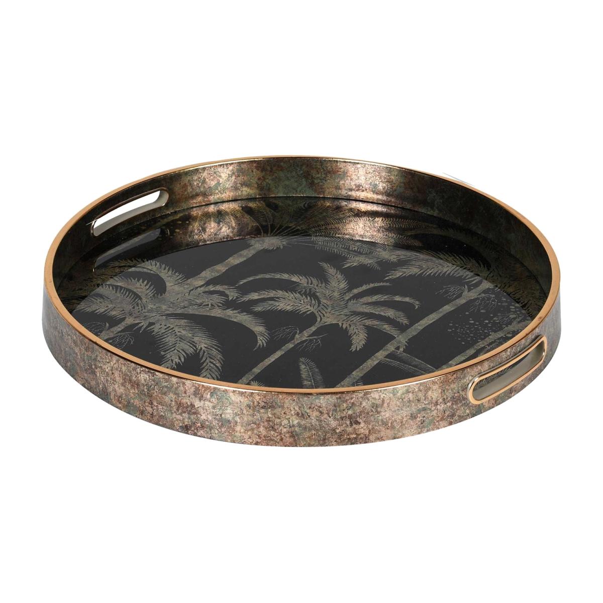 Serve your drinks witha touch of tropical elegance with the Metallic Palm Tree Tray. Embellished usingblack and goldwith the palm treedecorationon the base of the tray. Theperfectglamourousaccessory for your coffee table or party.