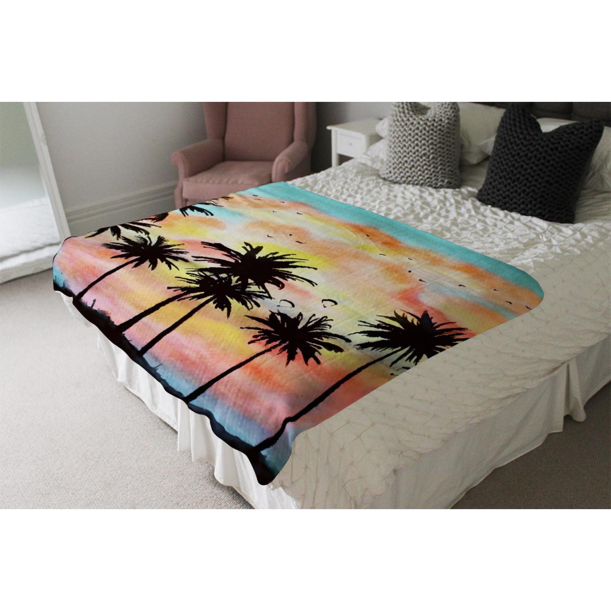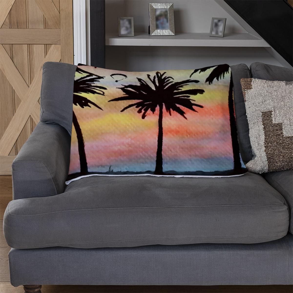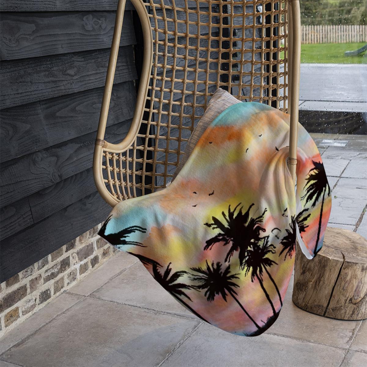 I love this throw for its vibrant, tropical vibe and versatile design. It works particularly well in relaxed, coastal or boho interiors, adding a splash of colour and an island-inspired touch. Practical styling tips include draping it casually over a sofa or armchair for a cosy, inviting look, or folding it neatly at the foot of a bed for a pop of pattern. The sunset and palm tree motif makes it ideal for creating a laid-back atmosphere, perfect for summer evenings or tropical-themed spaces. Pair it with natural rattan furniture or neutral-toned textiles to keep the look fresh and balanced.