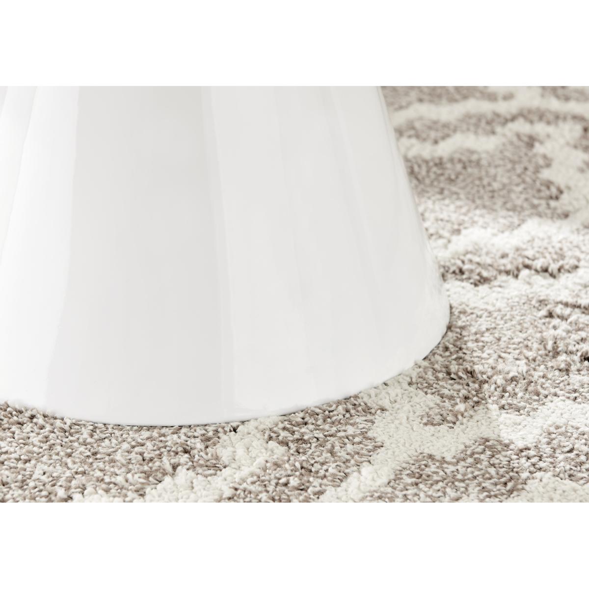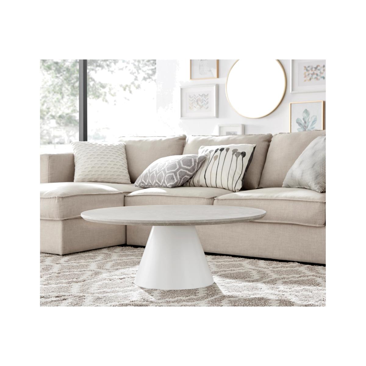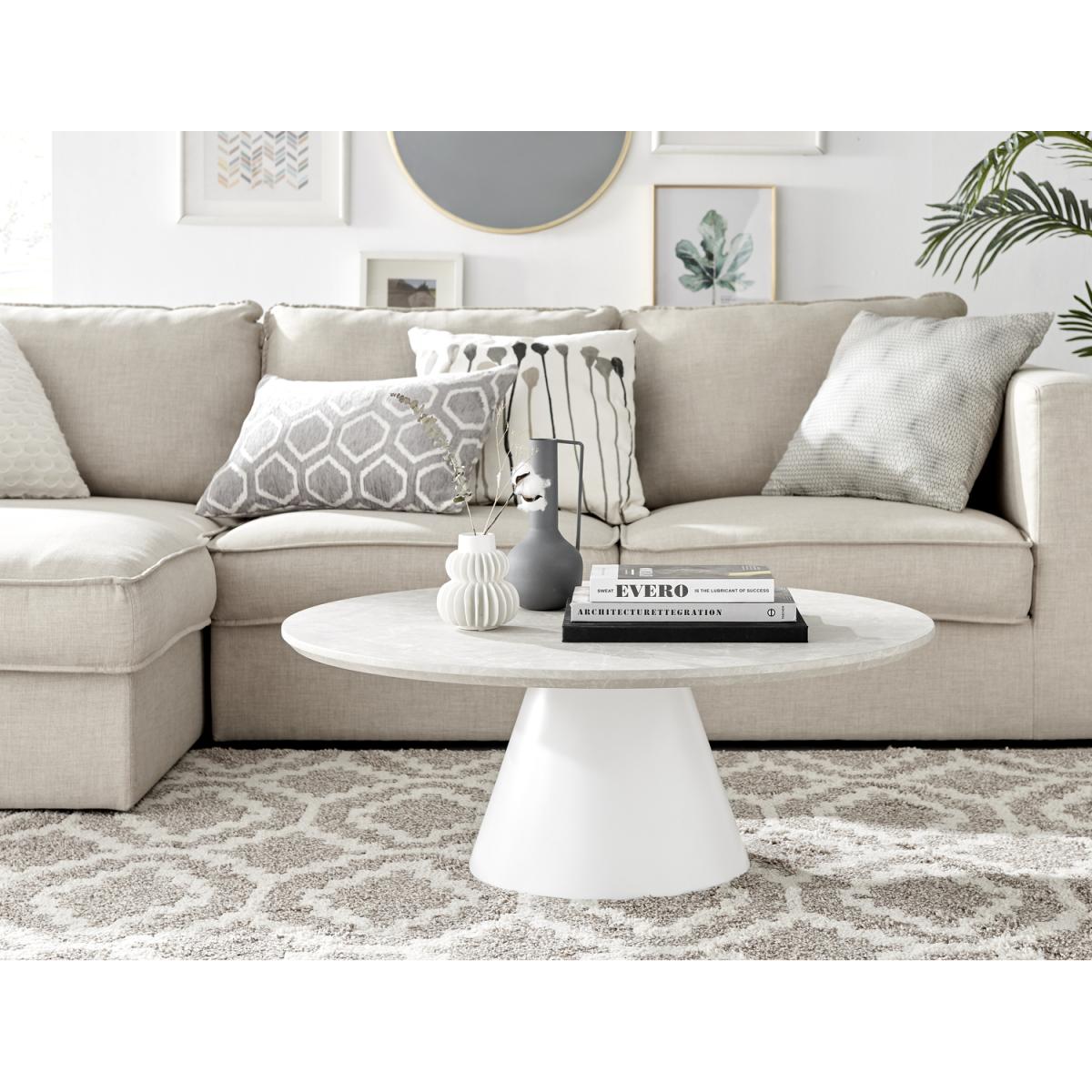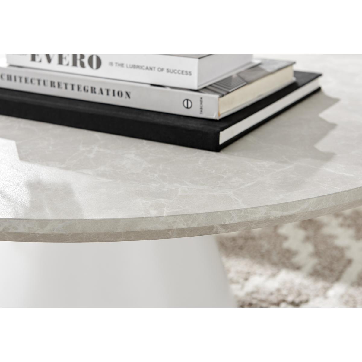 Our stunning Palma coffee table is a round coffee table with a large statement tapered central pillar. It's a minimalist post-modern dream! The perfect balance of round and straight lines an uncluttered and elegant coffee table solution that will be a real talking point in any modern living room. The elegant beige stone effect finish is very in right now, and is a firm favourite here. Elegant and modern with a touch of classical chic style. At 90cm x 90cm, there's plenty of room for all your living room storage needs, keeping things tidy and glam. Constructed from wood composite with a luxury veneer finish. This coffee table is easy to keep clean, durable and will stay gorgeous for years to come. Also available in other colours. Matching Palma dining tables available.