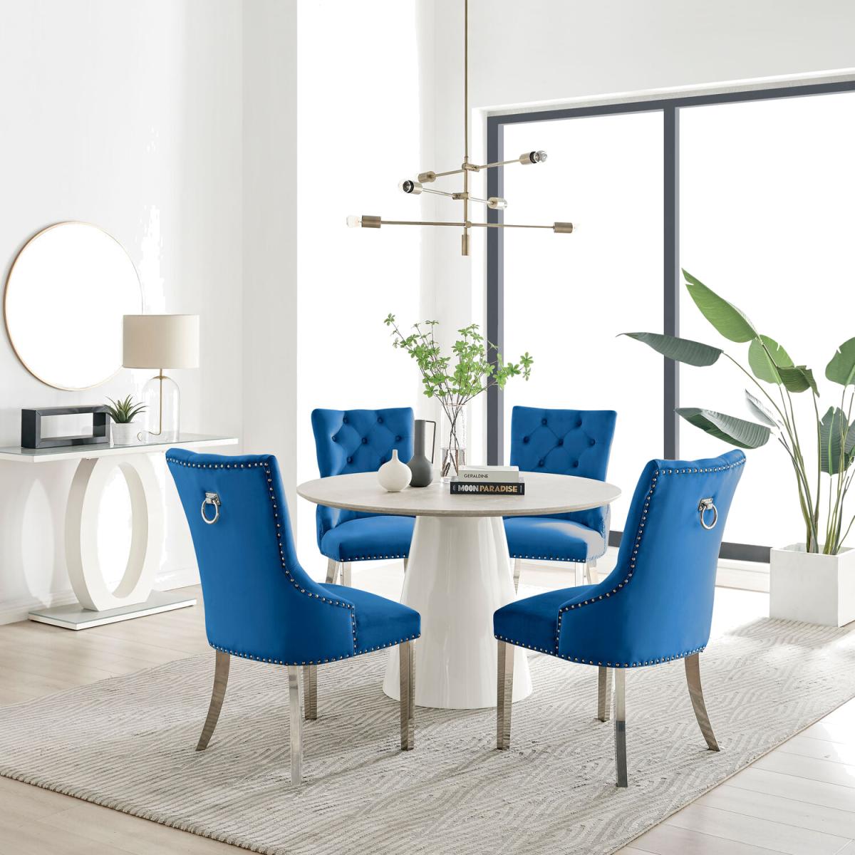 Our stunning Palma table with the stone-effect finish is a round dining table with a large statement tapered central pillar. It's a minimalist post-modern dream! The perfect balance of round and straight lines an uncluttered and elegant dining table solution that will be a real talking point in any modern dining room. The beige stone-effect top is very in right now, and is a firm favourite here at Furniturebox UK HQ. Elegant and modern with a touch of that classical chic style. Pair with some bold colours and metallic bursts in your chairs accessories to really make this pop, or keep it chic and simple with some understated tones. Comfortably sits 4 - 6, and is constructed from wood composite with a luxury stone-effect finish. This table is easy to keep clean, durable and will stay gorgeous for years to come. Also available in other colours and finishes. The Belgravia knocker chair is the ultimate in dining chair opulence with its scoop back design that allows you and your guests to lean back and feel supported by the wrap-around arms. Stylish Chesterfield-inspired button tufting and diamond stitching add to the modern chic look. The design gives us straight lines and soft padded curves contemporary and comfortable. The thick filled seat cushion is supportive and comfortable and is complemented by the silk velvet fabric. These ultra-modern chairs have subtle chrome button detailing along the trim of the seat and around the back of the chair which pairs beautifully with the chrome legs and knocker. The highlight of the Belgravia chair is the chrome knocker on the back of the chair which is a popular feature for both modern and traditional dining rooms. Anyone for a lovely dinner party or some cocktails sat in one of these! We're in love!Our stunning Palma table with the stone-effect finish is a round dining table with a large statement tapered central pillar. It's a minimalist post-modern dream! The perfect balance of round and straight lines an uncluttered and elegant dining table solution that will be a real talking point in any modern dining room.