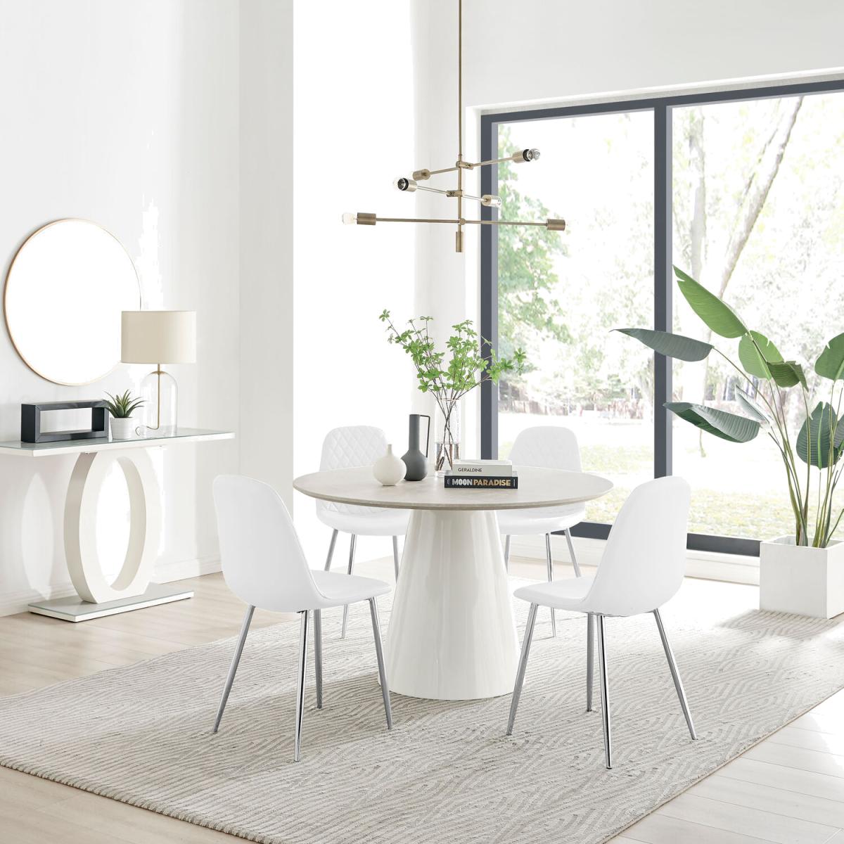 Our stunning Palma table with the stone-effect finish is a round dining table with a large statement tapered central pillar. It's a minimalist post-modern dream! The perfect balance of round and straight lines an uncluttered and elegant dining table solution that will be a real talking point in any modern dining room. The beige stone-effect top is very in right now, and is a firm favourite here at Furniturebox UK HQ. Elegant and modern with a touch of that classical chic style. Pair with some bold colours and metallic bursts in your chairs accessories to really make this pop, or keep it chic and simple with some understated tones. Comfortably sits 4 - 6, and is constructed from wood composite with a luxury stone-effect finish. This table is easy to keep clean, durable and will stay gorgeous for years to come. Also available in other colours and finishes. With a perfect balance of pattern and texture the new Corona Chair is a statement piece ready for the modern dining space. The trendy chrome legs are all the rage and offer a perfect way to add an accent of lustre to your home. The Scandi-style faux leather seat with diamond pattern stitching is a unique take on a classic design offering comfort and durability for everyday use.