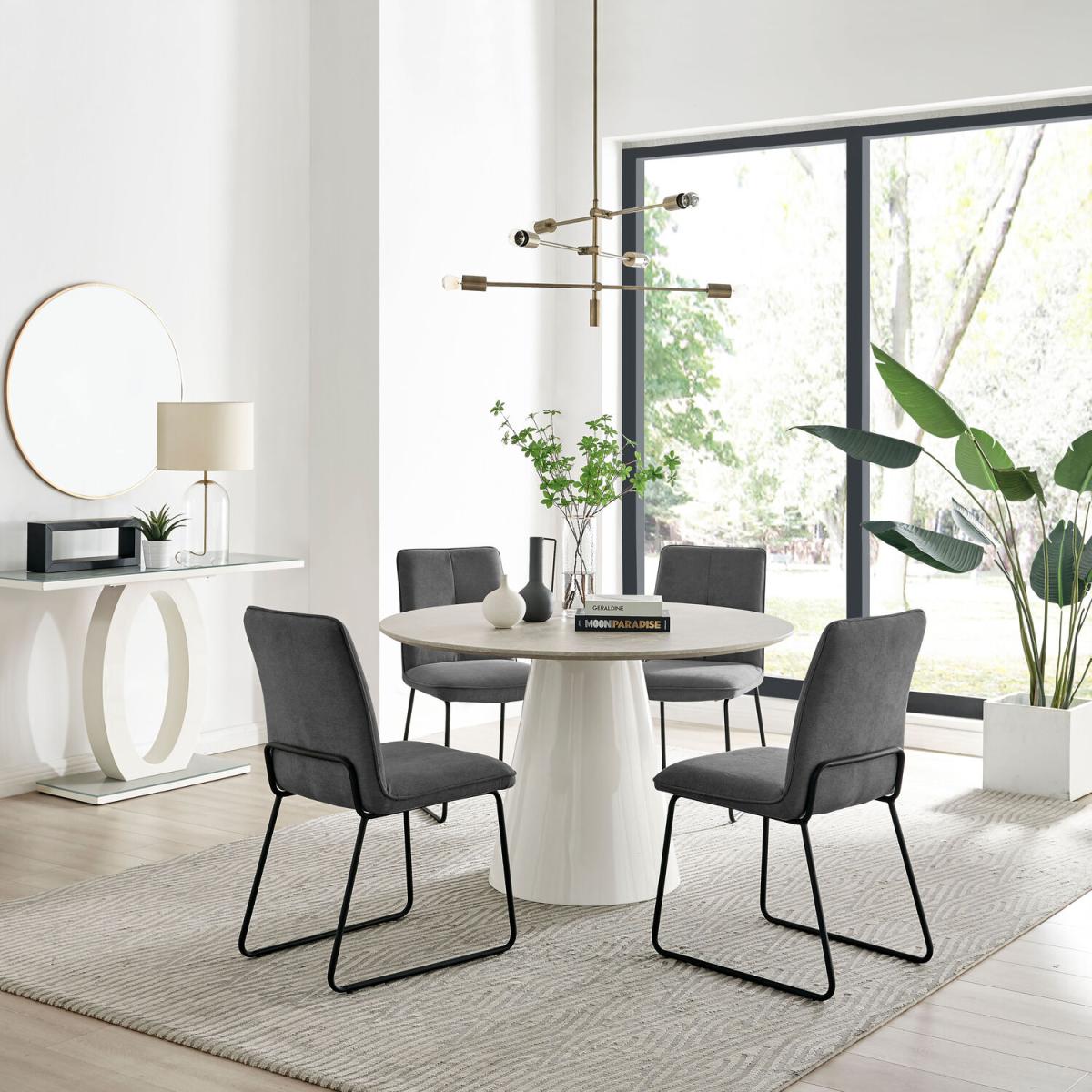 Our stunning Palma table with the stone-effect finish is a round dining table with a large statement tapered central pillar. It's a minimalist post-modern dream! The perfect balance of round and straight lines an uncluttered and elegant dining table solution that will be a real talking point in any modern dining room. The beige stone-effect top is very in right now, and is a firm favourite here at Furniturebox UK HQ. Elegant and modern with a touch of that classical chic style. Pair with some bold colours and metallic bursts in your chairs accessories to really make this pop, or keep it chic and simple with some understated tones. Comfortably sits 4 - 6, and is constructed from wood composite with a luxury stone-effect finish. This table is easy to keep clean, durable and will stay gorgeous for years to come. Also available in other colours and finishes. The Halle chair is a super-stylish design with nods to postmodern mid-century classic elements. The clean lines of the deep-padded seat and on-trend industrial metal legs connected front and back with open diamond spaces will keep your dining or living room looking chic and classy. These modern dining chairs are upholstered in a dark grey fabric to add depth and texture to the design. The black powder coated metal legs have a matte effect which adds an industrial design to these contemporary dining chairs.