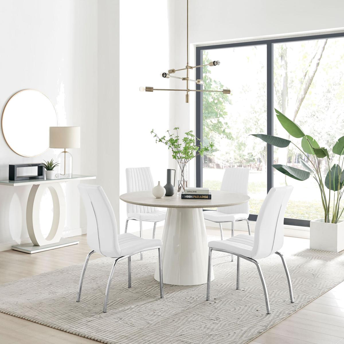 Our stunning Palma table with the stone-effect finish is a round dining table with a large statement tapered central pillar. It's a minimalist post-modern dream! The perfect balance of round and straight lines an uncluttered and elegant dining table solution that will be a real talking point in any modern dining room. The beige stone-effect top is very in right now, and is a firm favourite here at Furniturebox UK HQ. Elegant and modern with a touch of that classical chic style. Pair with some bold colours and metallic bursts in your chairs accessories to really make this pop, or keep it chic and simple with some understated tones. Comfortably sits 4 - 6, and is constructed from wood composite with a luxury stone-effect finish. This table is easy to keep clean, durable and will stay gorgeous for years to come. Also available in other colours and finishes. Clean lines combine with comfort and texture to make the Isco chair the ideal choice in understated style, the perfect partner for any design of table. The soft touch faux leather seat pads are interspaced with vertical stitching and are designed for comfort with the added bonus of looking great. Value for money with style combine to make an unbeatable package!
