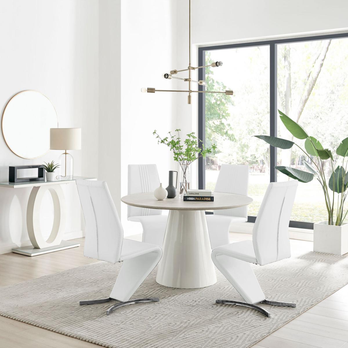 Our stunning Palma table with the stone-effect finish is a round dining table with a large statement tapered central pillar. It's a minimalist post-modern dream! The perfect balance of round and straight lines an uncluttered and elegant dining table solution that will be a real talking point in any modern dining room. The beige stone-effect top is very in right now, and is a firm favourite here at Furniturebox UK HQ. Elegant and modern with a touch of that classical chic style. Pair with some bold colours and metallic bursts in your chairs accessories to really make this pop, or keep it chic and simple with some understated tones. Comfortably sits 4 - 6, and is constructed from wood composite with a luxury stone-effect finish. This table is easy to keep clean, durable and will stay gorgeous for years to come. Also available in other colours and finishes. The Willow is a premium modern chair that ticks all the boxes. They are comfortable, look incredible and don't cost a bomb. These eye-catching chairs are fully padded throughout and have an ergonomically designed back support to maximise comfort. They also feature half-moon chromed feet, which give these chairs a sturdy base. The curved design gives the Willow chair a contemporary elegance that would complement any modern dining area.