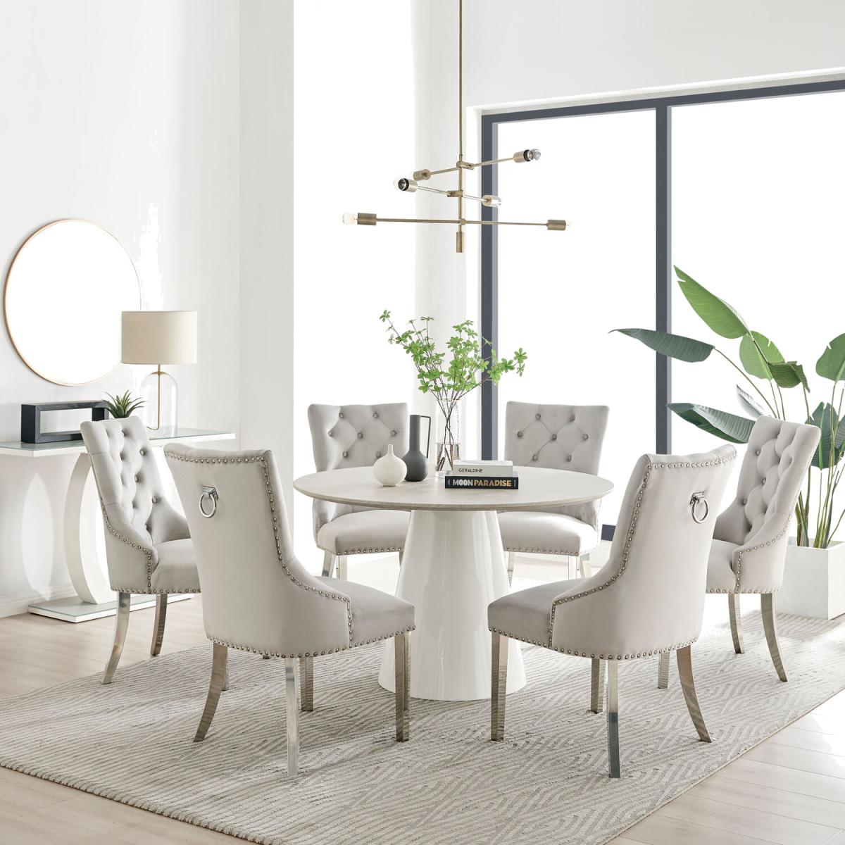 Our stunning Palma table with the stone-effect finish is a round dining table with a large statement tapered central pillar. It's a minimalist post-modern dream! The perfect balance of round and straight lines an uncluttered and elegant dining table solution that will be a real talking point in any modern dining room. The beige stone-effect top is very in right now, and is a firm favourite here at Furniturebox UK HQ. Elegant and modern with a touch of that classical chic style. Pair with some bold colours and metallic bursts in your chairs accessories to really make this pop, or keep it chic and simple with some understated tones. Comfortably sits 4 - 6, and is constructed from wood composite with a luxury stone-effect finish. This table is easy to keep clean, durable and will stay gorgeous for years to come. Also available in other colours and finishes. The Belgravia knocker chair is the ultimate in dining chair opulence with its scoop back design that allows you and your guests to lean back and feel supported by the wrap-around arms. Stylish Chesterfield-inspired button tufting and diamond stitching add to the modern chic look. The design gives us straight lines and soft padded curves contemporary and comfortable. The thick filled seat cushion is supportive and comfortable and is complemented by the silk velvet fabric. These ultra-modern chairs have subtle chrome button detailing along the trim of the seat and around the back of the chair which pairs beautifully with the chrome legs and knocker. The highlight of the Belgravia chair is the chrome knocker on the back of the chair which is a popular feature for both modern and traditional dining rooms. Anyone for a lovely dinner party or some cocktails sat in one of these! We're in love!Our stunning Palma table with the stone-effect finish is a round dining table with a large statement tapered central pillar. It's a minimalist post-modern dream! The perfect balance of round and straight lines an uncluttered and elegant dining table solution that will be a real talking point in any modern dining room.