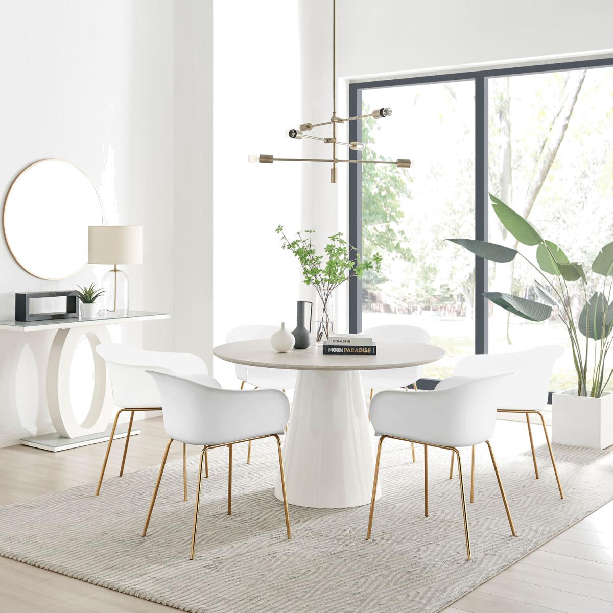 Our stunning Palma table with the stone-effect finish is a round dining table with a large statement tapered central pillar. It's a minimalist post-modern dream! The perfect balance of round and straight lines an uncluttered and elegant dining table solution that will be a real talking point in any modern dining room. The beige stone-effect top is very in right now, and is a firm favourite here at Furniturebox UK HQ. Elegant and modern with a touch of that classical chic style. Pair with some bold colours and metallic bursts in your chairs accessories to really make this pop, or keep it chic and simple with some understated tones. Comfortably sits 4 - 6, and is constructed from wood composite with a luxury stone-effect finish. This table is easy to keep clean, durable and will stay gorgeous for years to come. Also available in other colours and finishes. Our Harper dining chair in white is the perfect blend of elegance and minimalist design. A modern low back and wide seat with gentle curve for relaxed dining without compromising on style. This design is inspired by organic natural shapes and ticks all the dining room trend boxes we've been seeing emerging from Italy. The clean white seat and gold legs make for a striking combination and hits those Scandi meets Industrial-Chic notes. The Harper will look great with a range of table styles and finishes from wood to sleek glass, making it really versatile too! Sturdy pre-formed plastic seat with strong but slimline powder coated shiny gold metal legs. Available in a range of other colours and also with matte black metal legs, so check out the full Harper range.