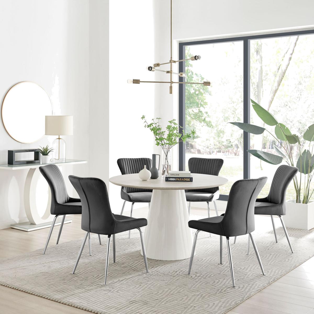 Our stunning Palma table with the stone-effect finish is a round dining table with a large statement tapered central pillar. It's a minimalist post-modern dream! The perfect balance of round and straight lines an uncluttered and elegant dining table solution that will be a real talking point in any modern dining room. The beige stone-effect top is very in right now, and is a firm favourite here at Furniturebox UK HQ. Elegant and modern with a touch of that classical chic style. Pair with some bold colours and metallic bursts in your chairs accessories to really make this pop, or keep it chic and simple with some understated tones. Comfortably sits 4 - 6, and is constructed from wood composite with a luxury stone-effect finish. This table is easy to keep clean, durable and will stay gorgeous for years to come. Also available in other colours and finishes. The Nora chair is a super-stylish modern chair with a nod to the classic wingback design. The elegant vertical piping stitching to the back and ergonomically designed seat sat on 4 slightly tapered legs make this uncluttered, classy and comfortable. The dark grey velvet fabric of this dining chair is smooth and silky, complimenting this dining chair design perfectly. For an ultra modern touch on your dining set, choose this silver chrome leg design which beautifully compliments the rest of the dining chair design.